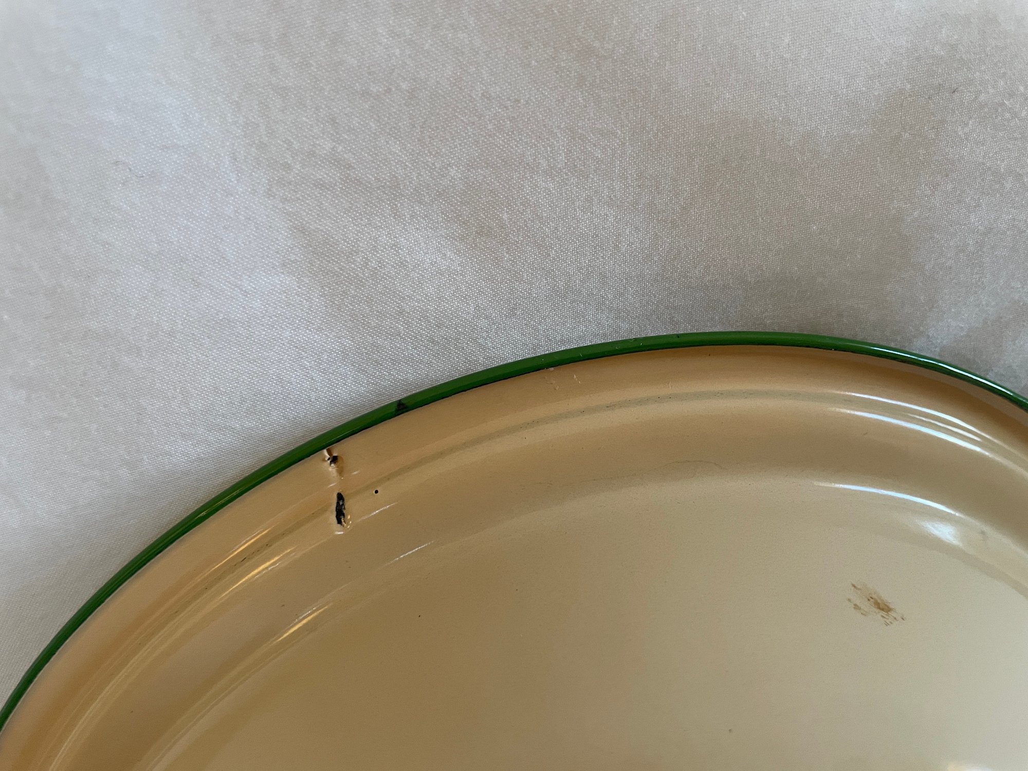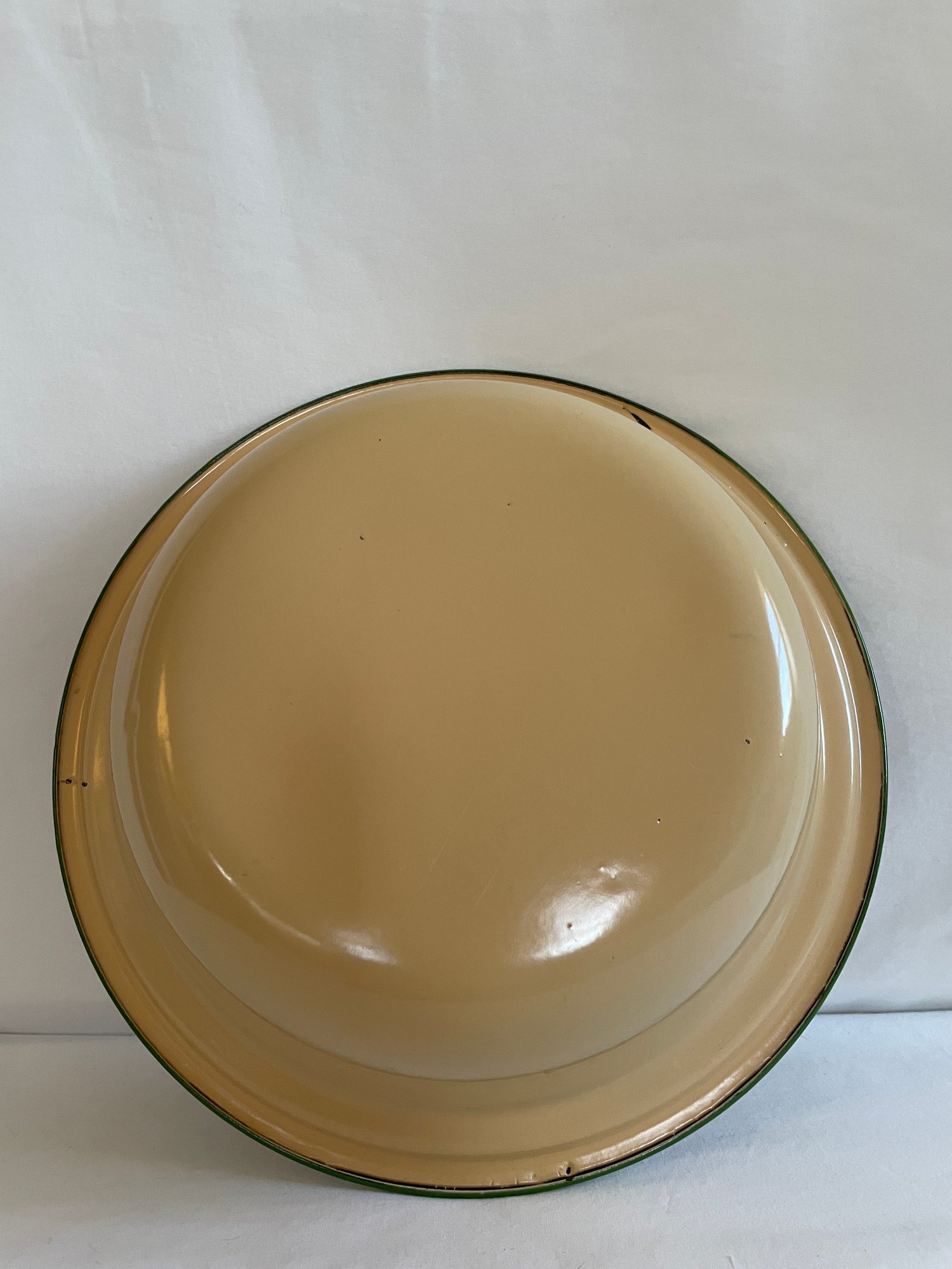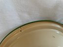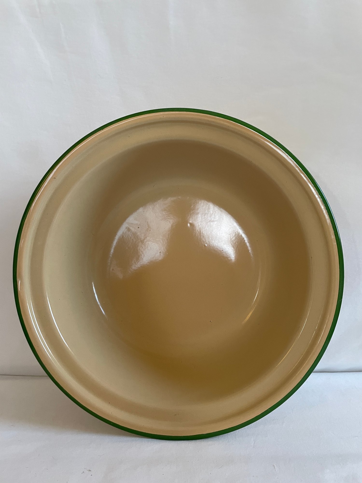 Tan bowl with green rim 10 1/2” diameter x 3” tall