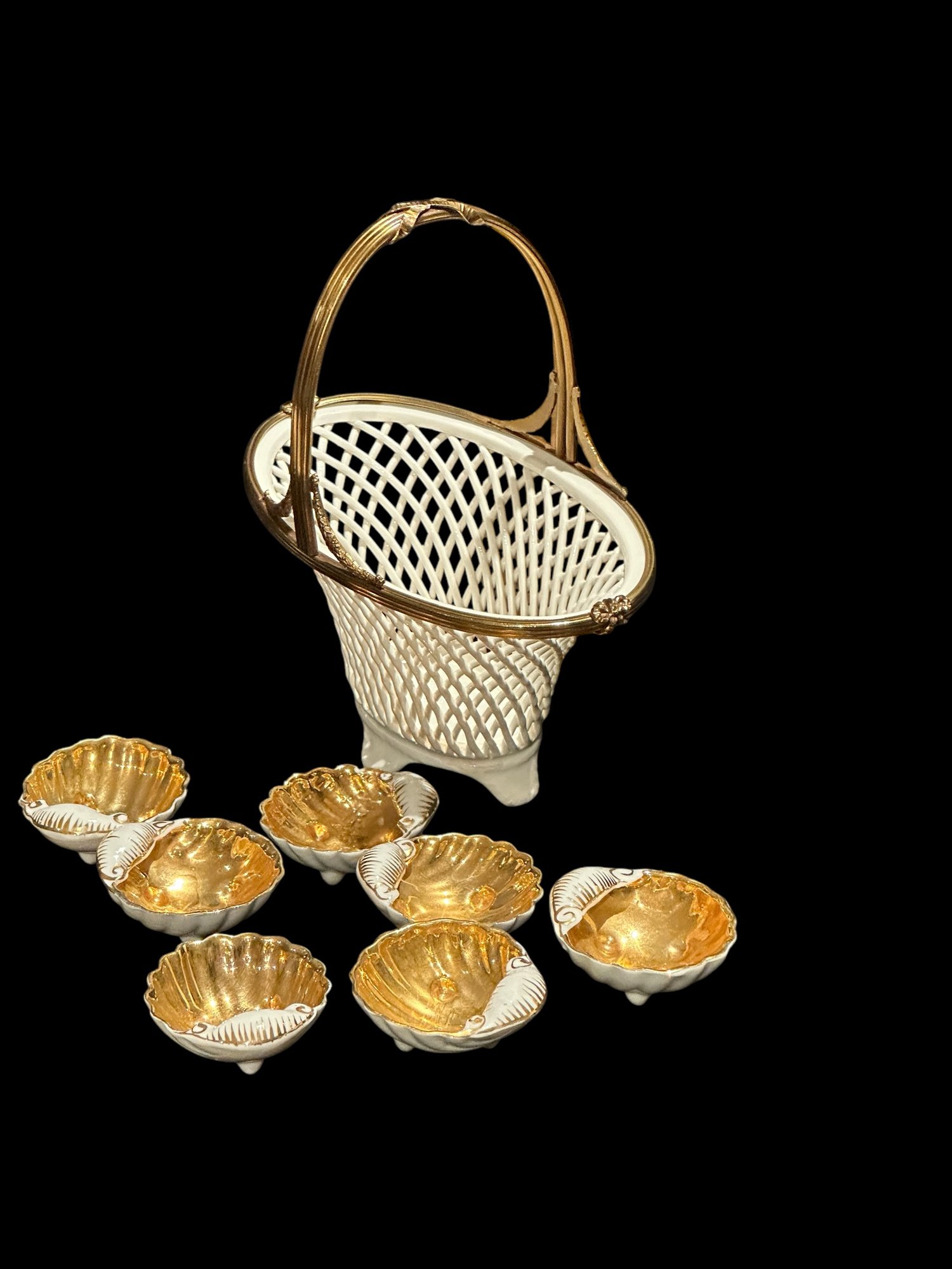 Porcelain Basket W Metal Trim And 7 Shell Salt Wells