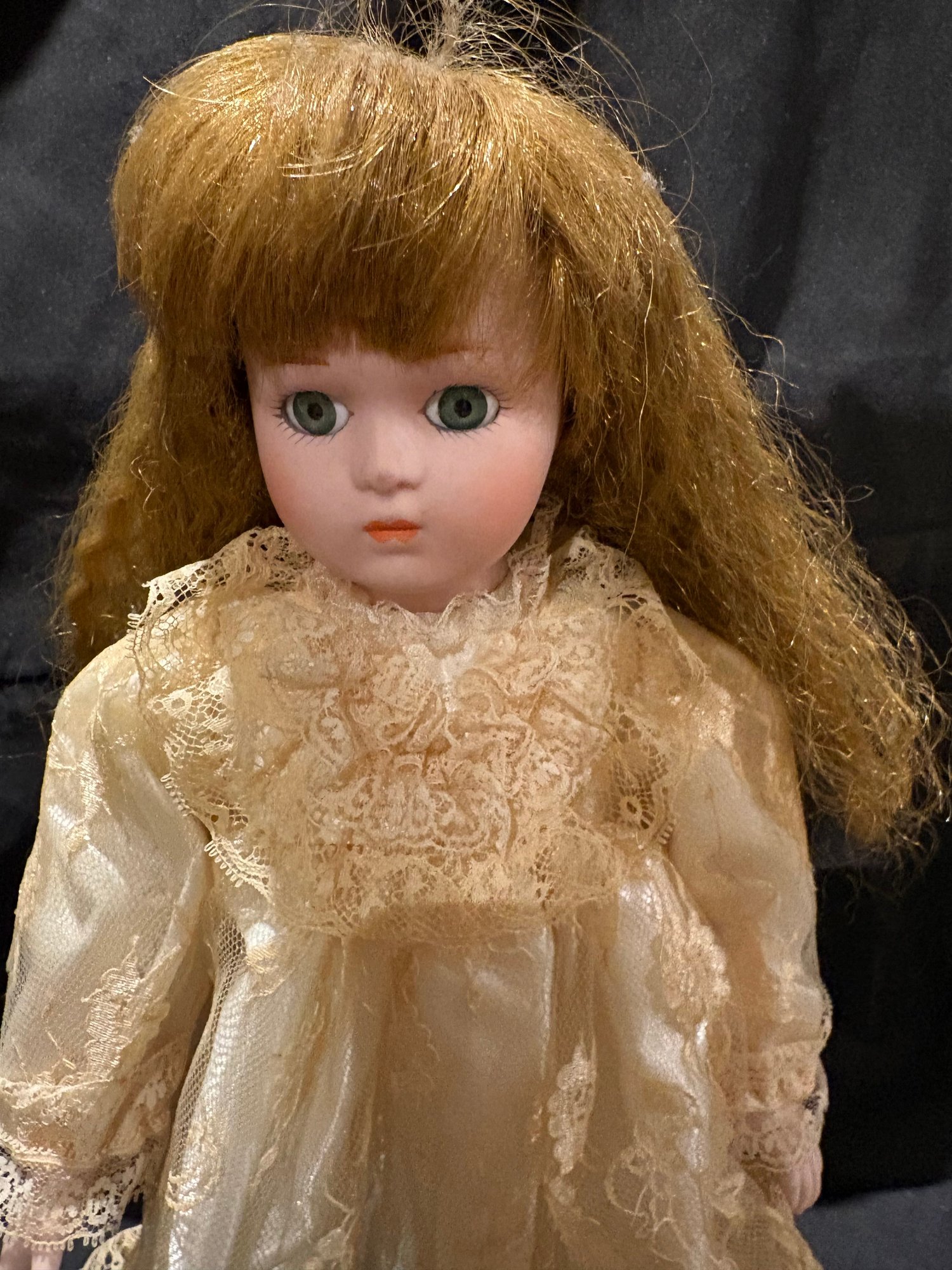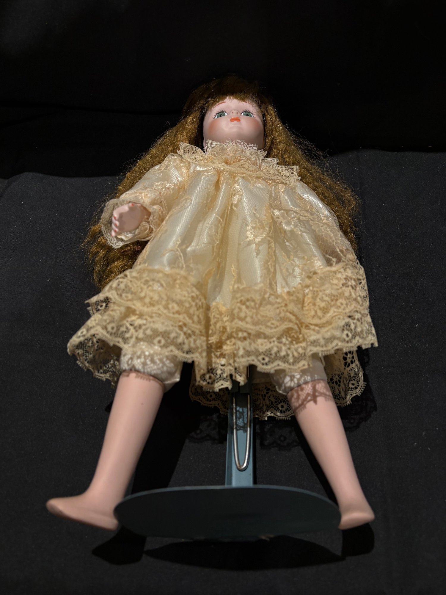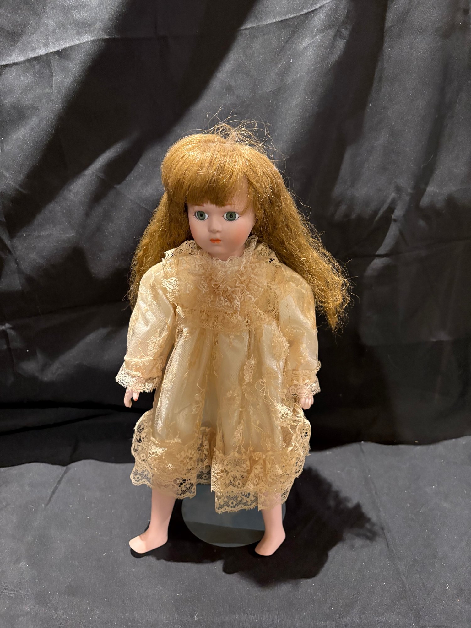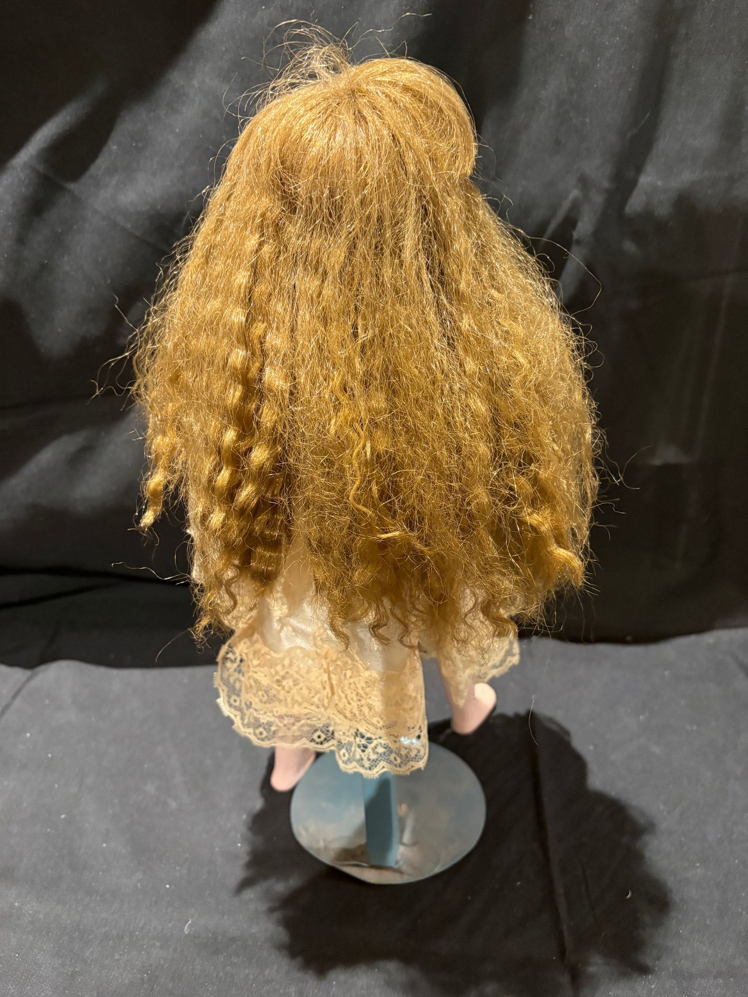 This is a Heritage Mint Ltd. Collection "Megan" D-33 porcelain doll, a vintage collectible from around 1989.