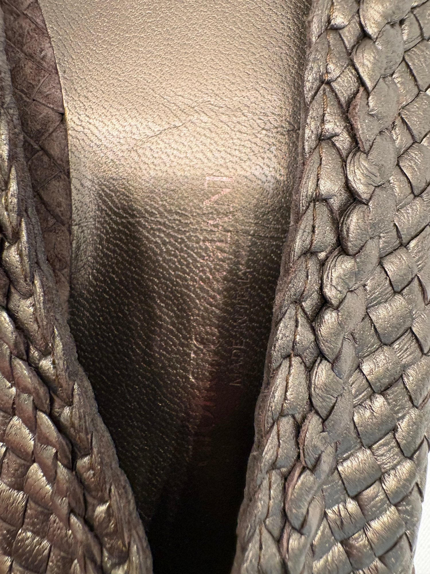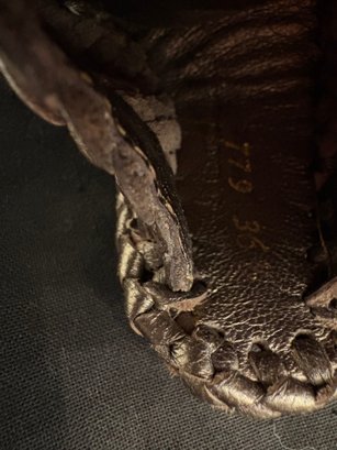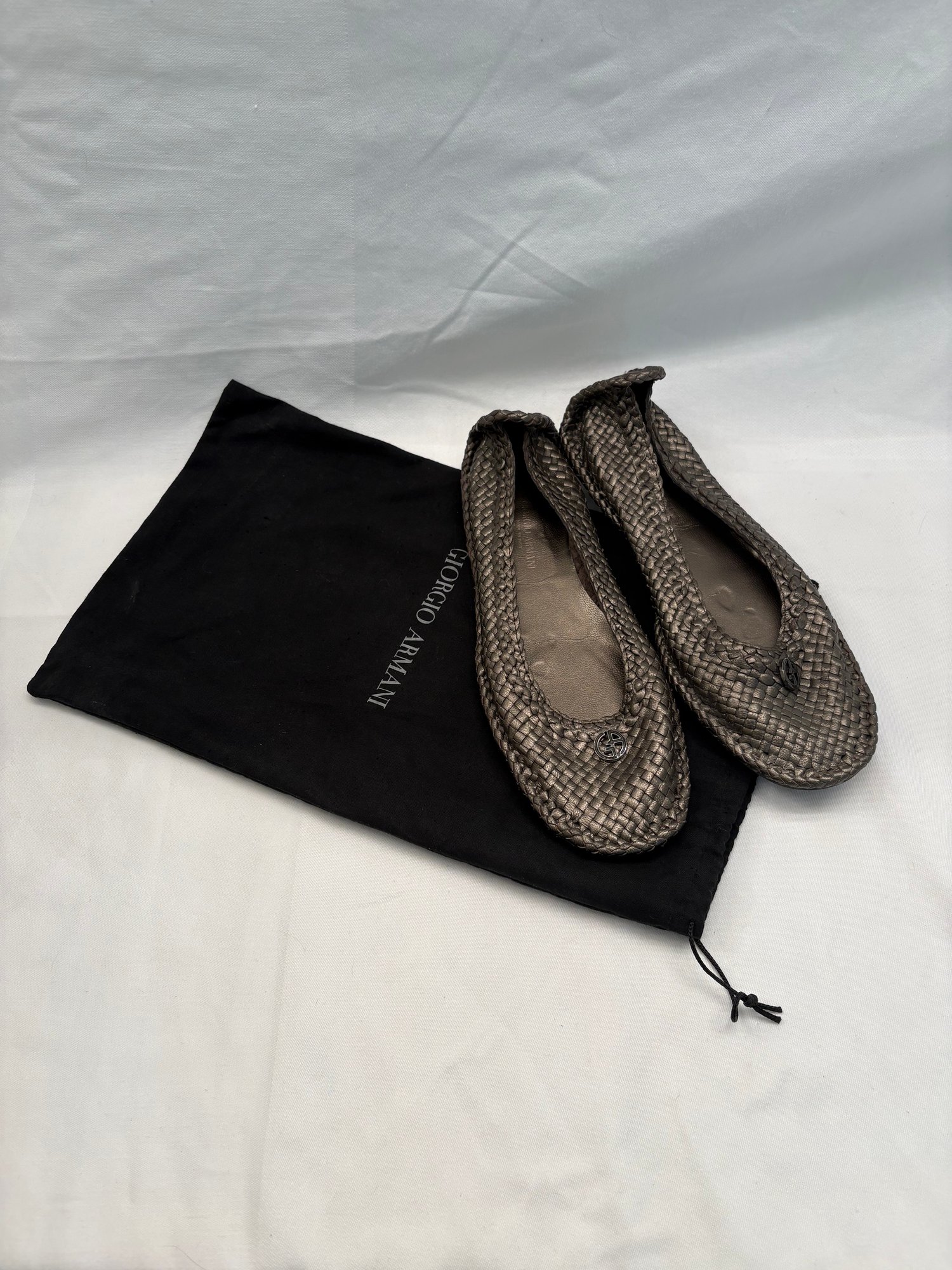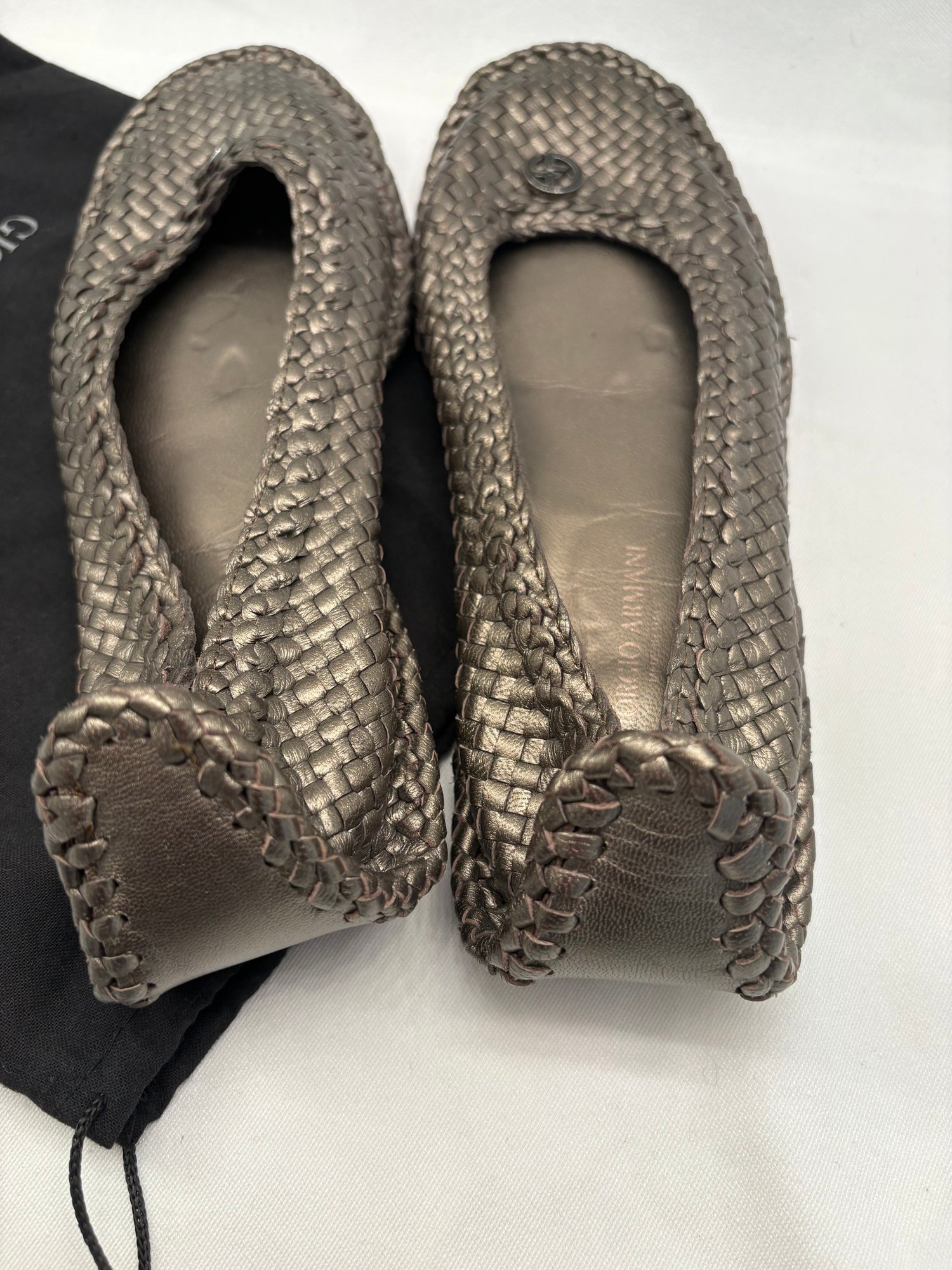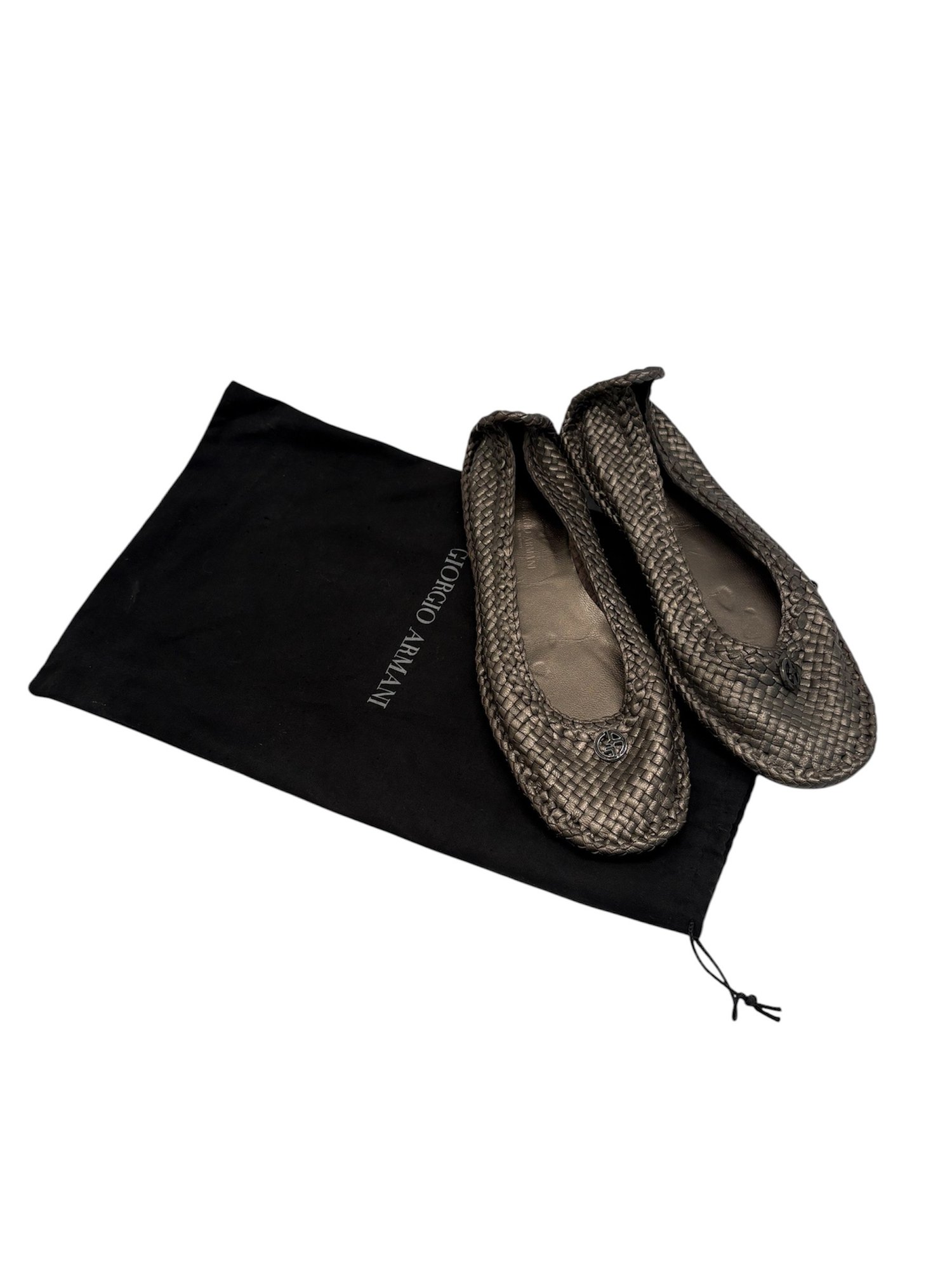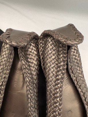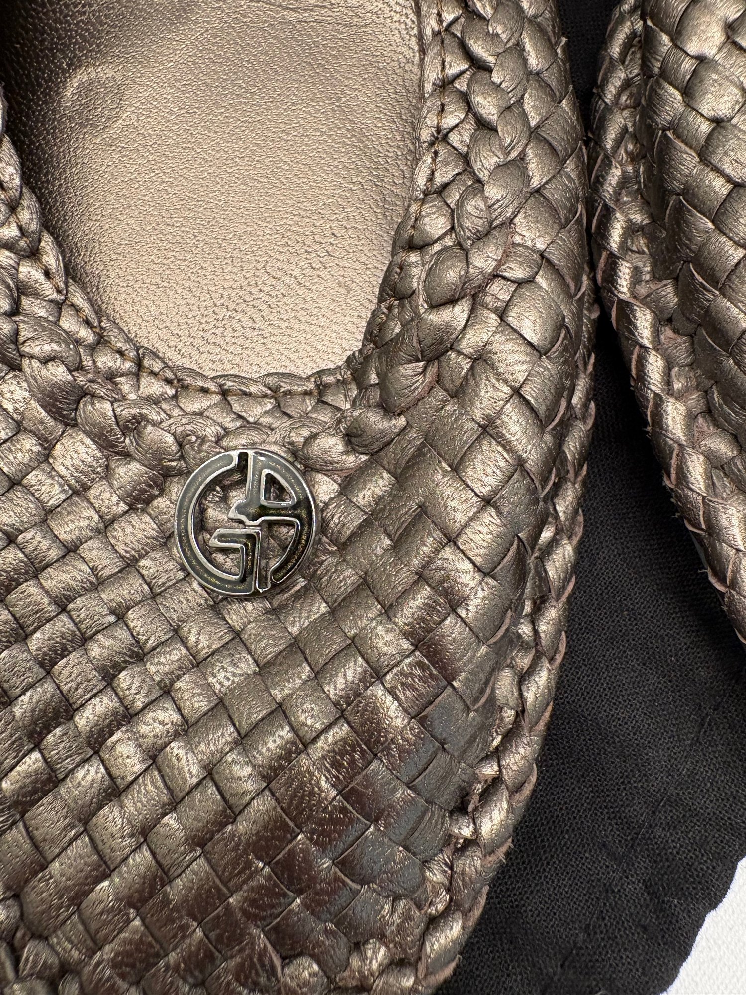 shoes are characterized by their intricate metallic woven leather design and classic rounded-toe silhouette.