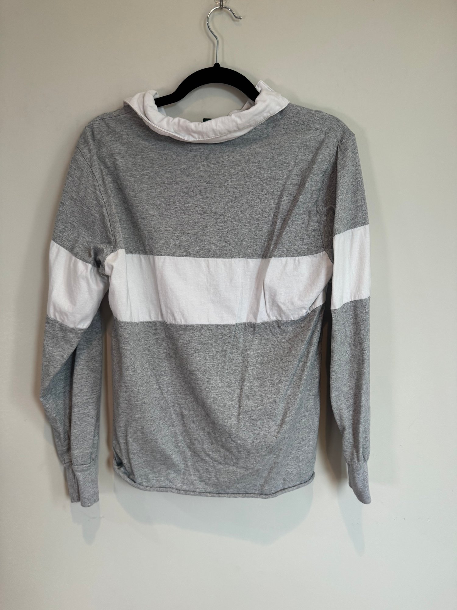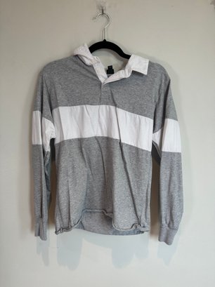 Style: Collared, gray and white striped long sleeve shirt