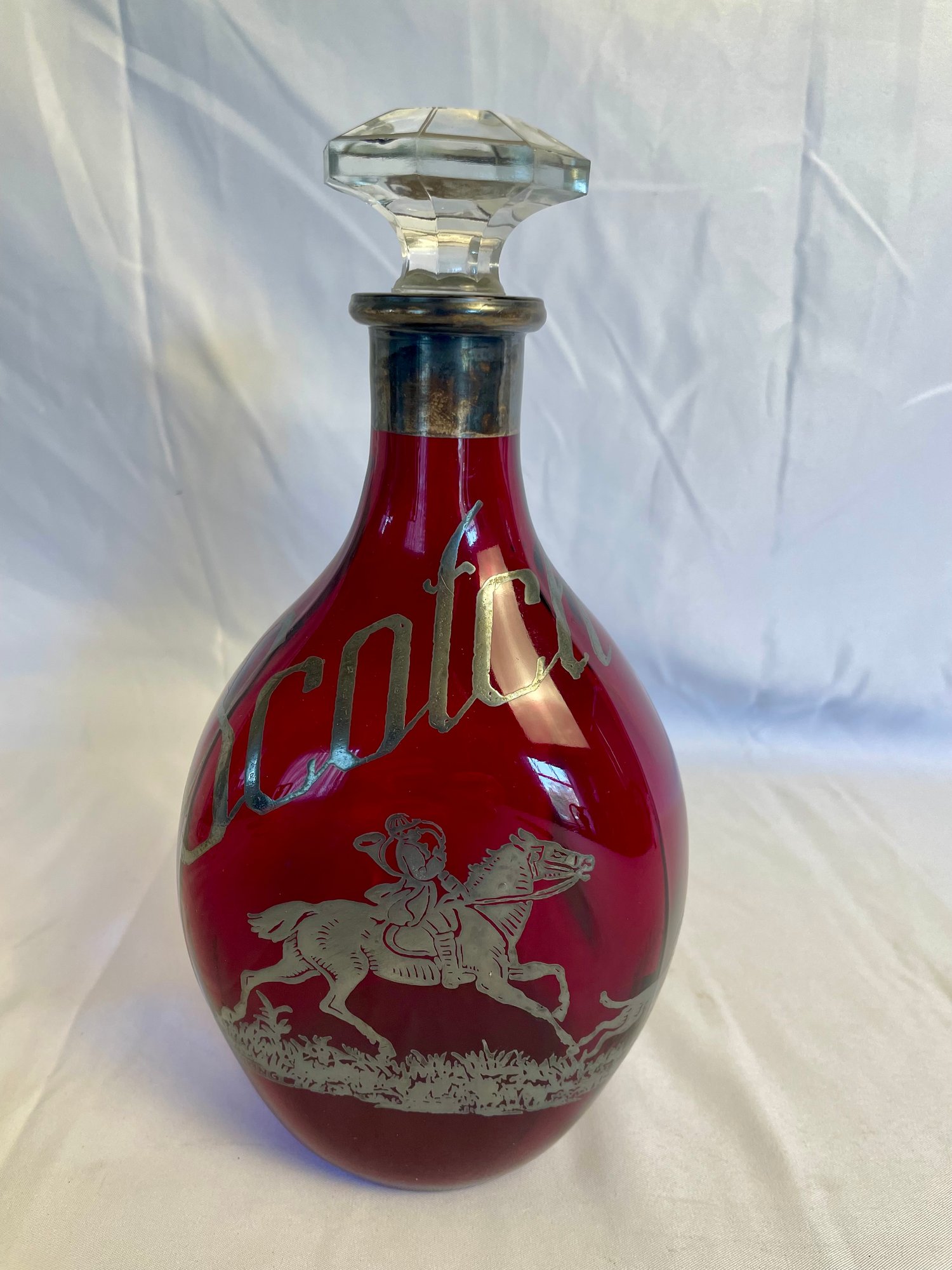 Decorative red glass scotch decanter with sterling silver design 9” x 4 1/2”