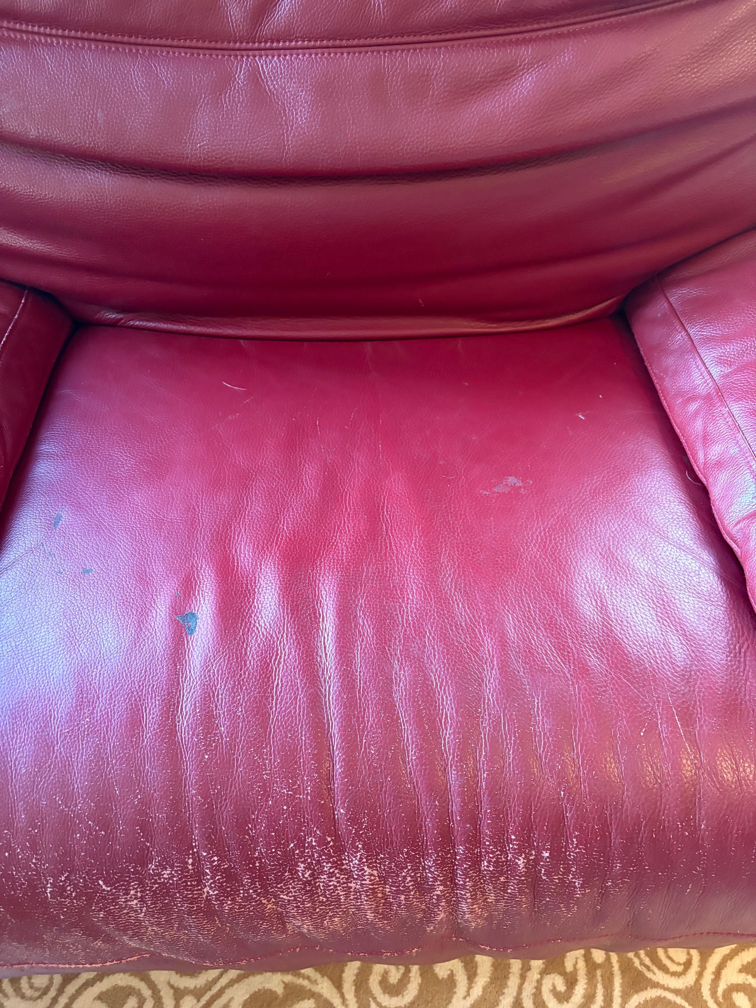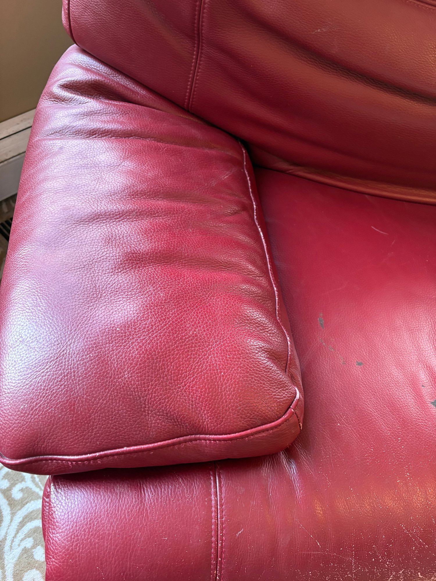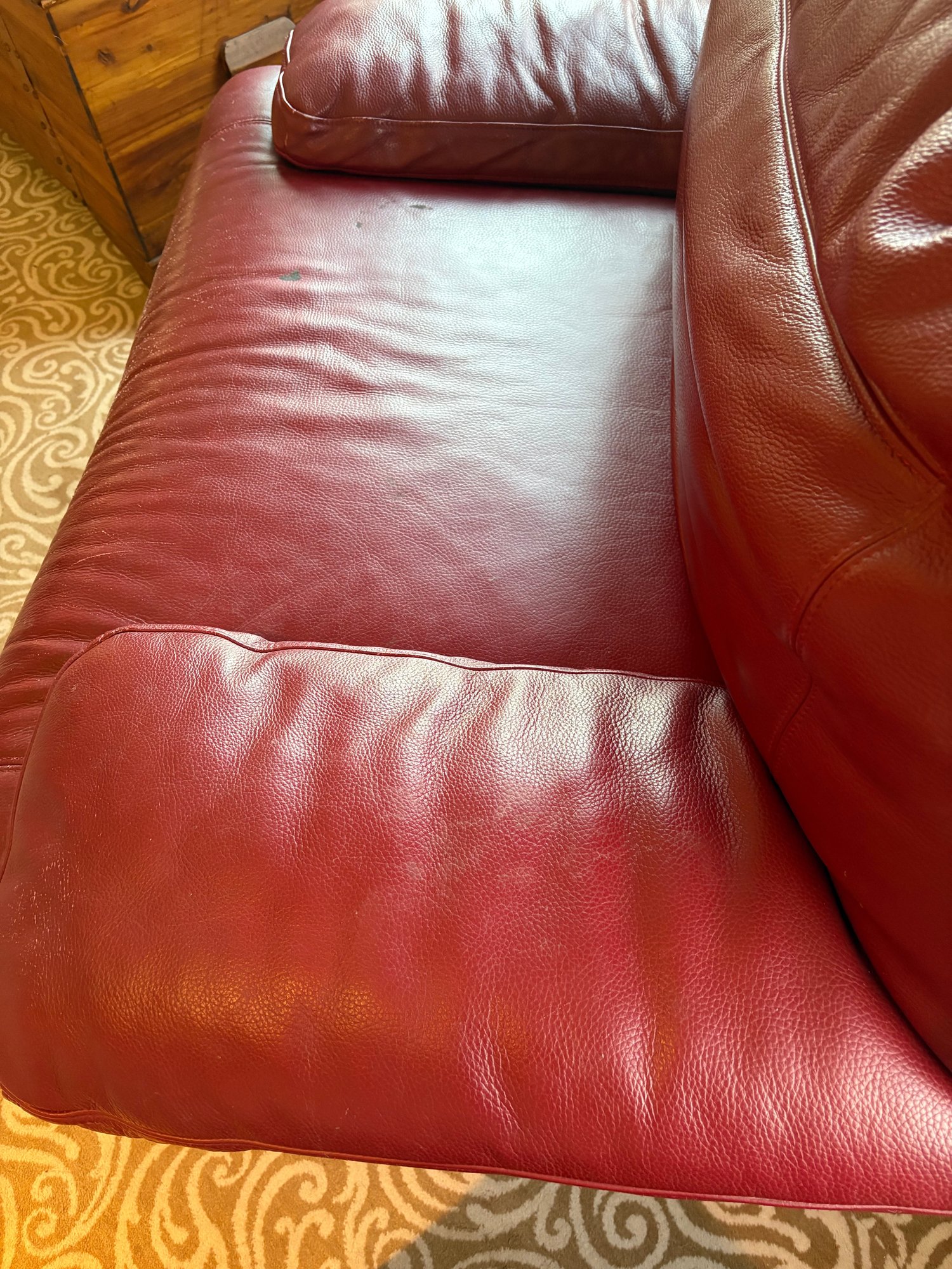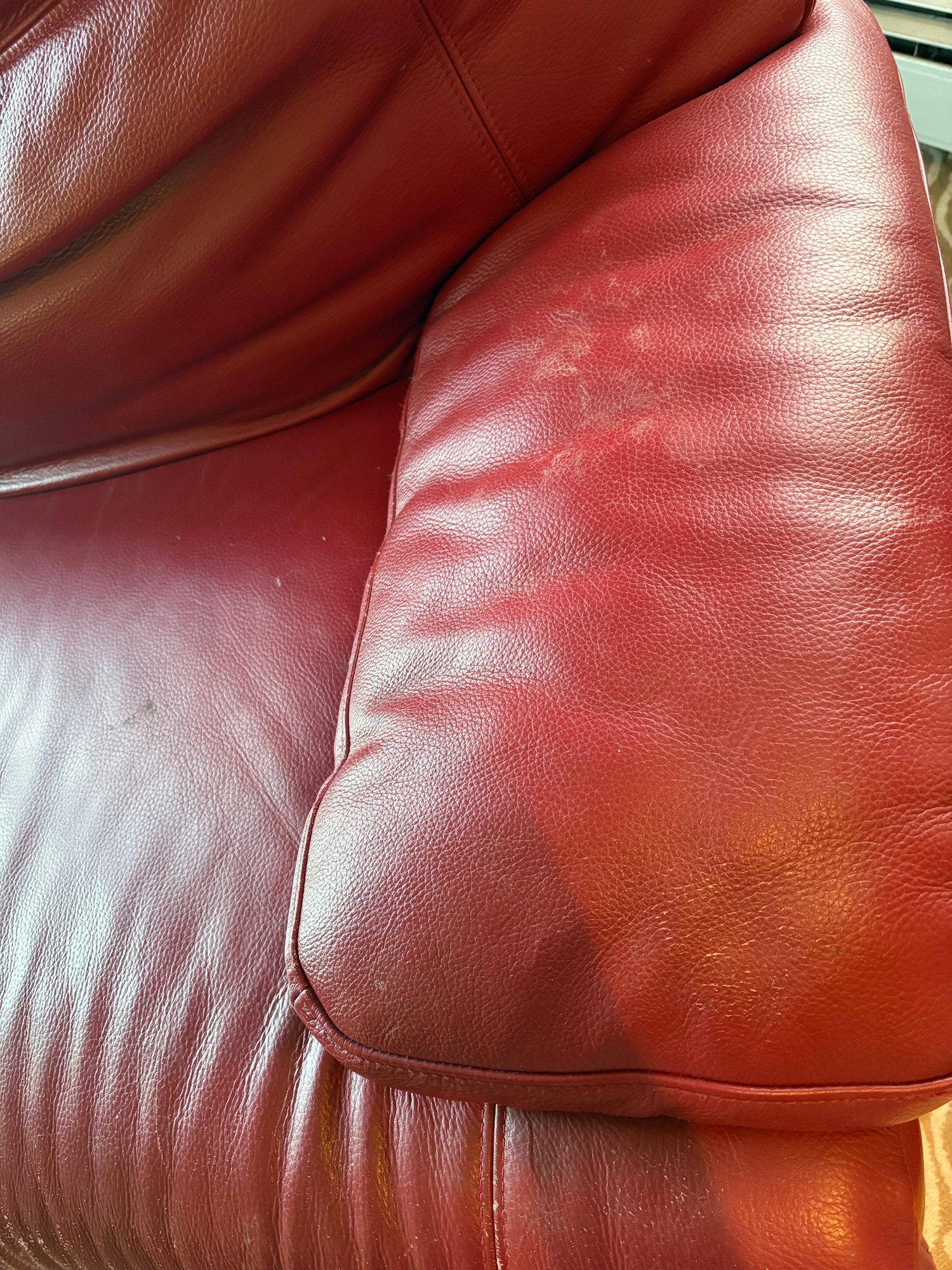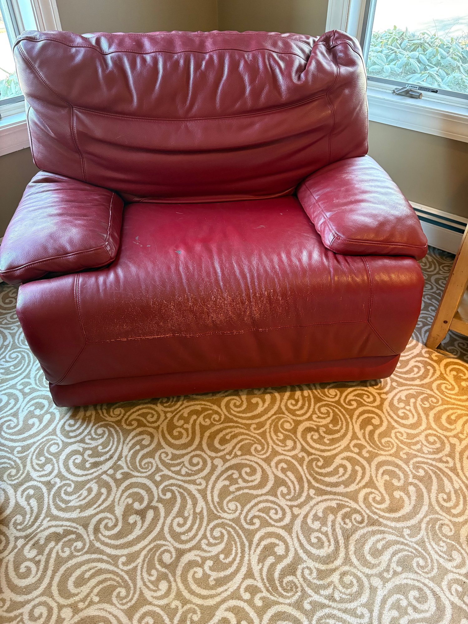Red oversized leather chair it’s 44“ x 33 x 34 and the seat is 23 inches deep Definitely been loved