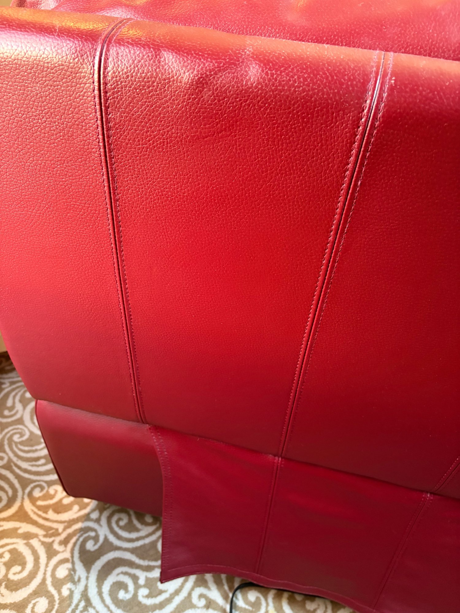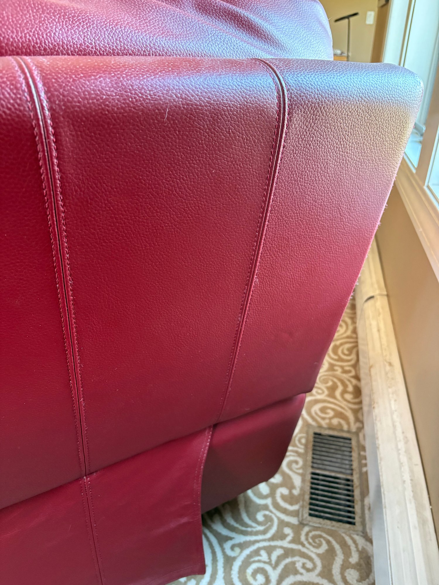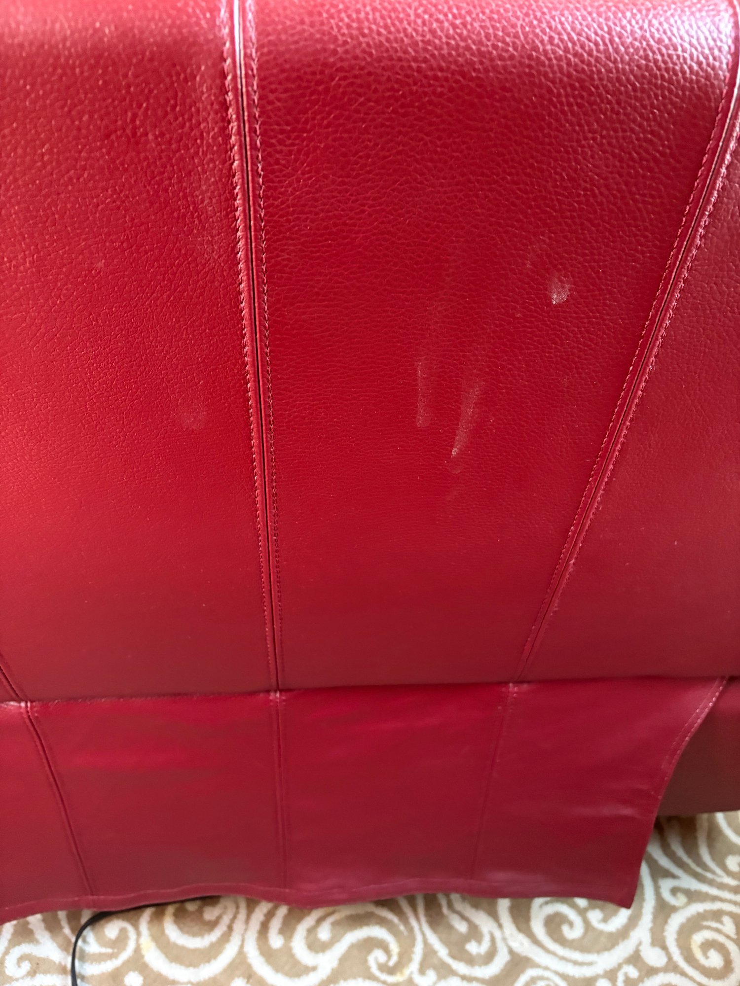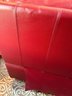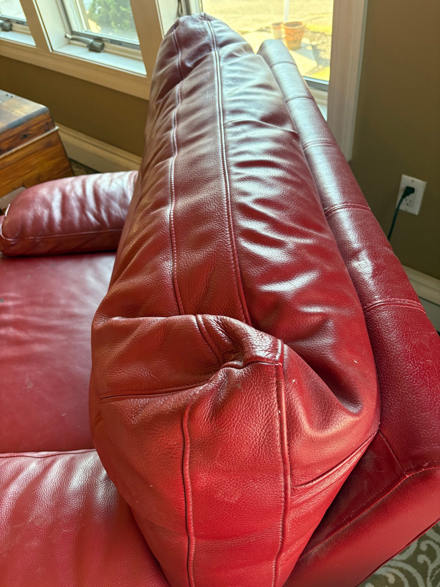 Red oversized leather chair it’s 44“ x 33 x 34 and the seat is 23 inches deep Definitely been loved