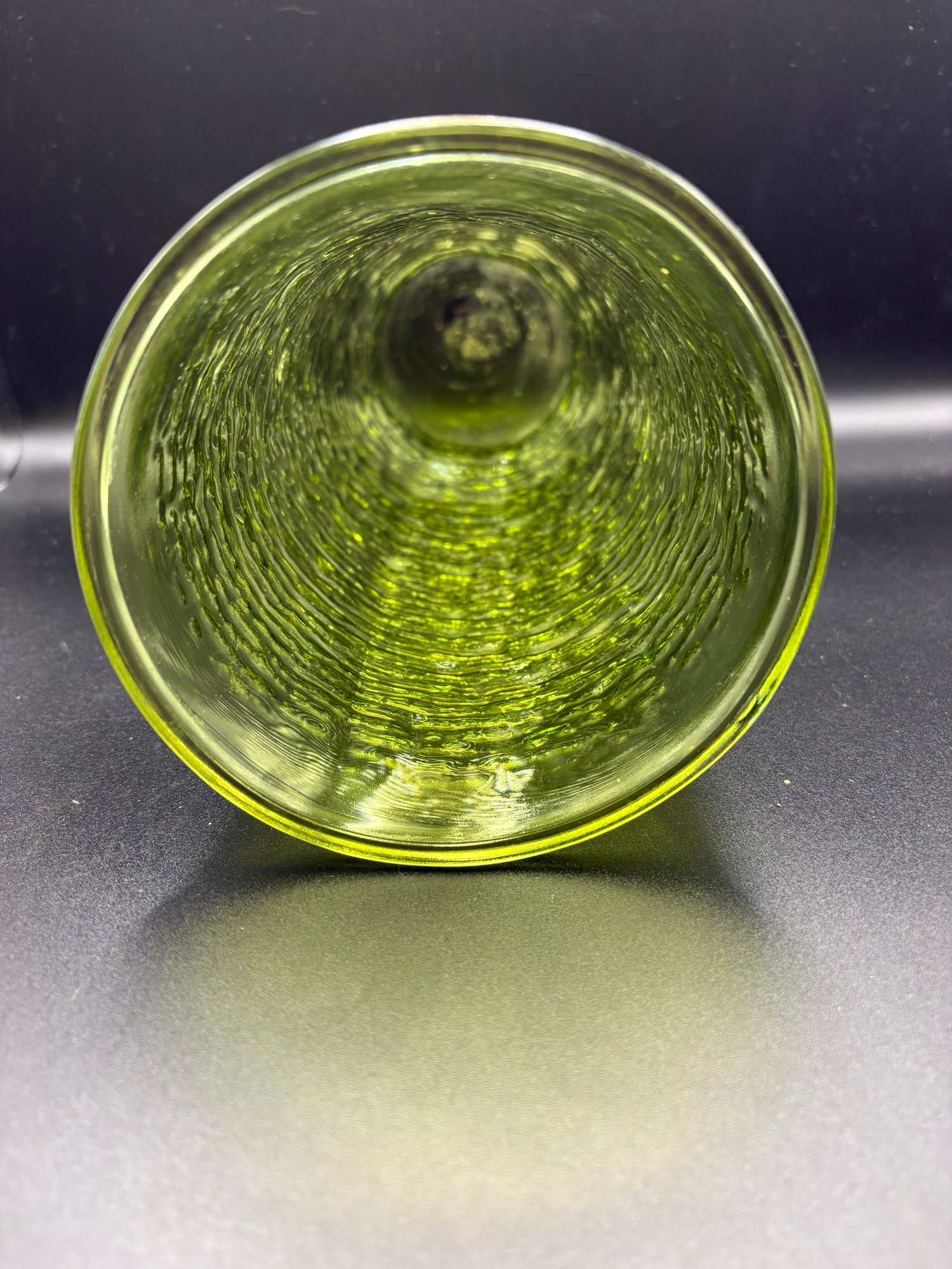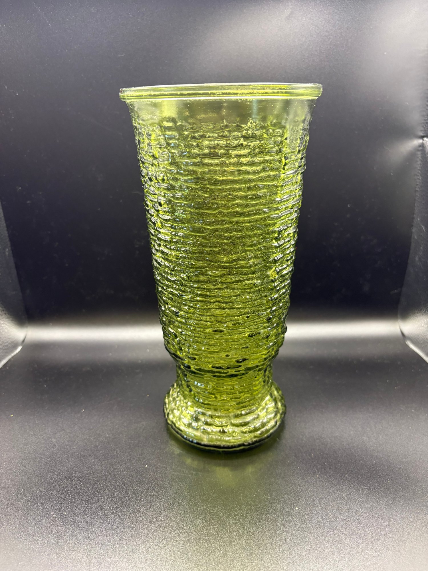 This is a vintage Anchor Hocking Soreno avocado green glass vase.