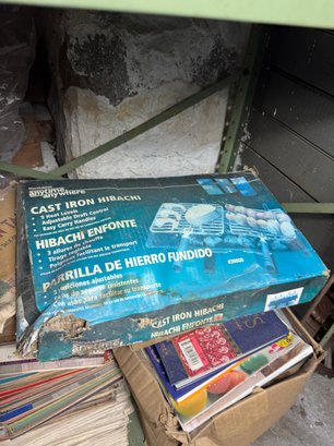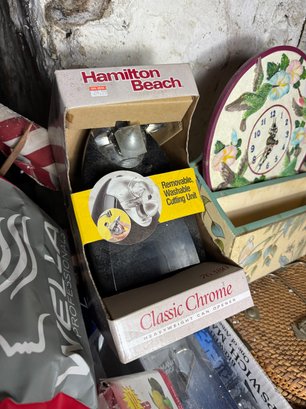 items include cast iron hibachi, hamilton beach can opener & assorted other things