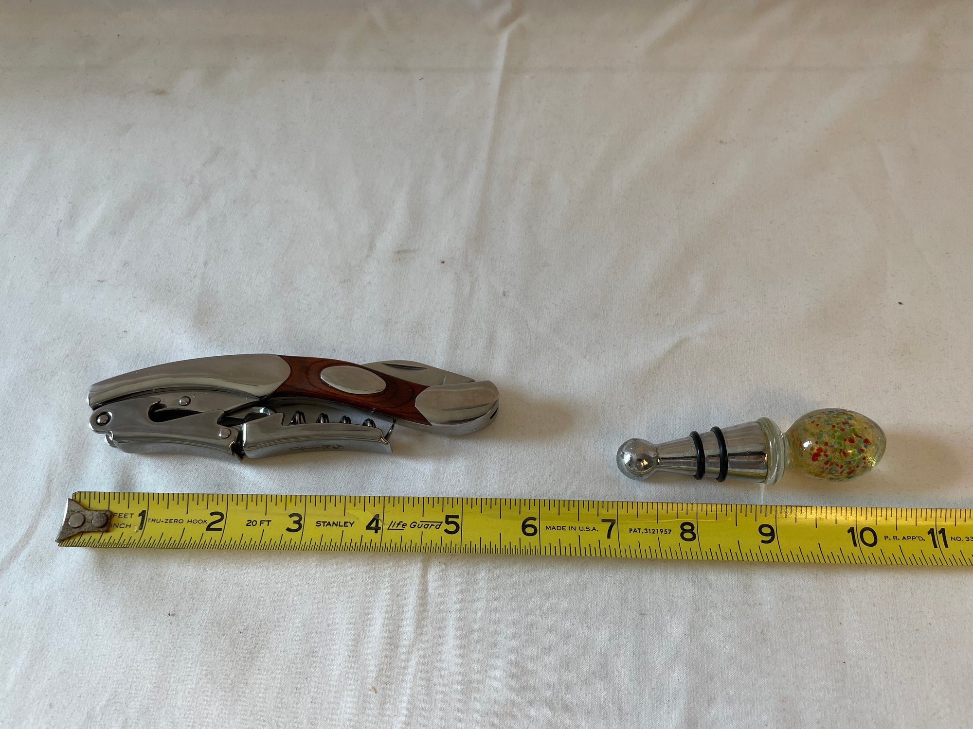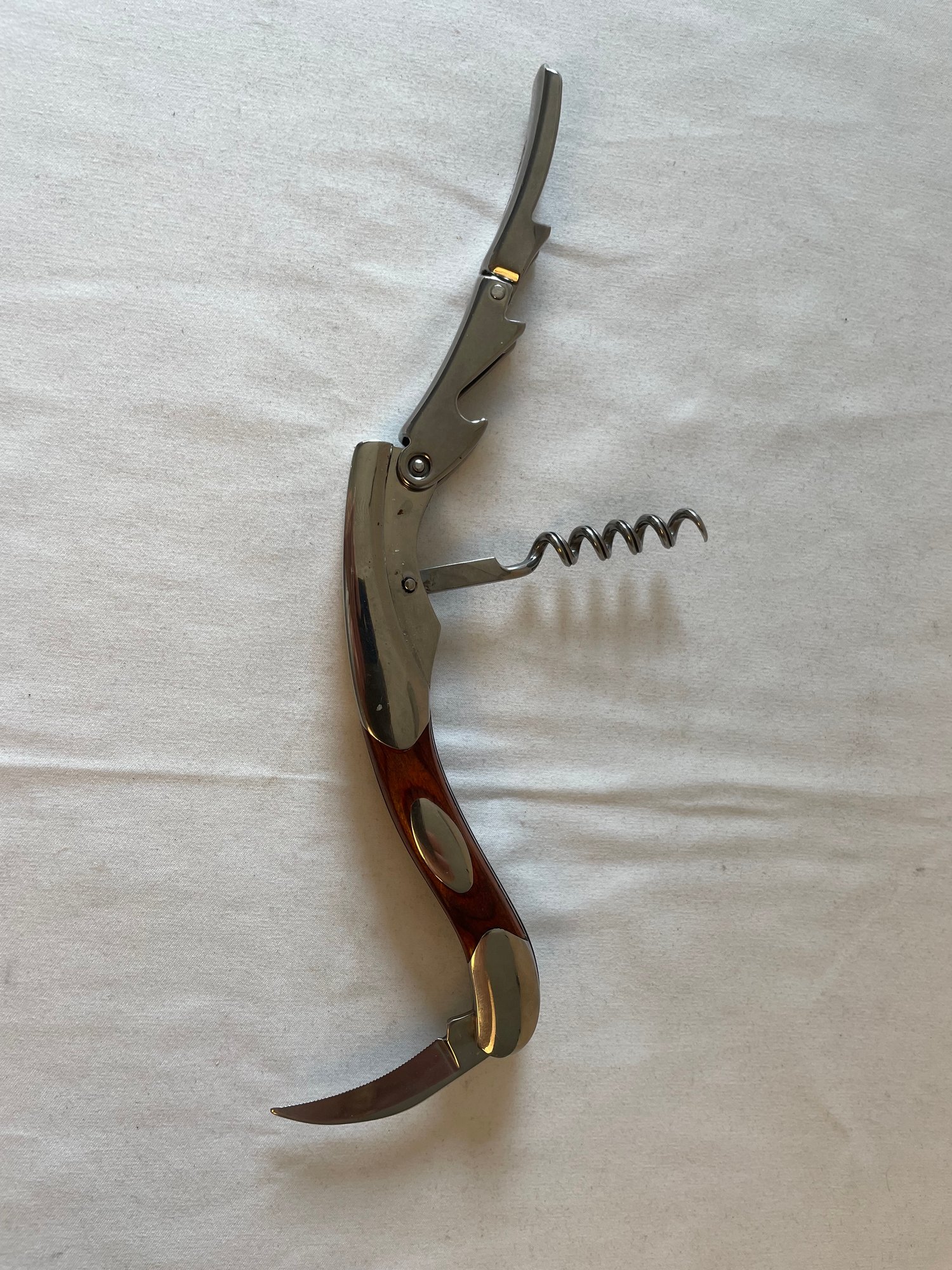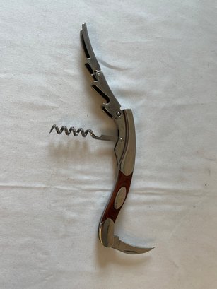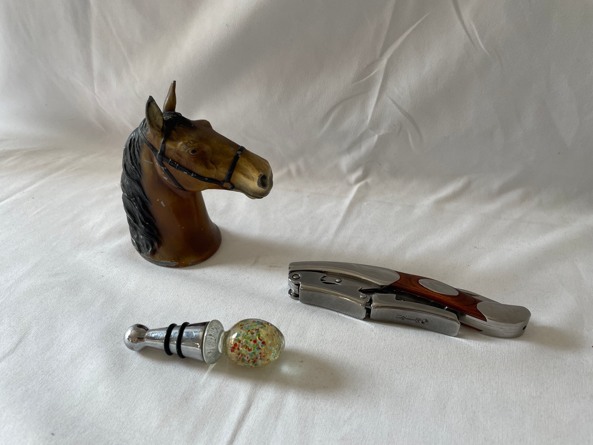 Vintage Rhineland Cutlery chrome & wood waiter’s friend corkscrew/knife, metal horse head bottle opener, glass top wine stop