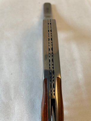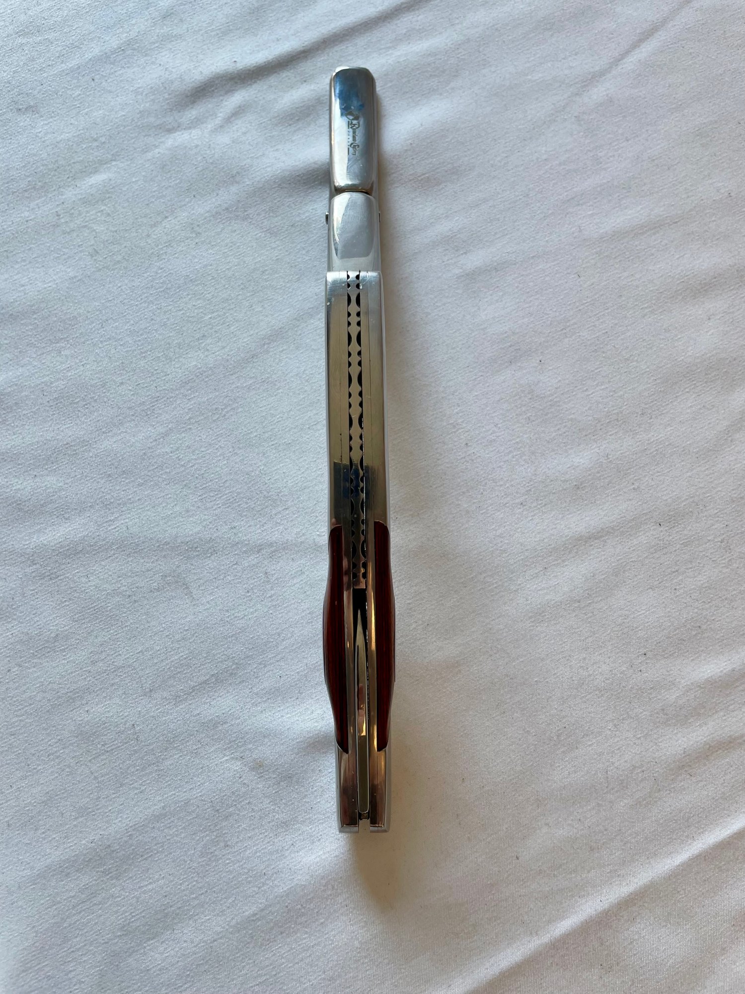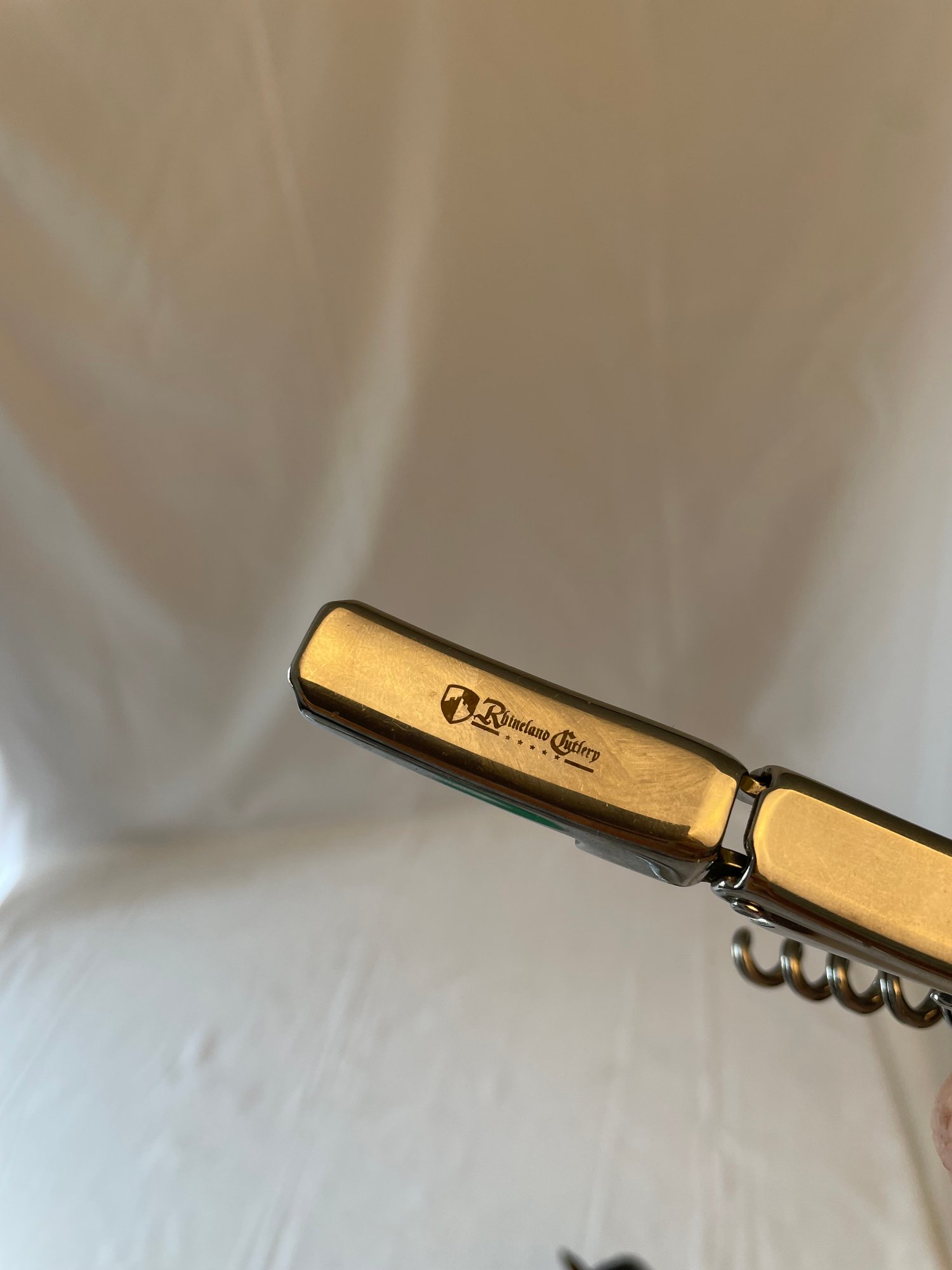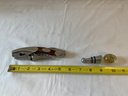Vintage Rhineland Cutlery chrome & wood waiter’s friend corkscrew/knife, metal horse head bottle opener, glass top wine stop
