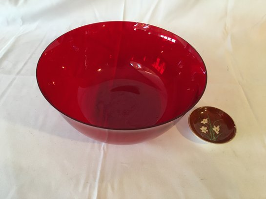 Flared Ruby Red glass bowl , 9 3/4” diameter , some slight bites on edges of bowl