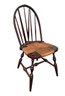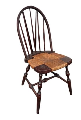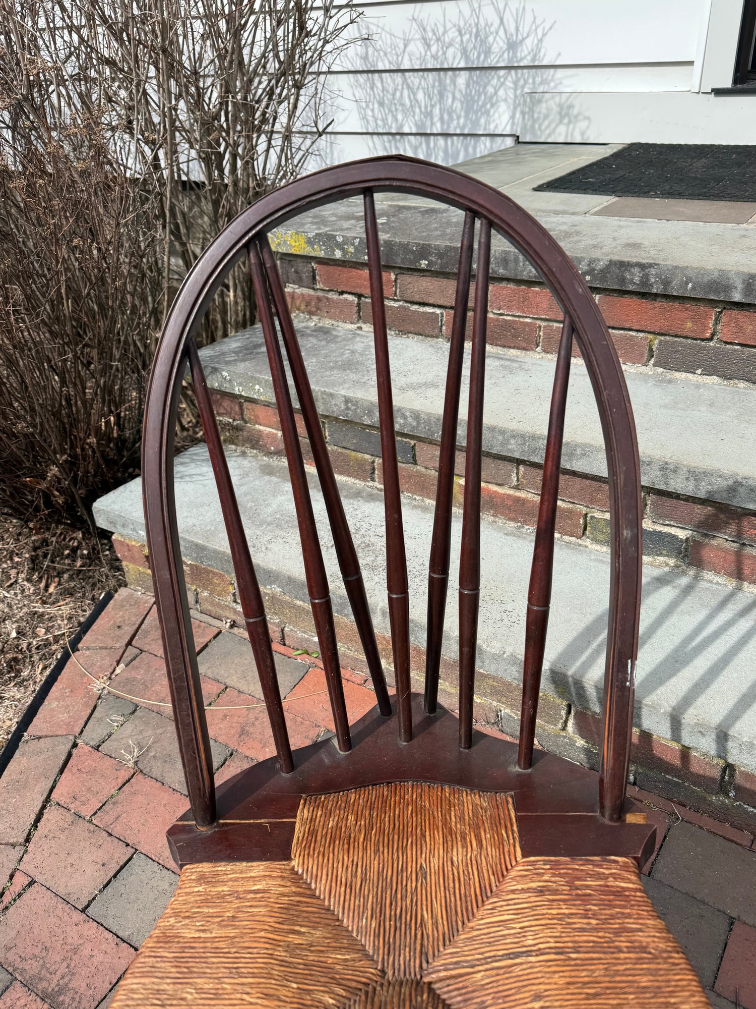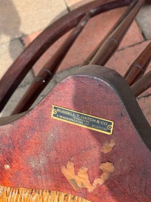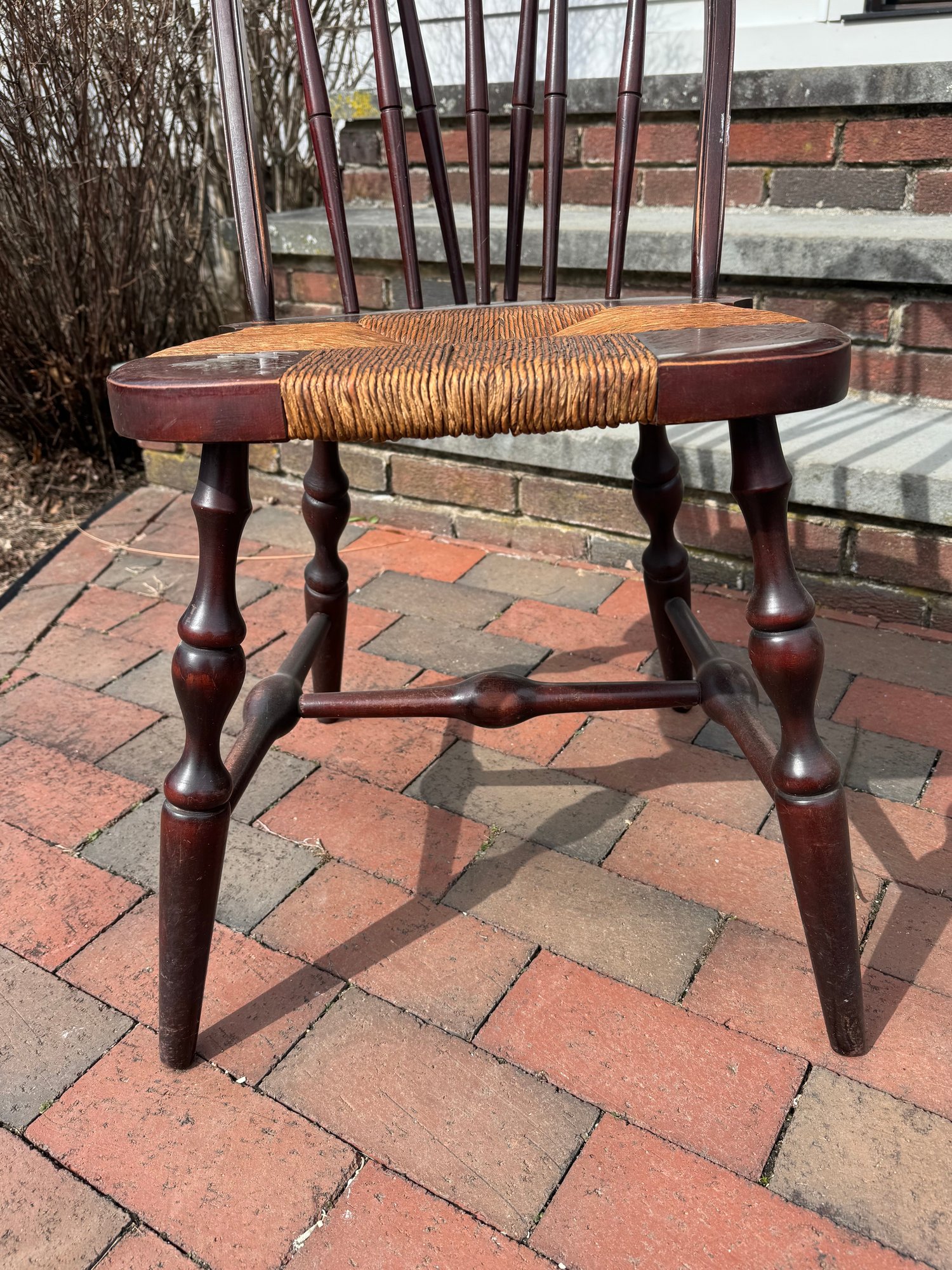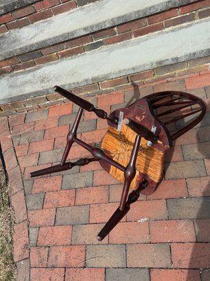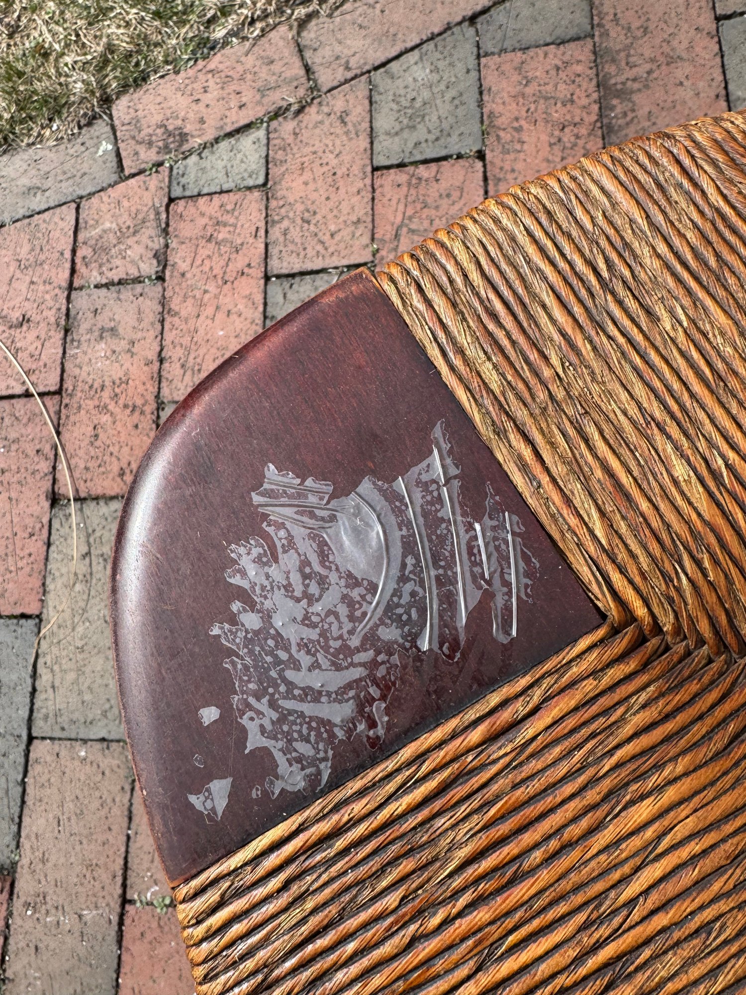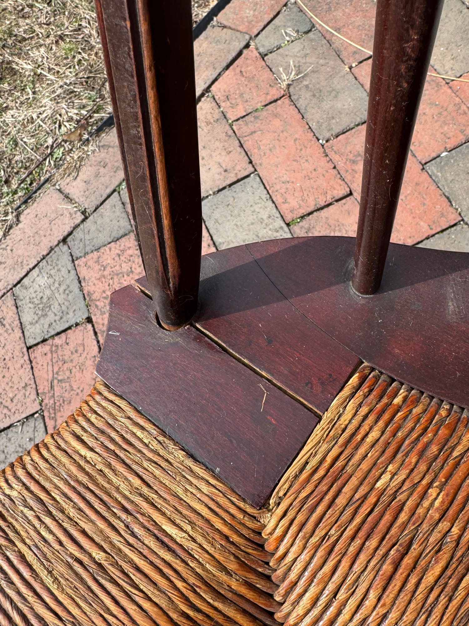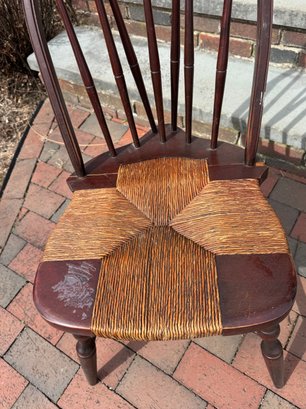 slightly wobbly, some areas of wear & cracks in the wood, rush seating is in good shape, some damage on top