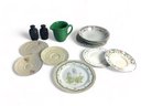 Salt and pepper, assorted small plates, green pitcher- has a chip