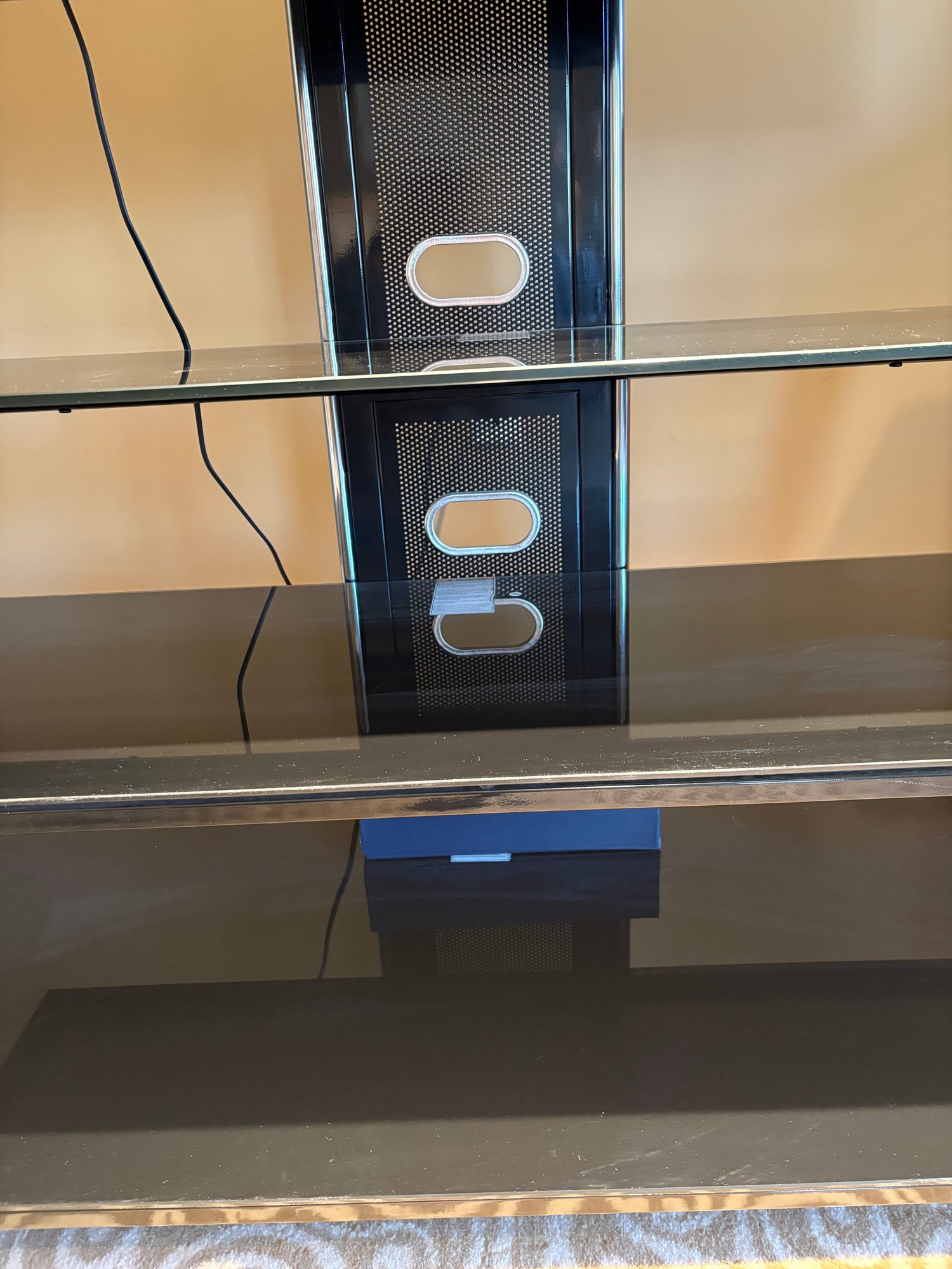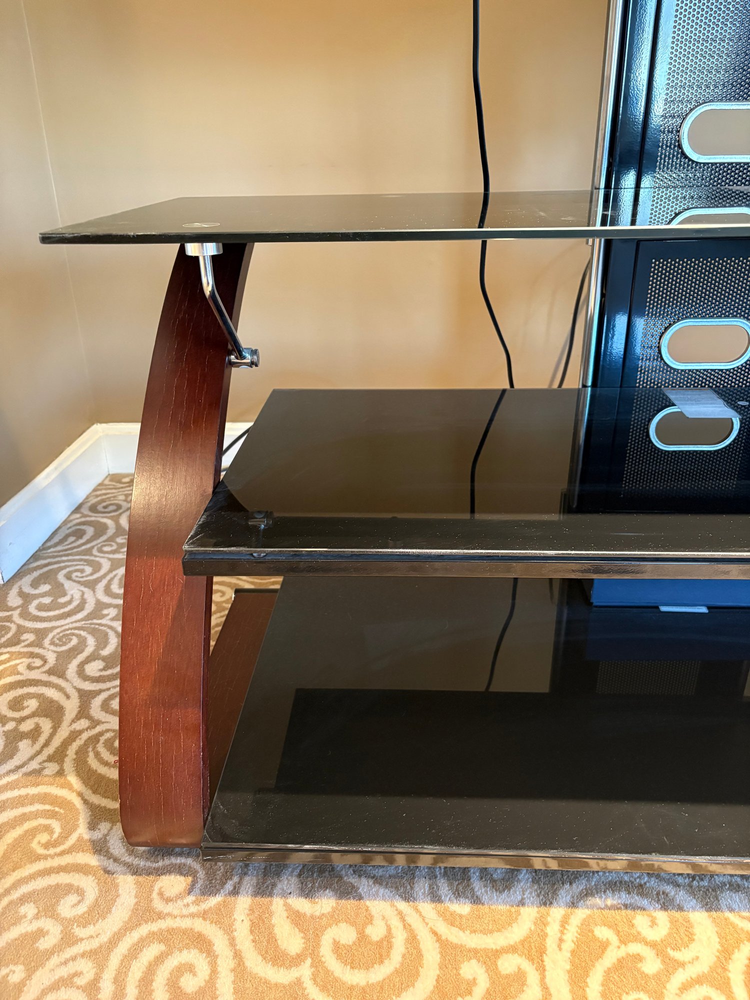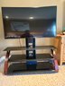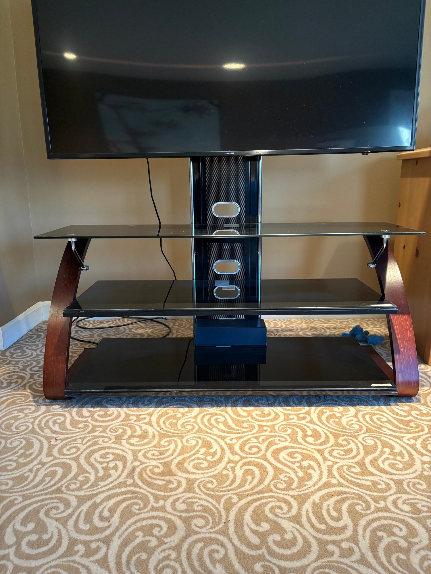 Samsung TV is 55 inches and the stand is 55 x 22 x 15 The stand is glass, wood and metal