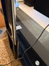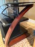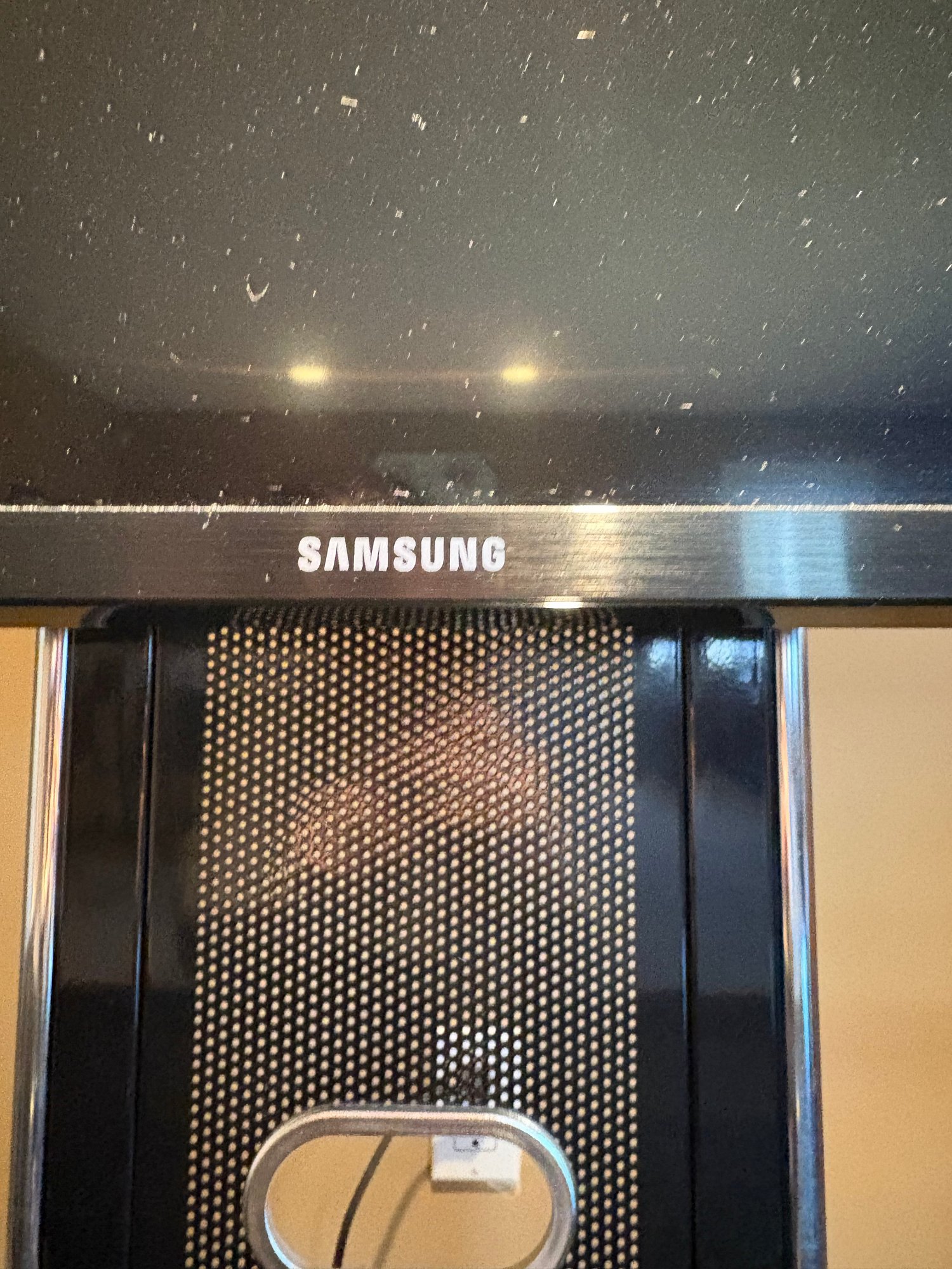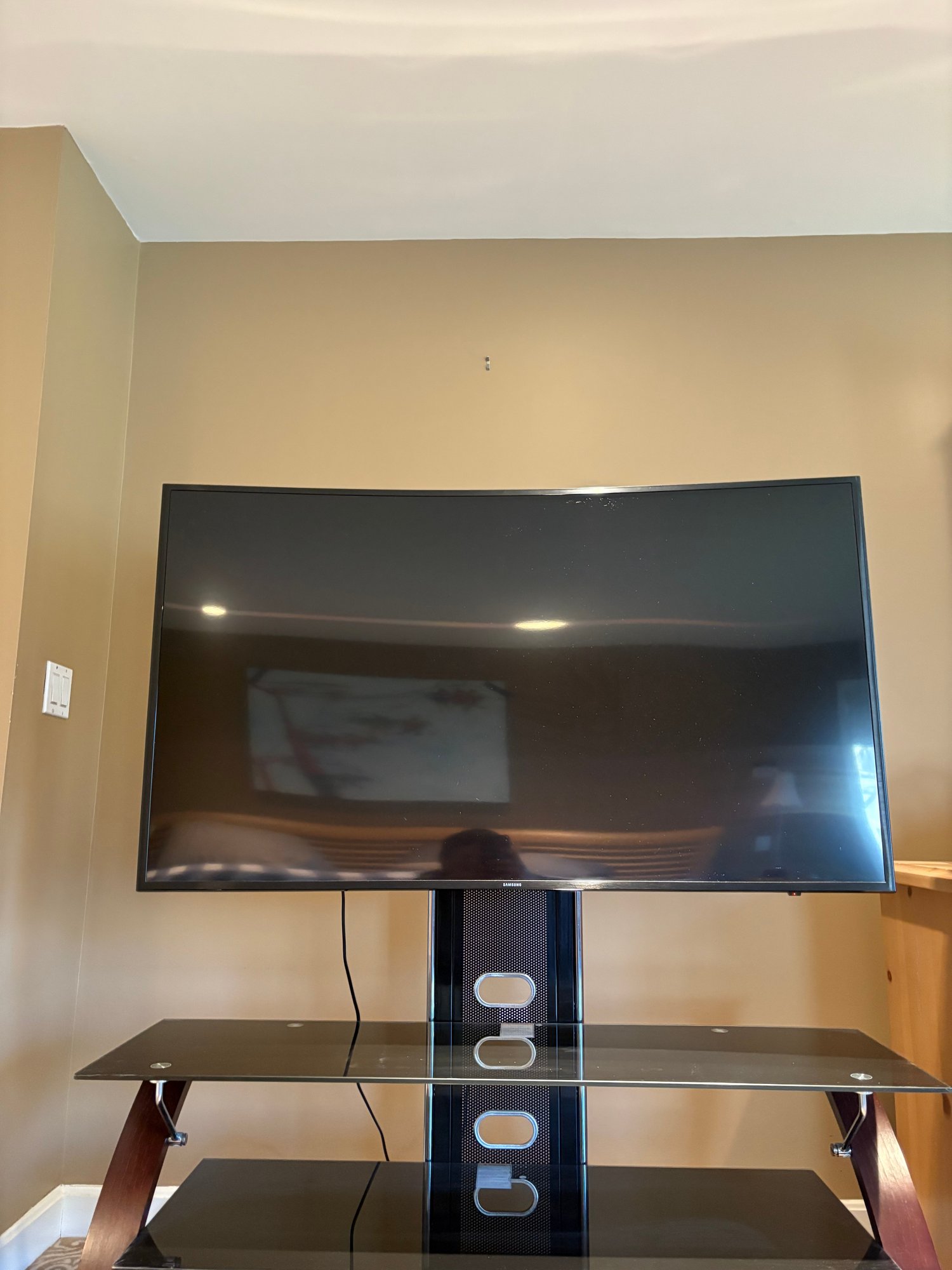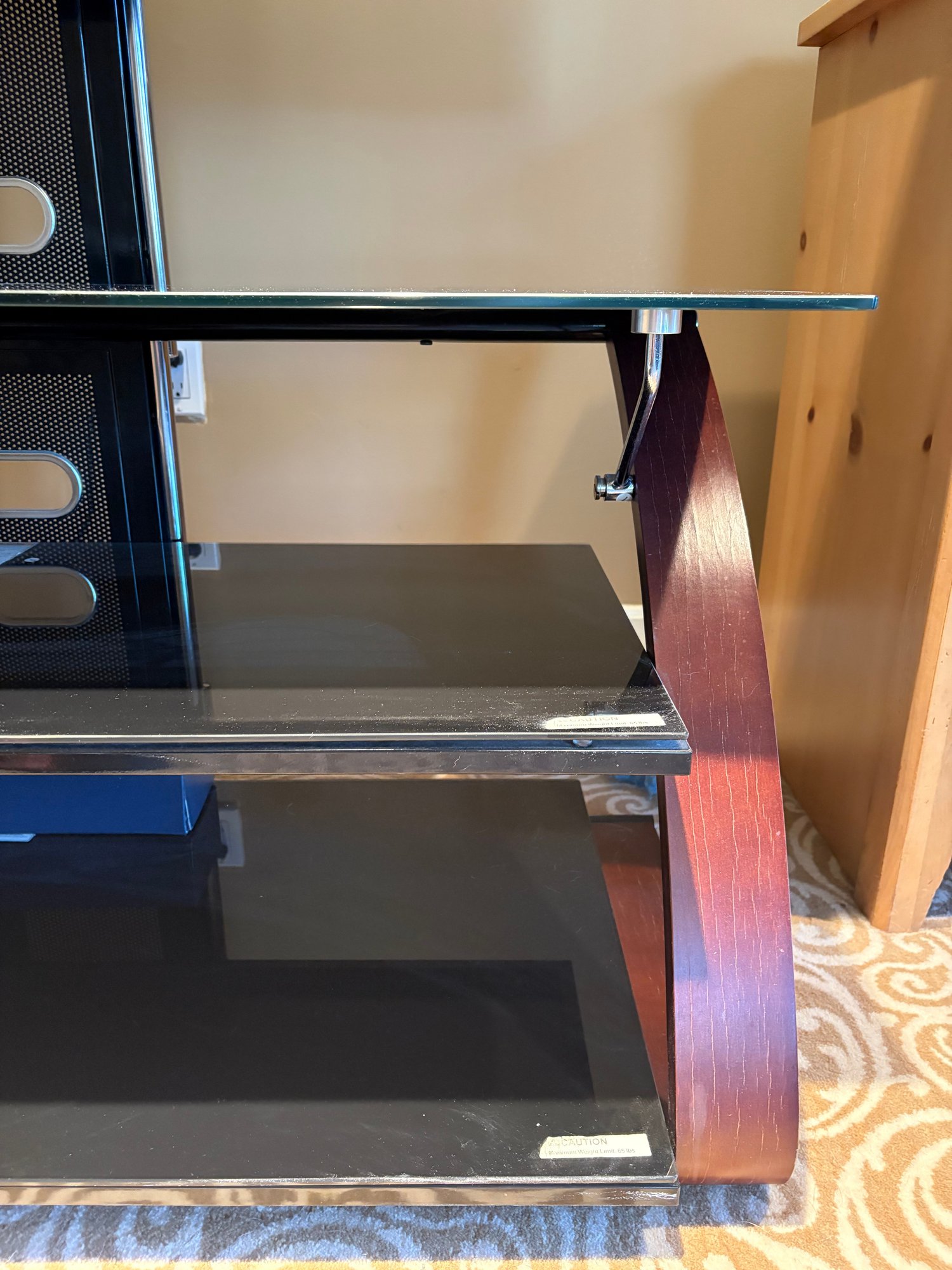 Samsung TV is 55 inches and the stand is 55 x 22 x 15 The stand is glass, wood and metal