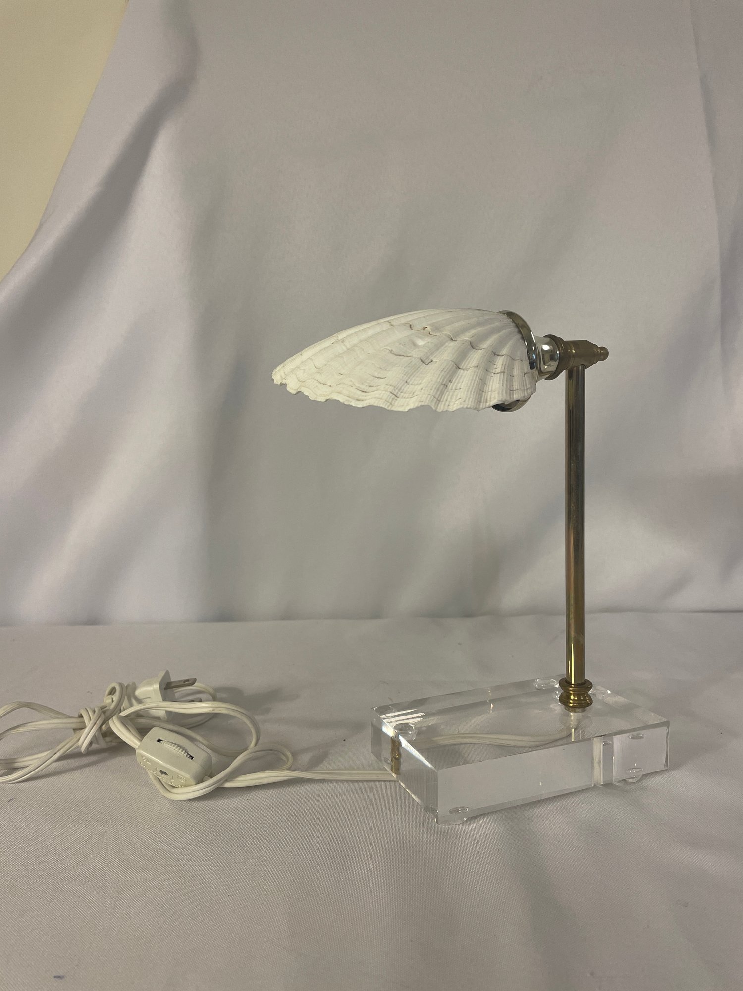 Scallop shell lamp w/ rectangular 5x3in lucite base. White cord with switch. Currently not working, may just need new bulb.