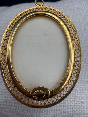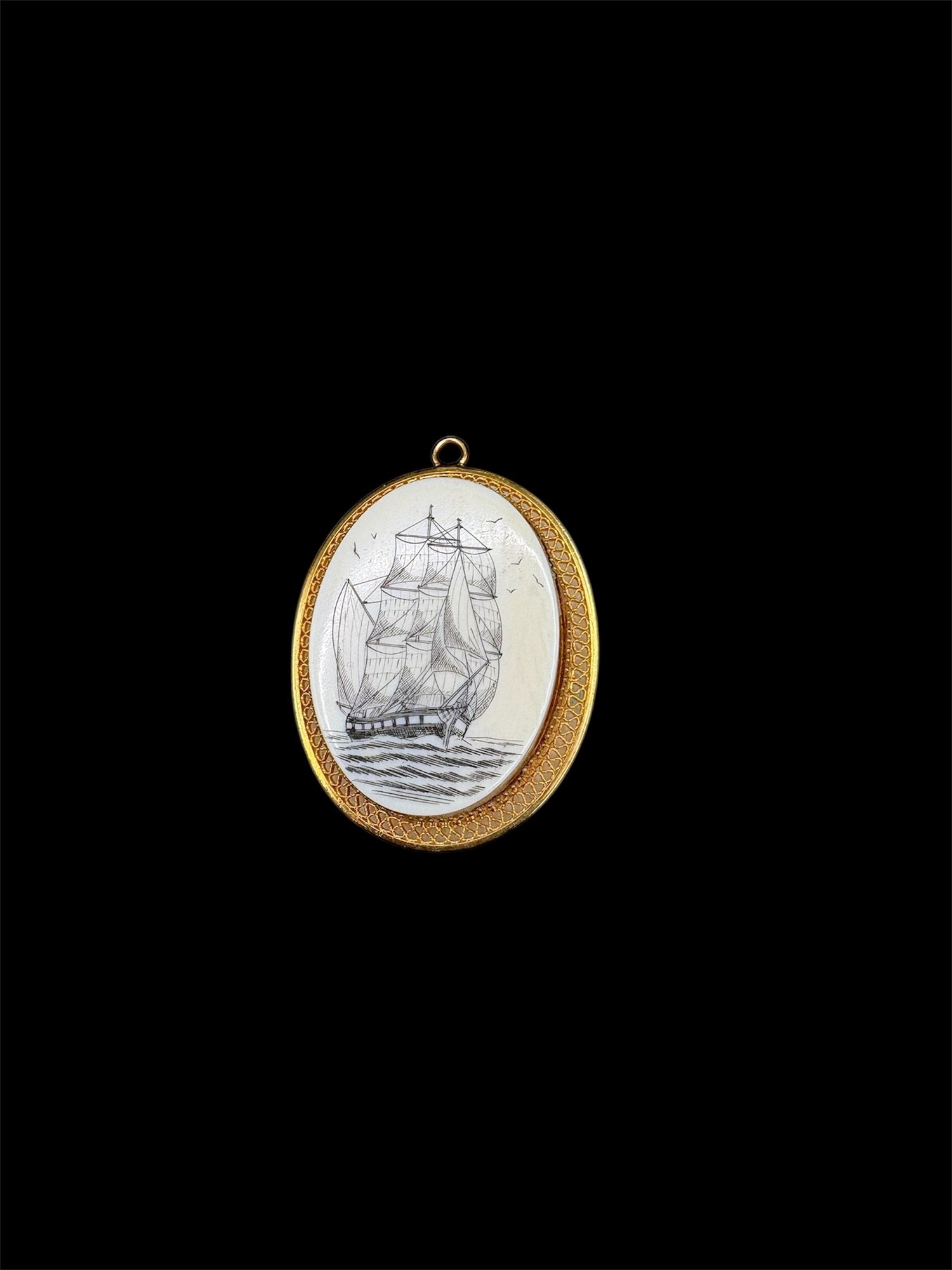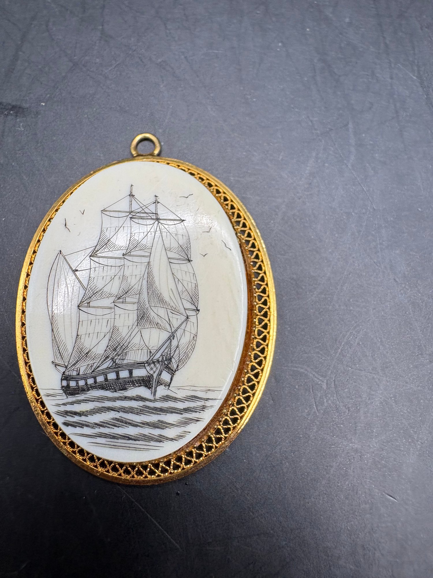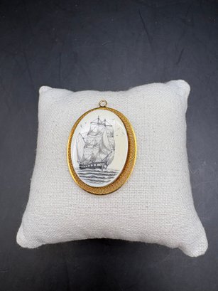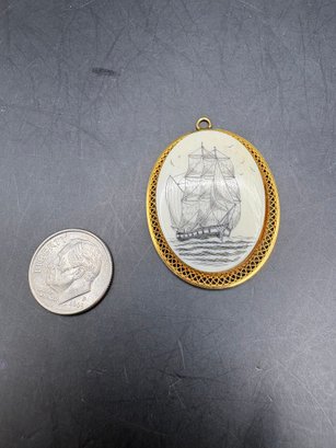 Scrimshaw necklace pendant on bone painted ship gold fill