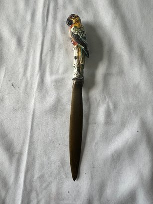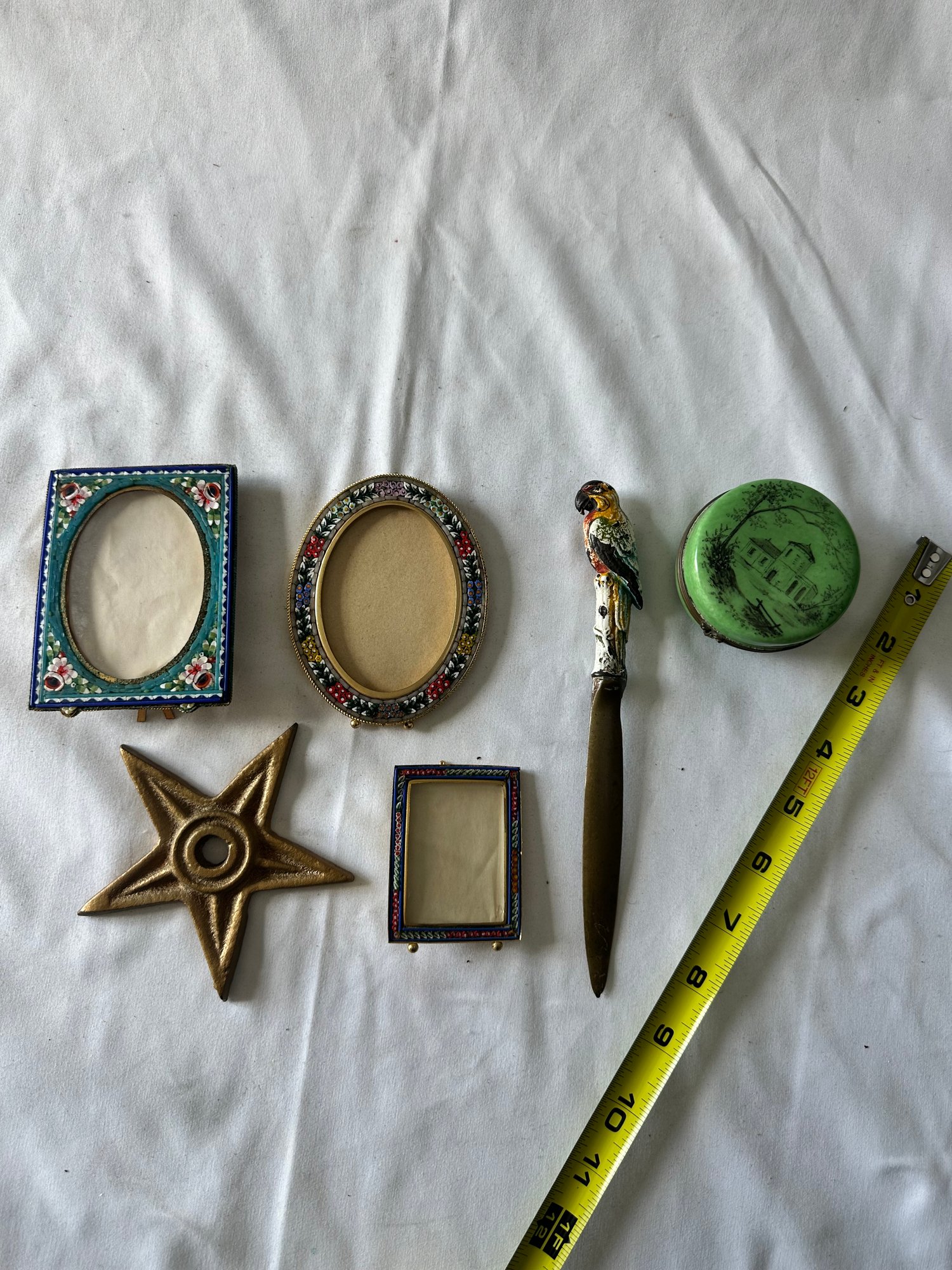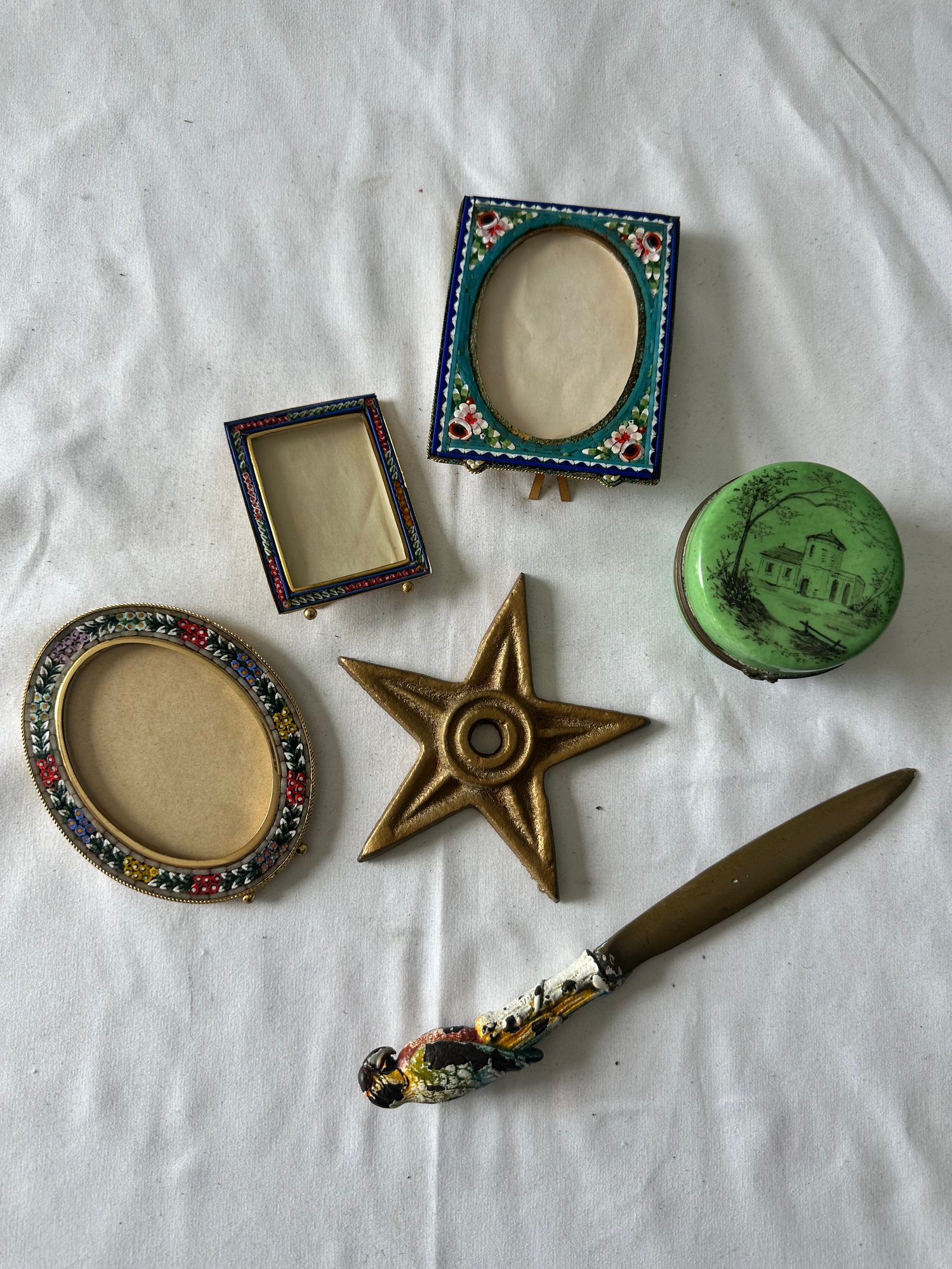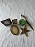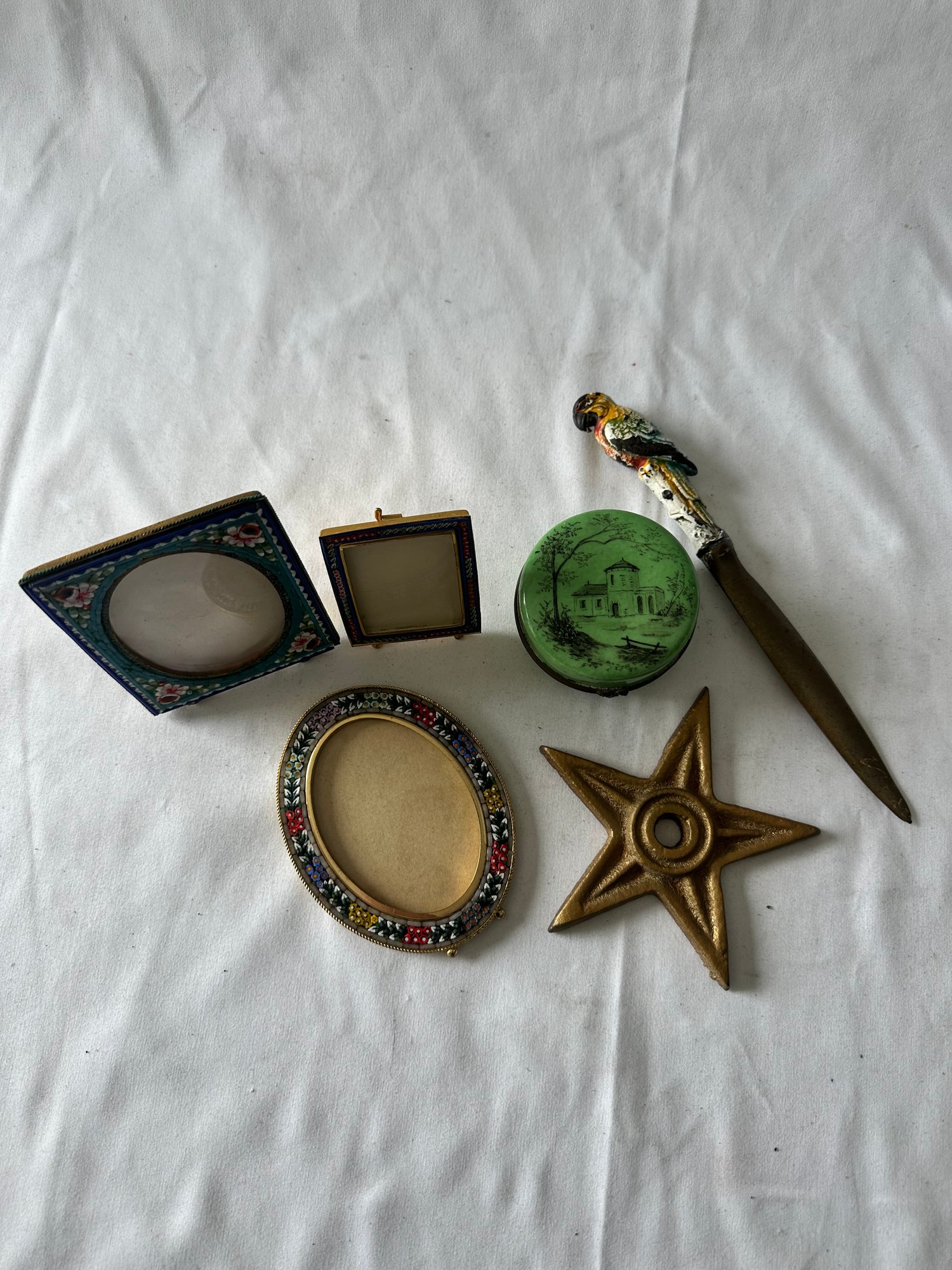 Three frames, letter opener with parrot, porcelain trinket box, star wall hanging decor