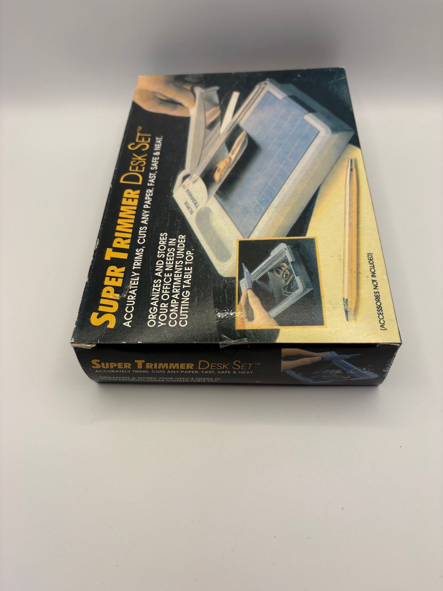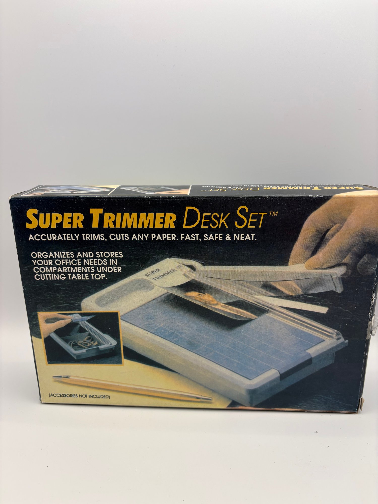 There is electric scissors, needles, buttonhole, foot, needle, threader and heavy duty needles for sewing heavy materials along with a super trimmer desk paper cutter.