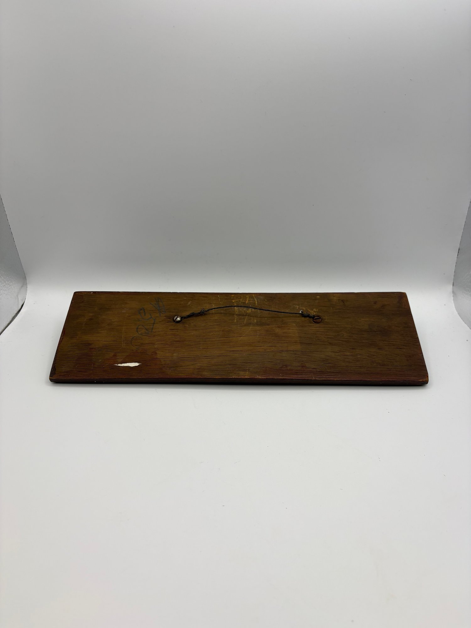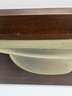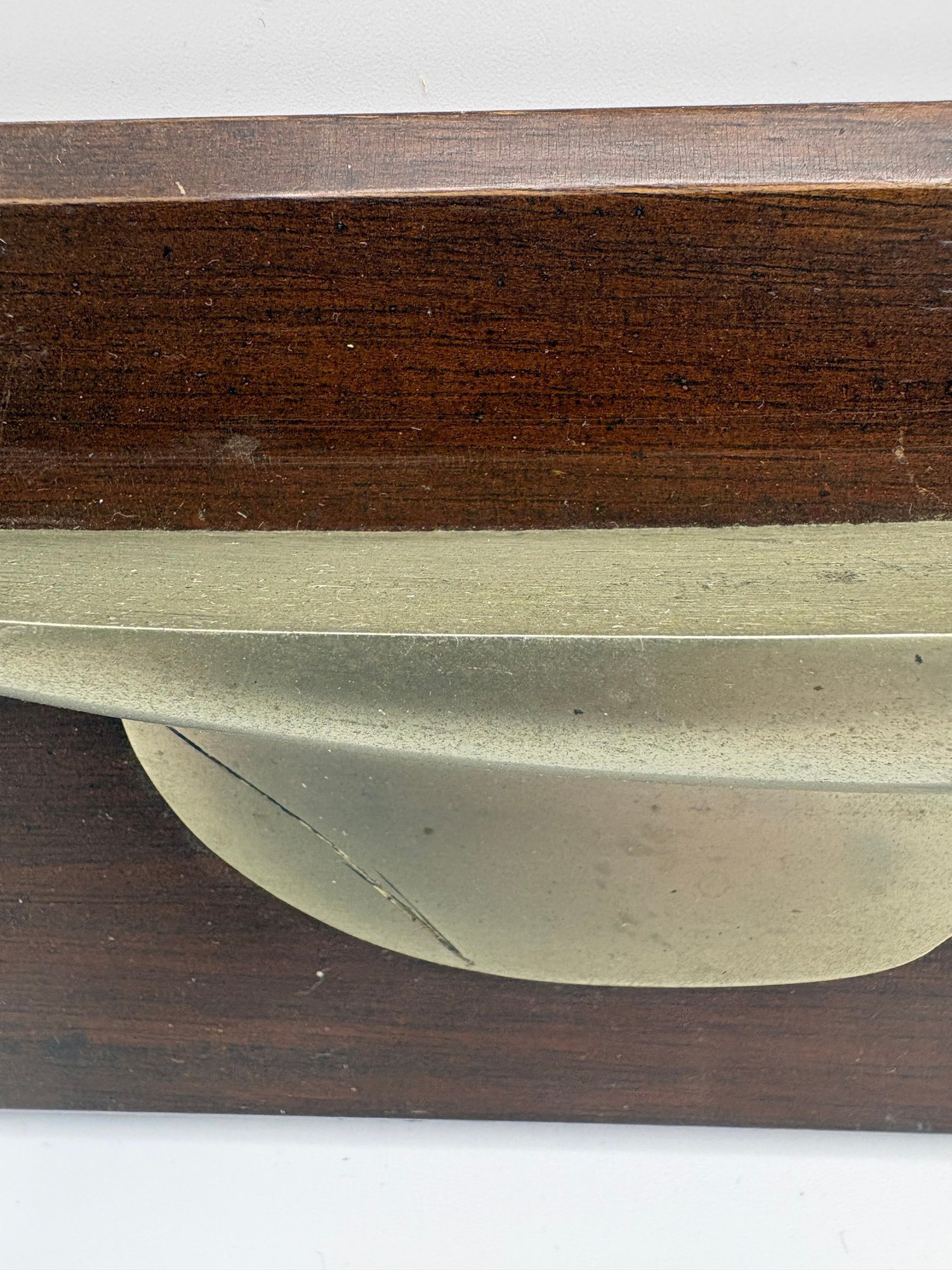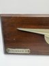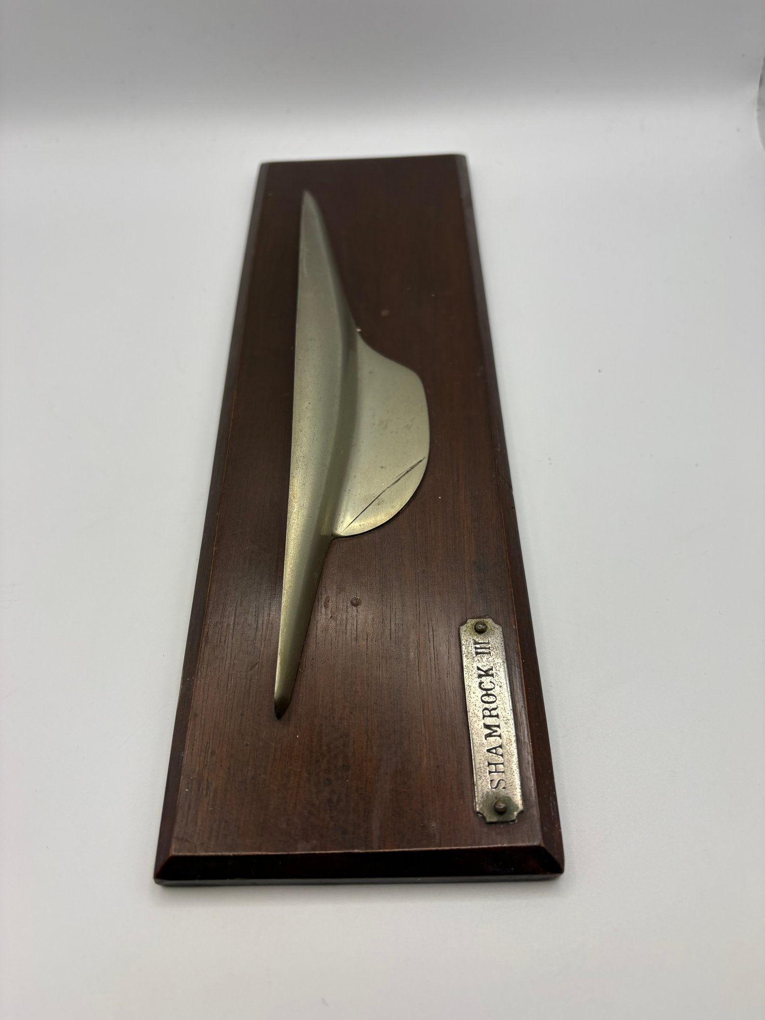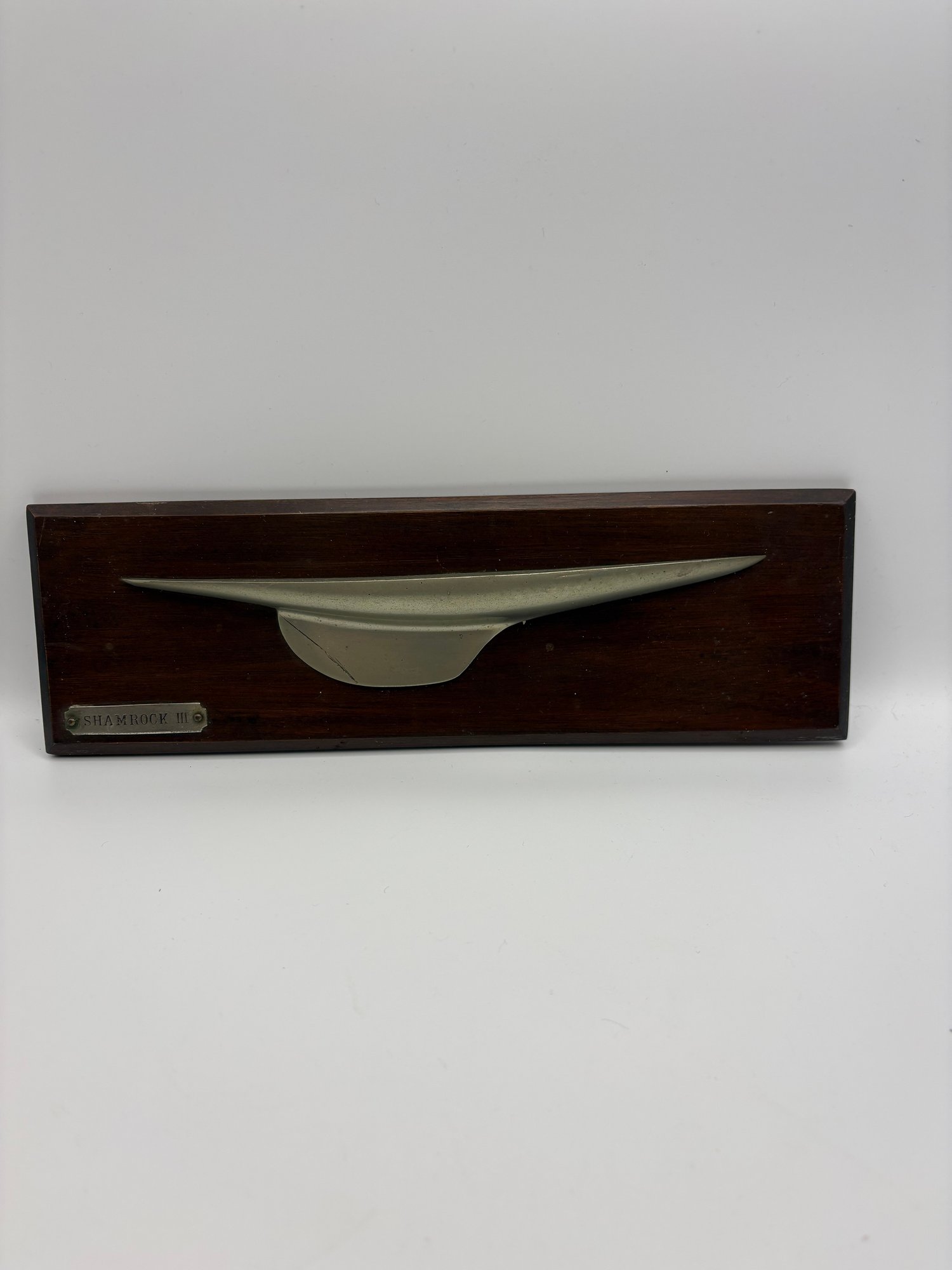 It is a handcrafted half-hull model of the renowned racing yacht 11 x 3.5 x 1“ on dark wood. There’s a scratch on the metal but it’s not broken. Just a deep scratch.