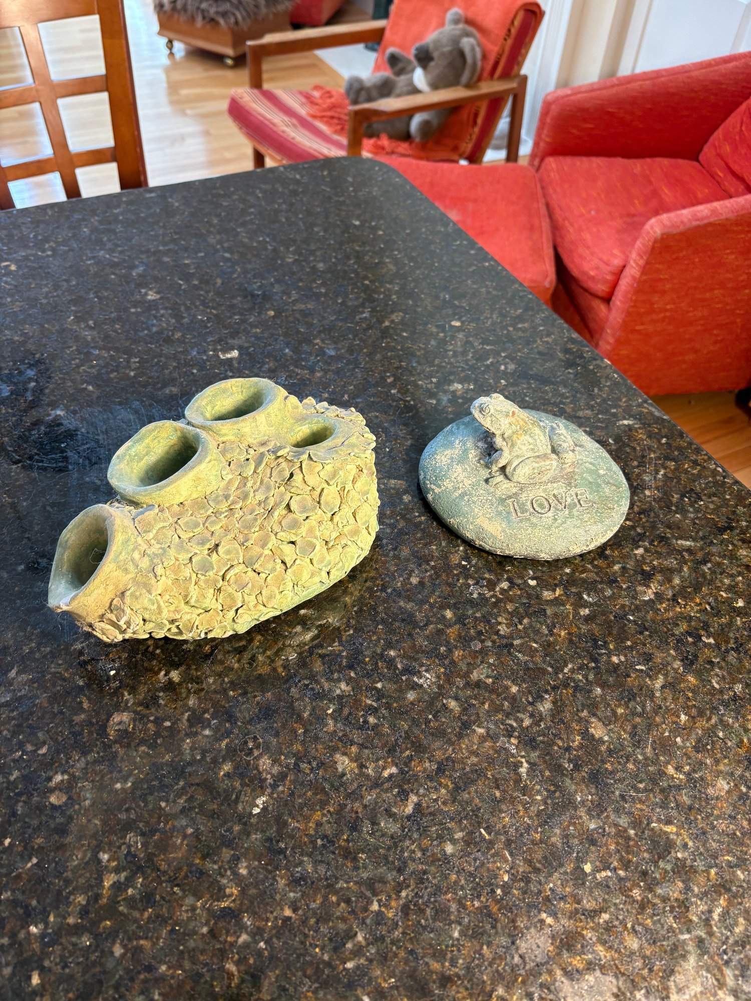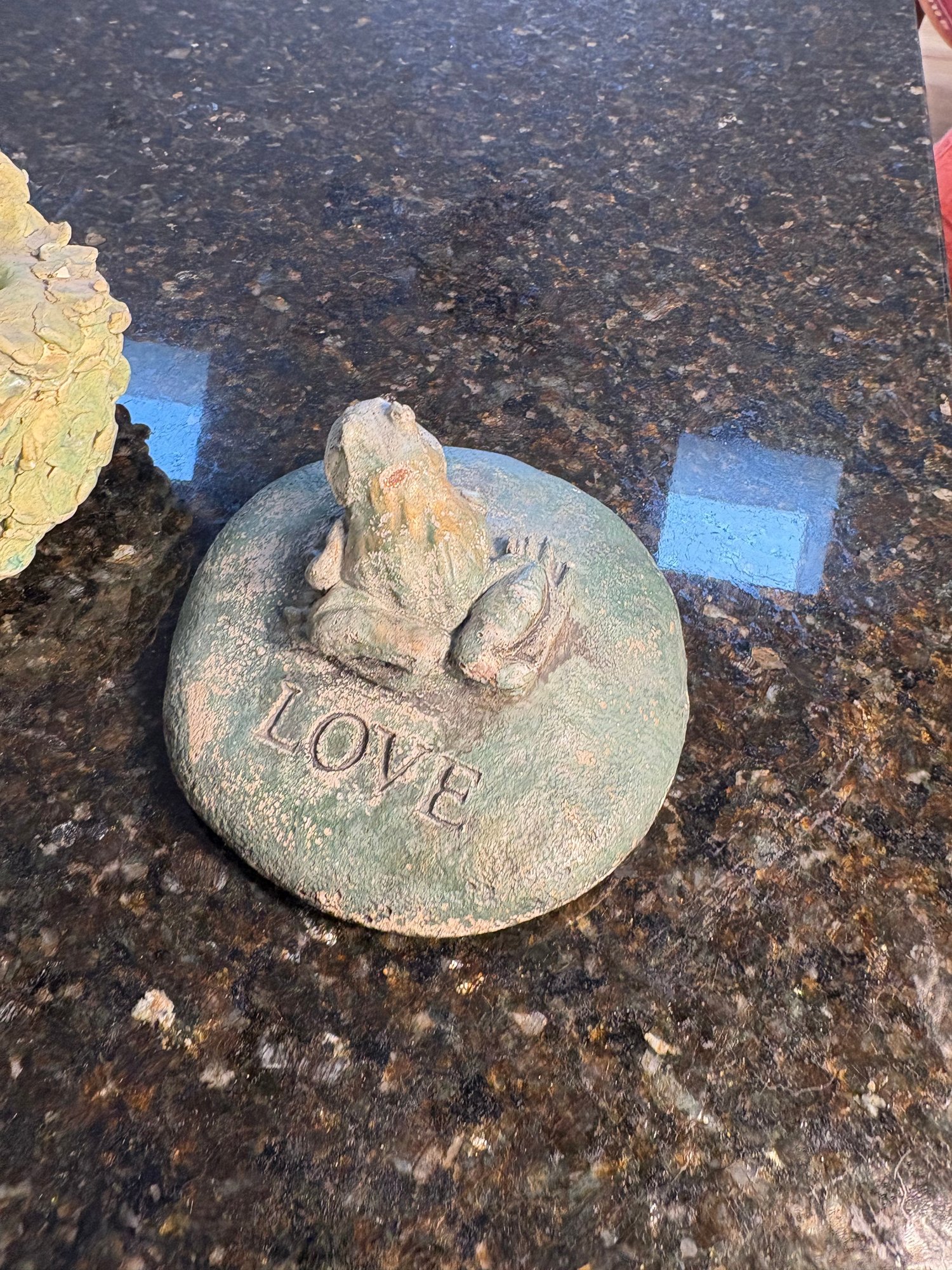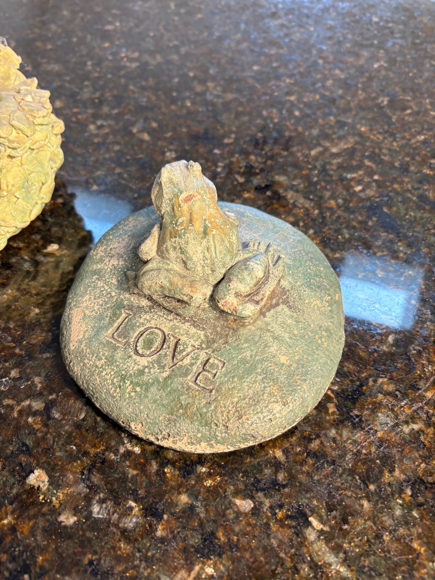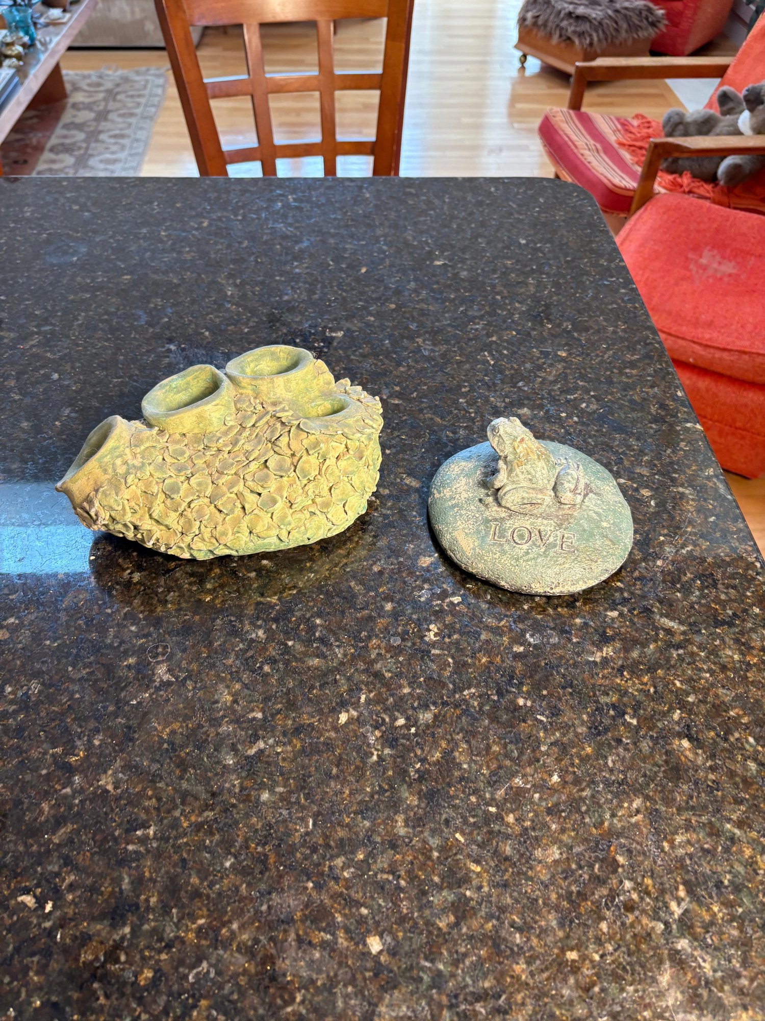 Outdoor frog statue approximately 6 inches in diameter. Signed pottery piece 10 inches long and 2.75 inches tall