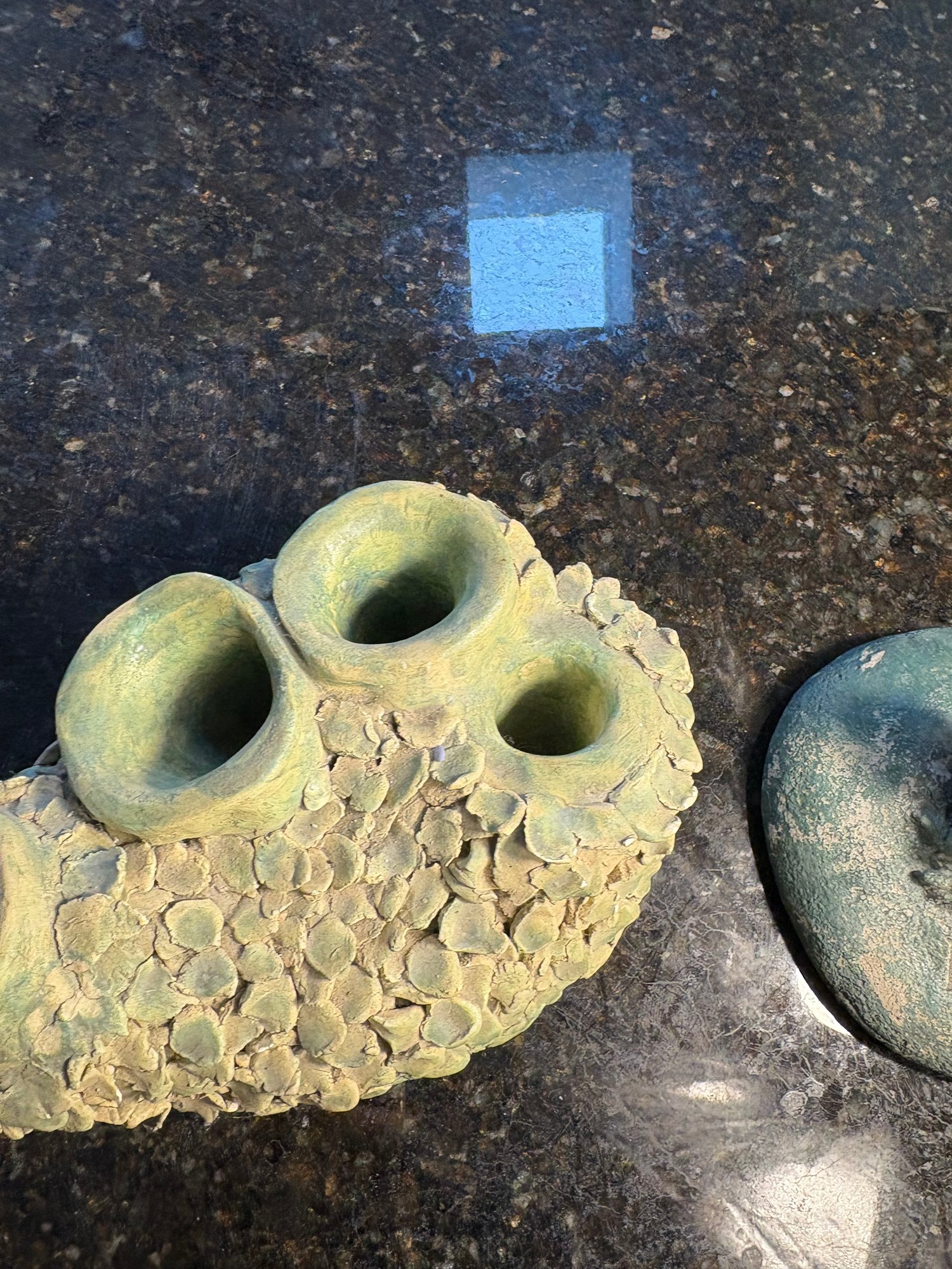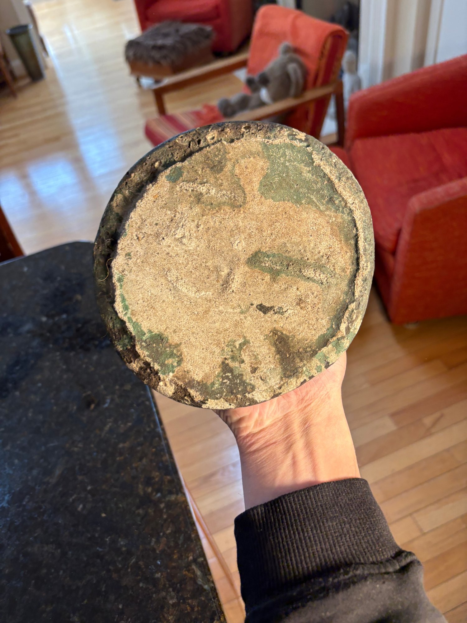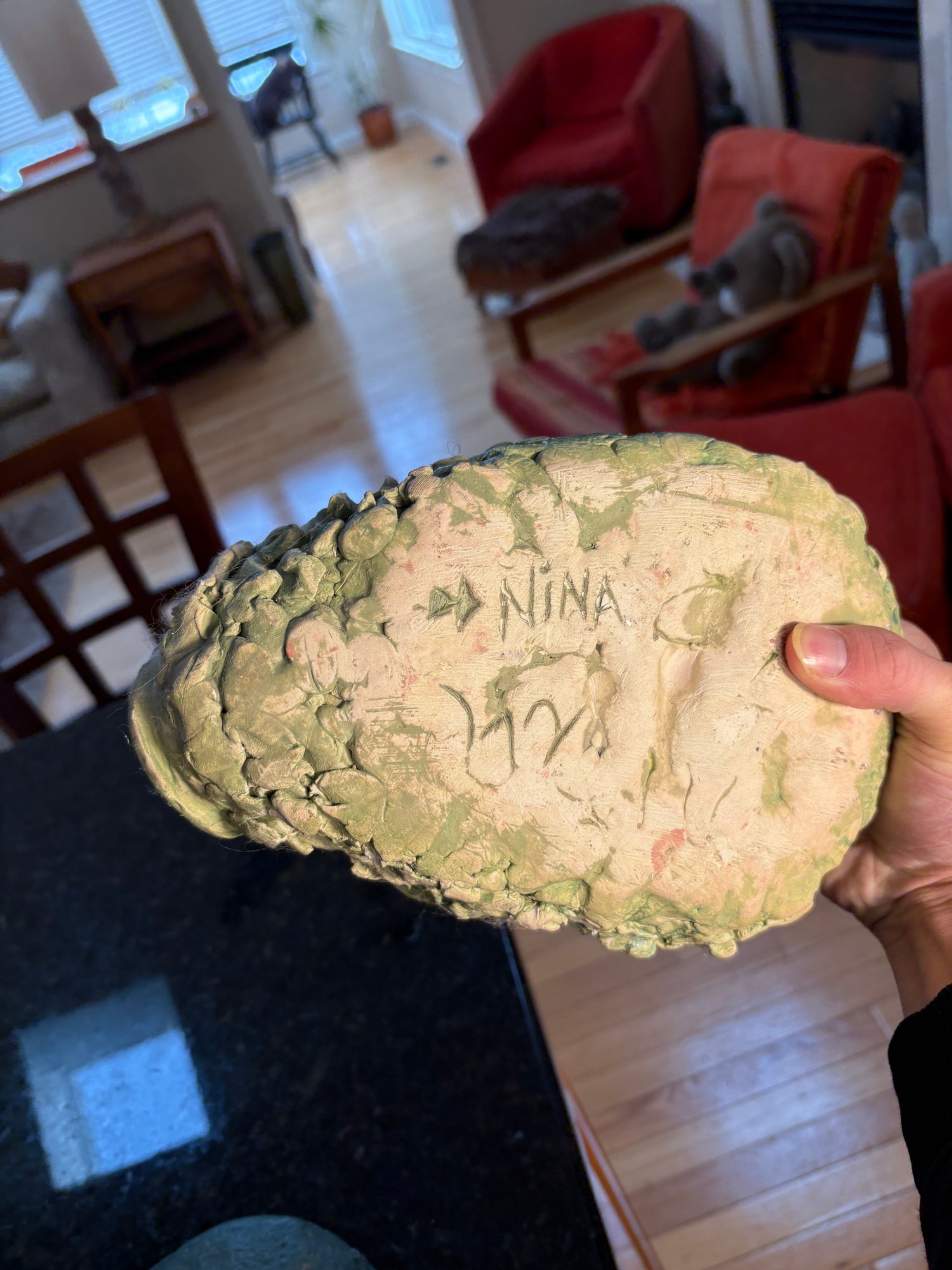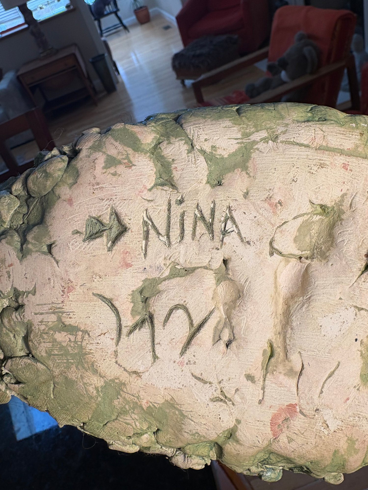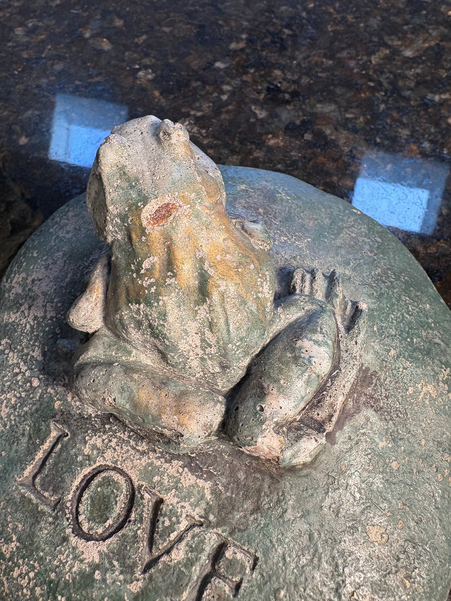Outdoor frog statue approximately 6 inches in diameter. Signed pottery piece 10 inches long and 2.75 inches tall