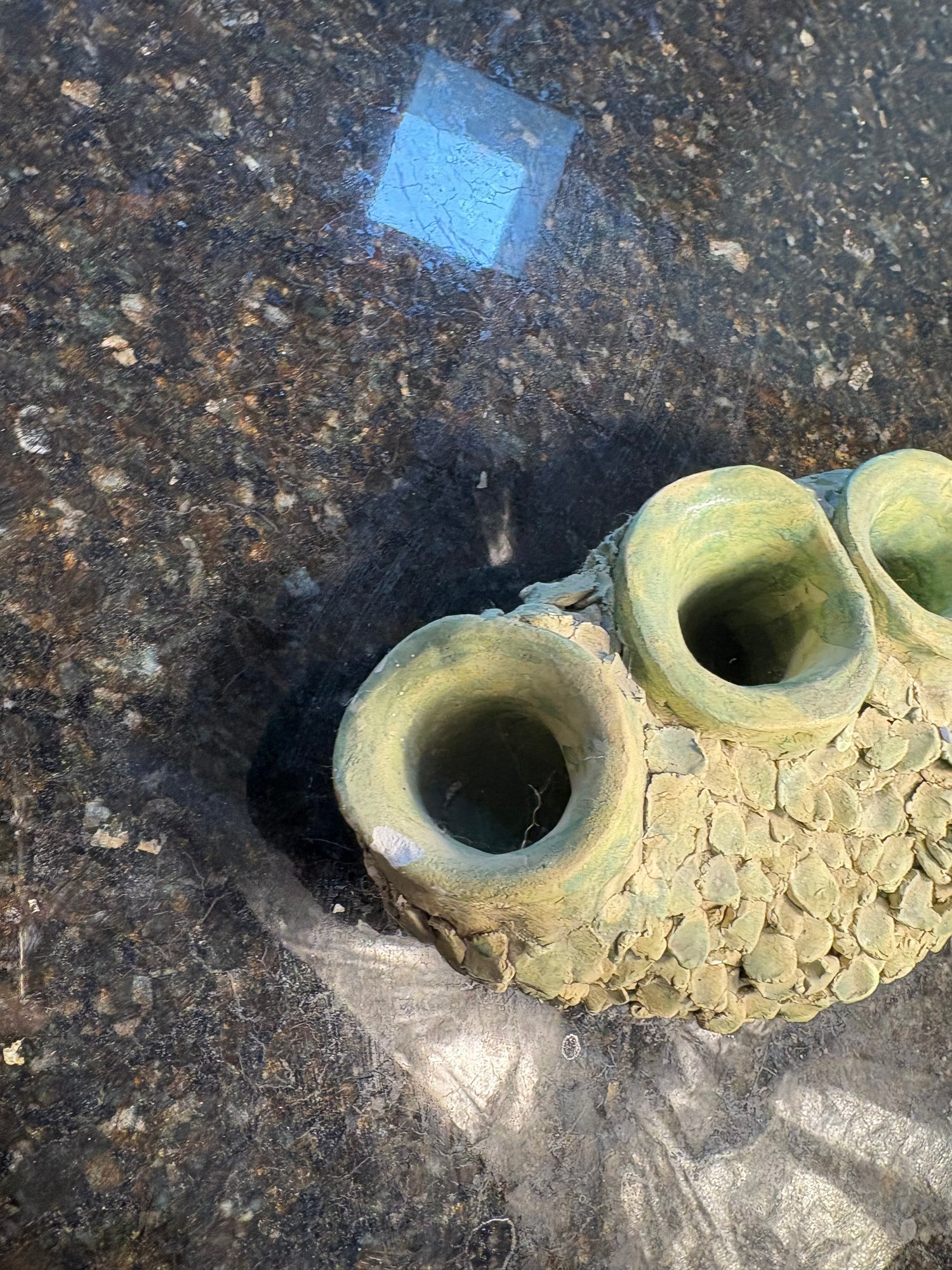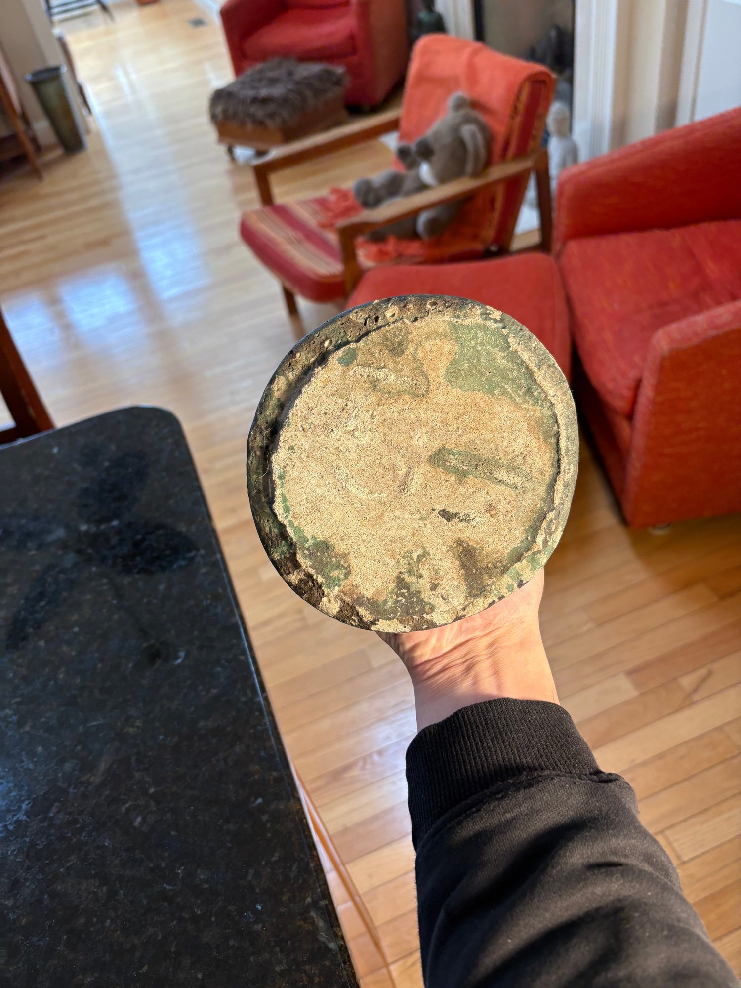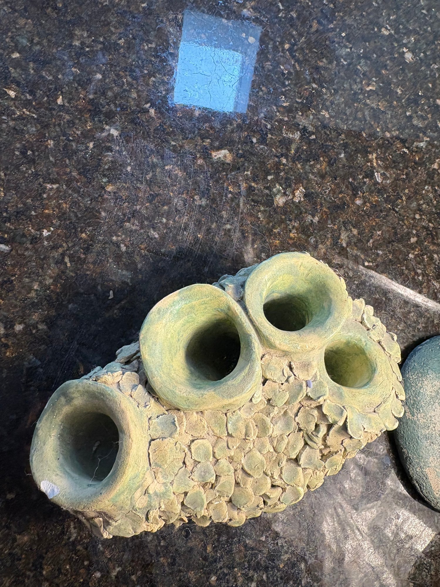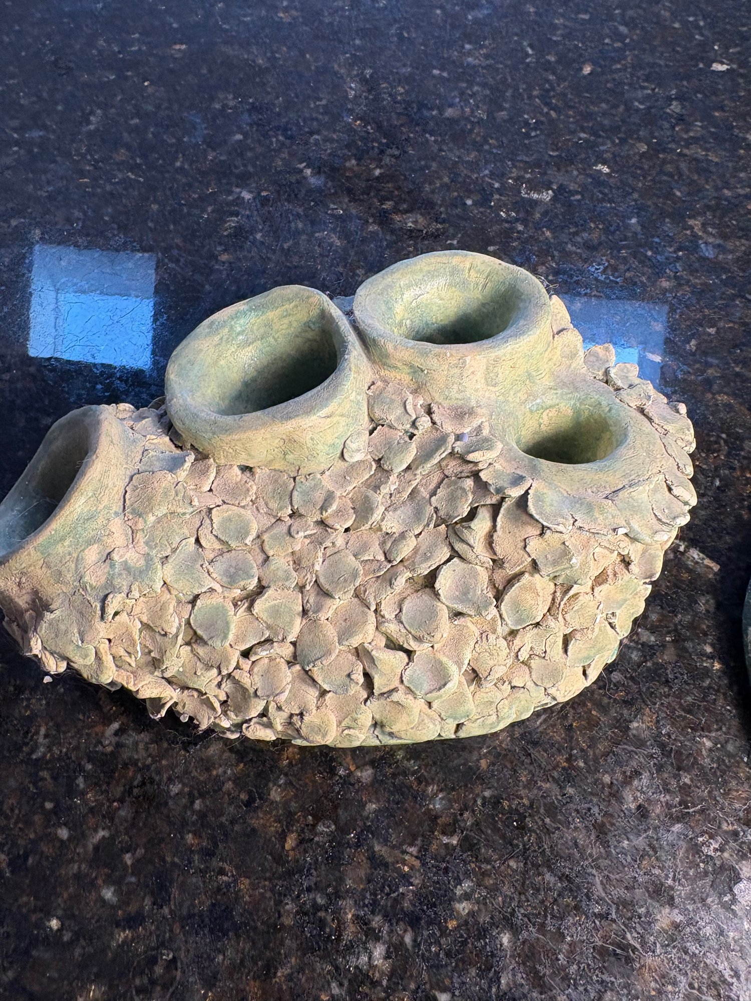 Outdoor frog statue approximately 6 inches in diameter. Signed pottery piece 10 inches long and 2.75 inches tall
