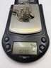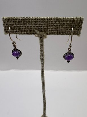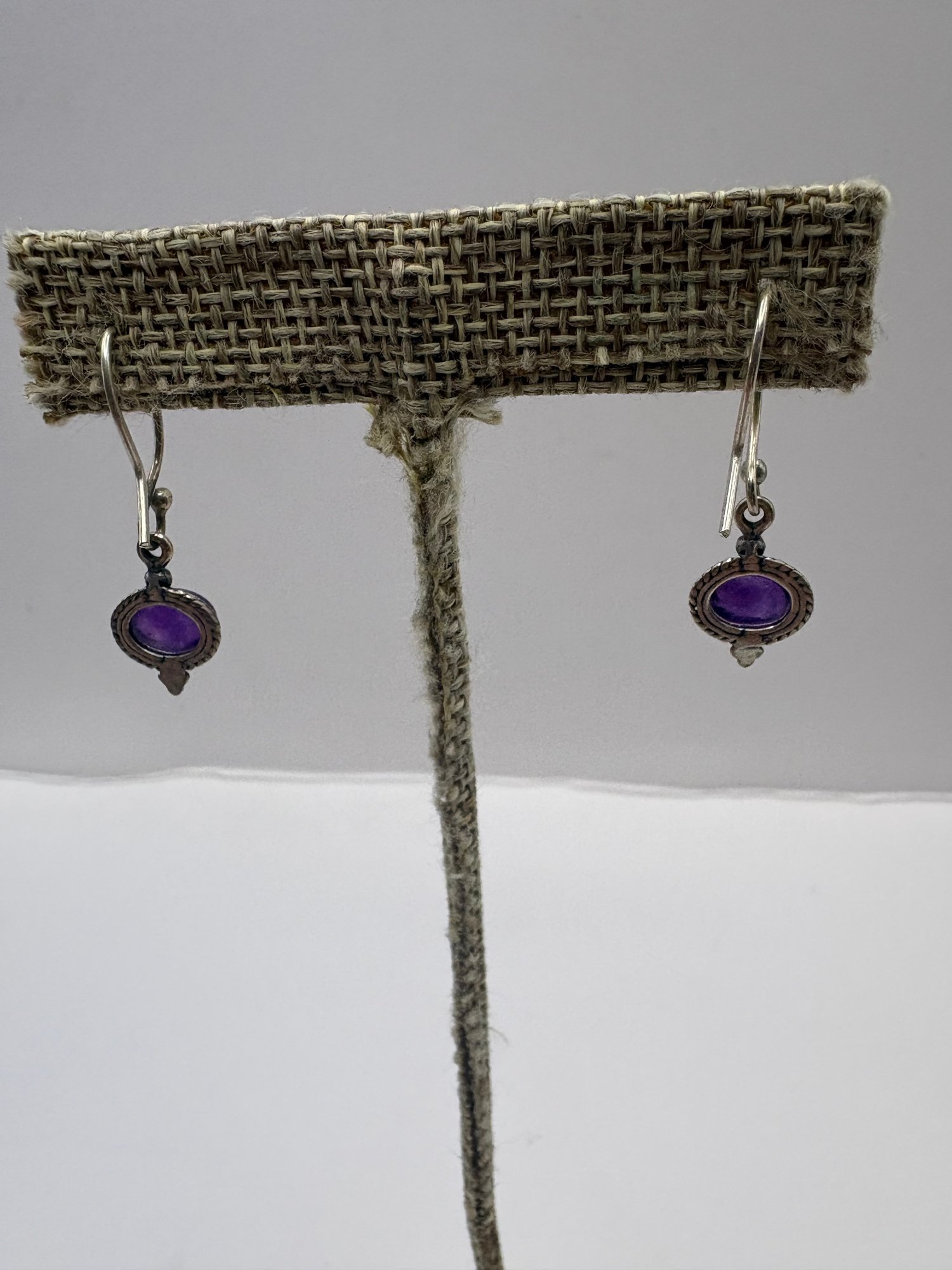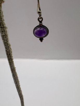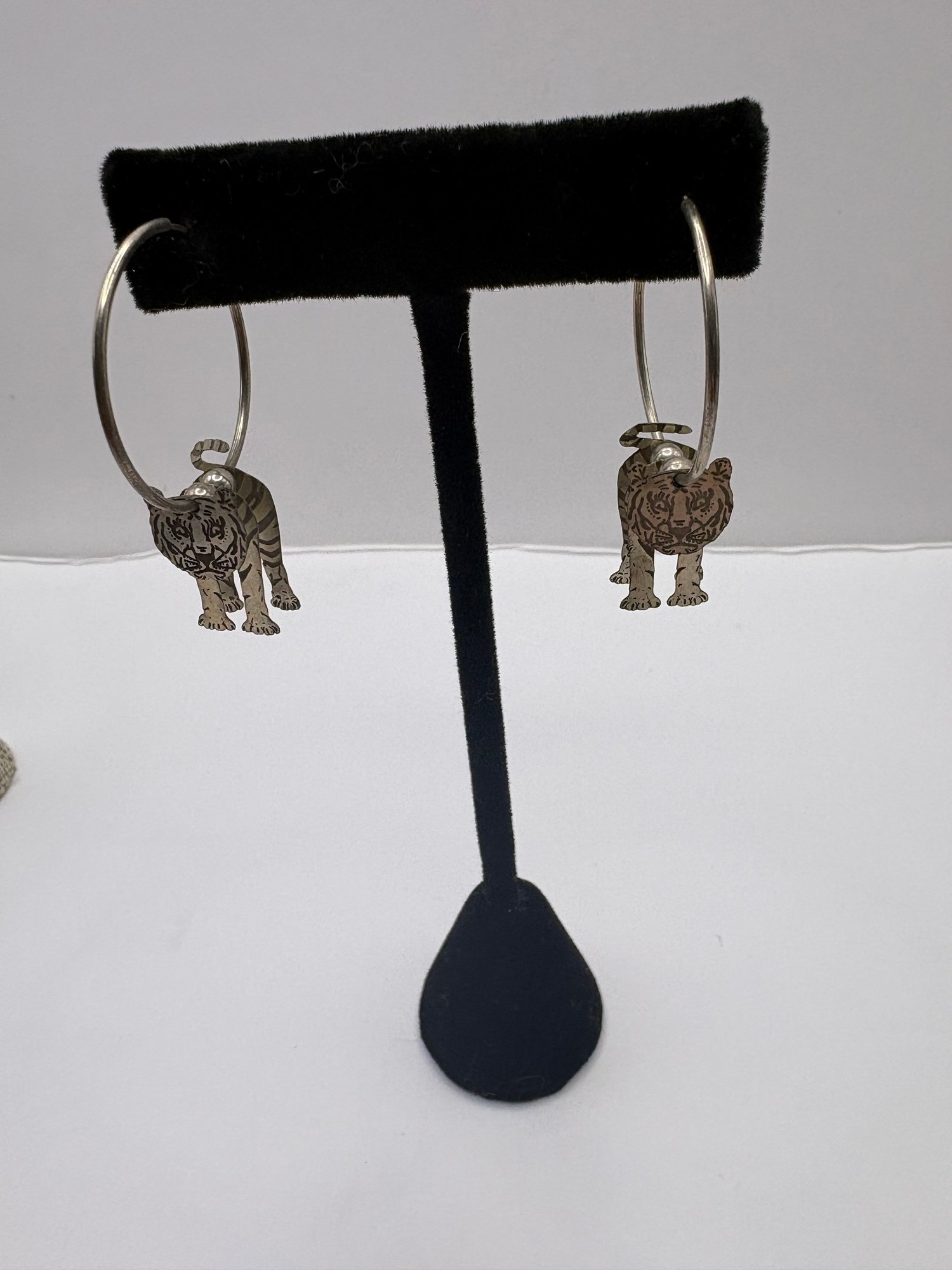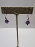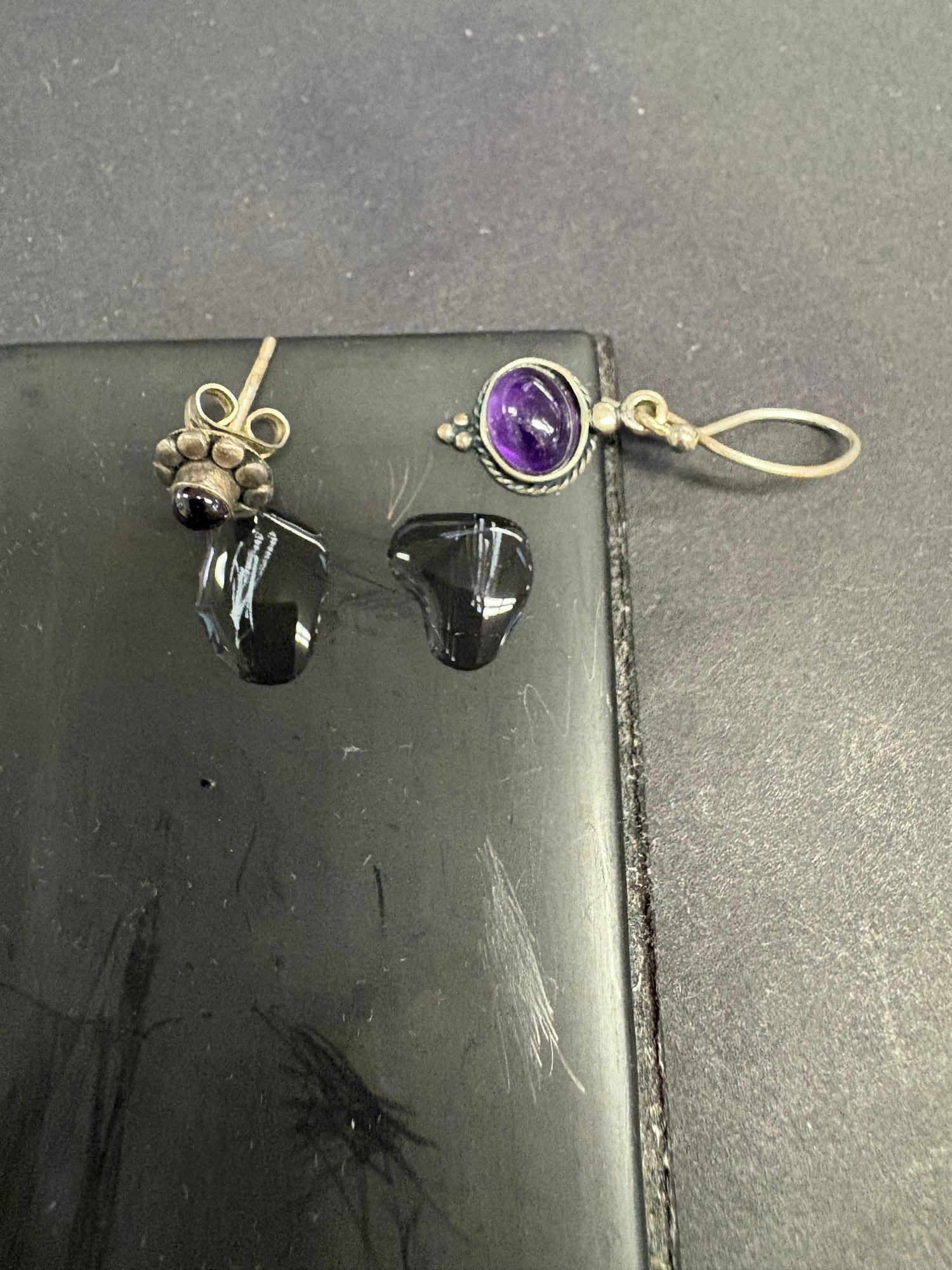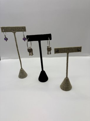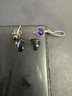 Three pairs of earrings and one of them is like a 3-D lion hoop, the other have maybe amethyst purple stone, and a flower with a purple stone studs