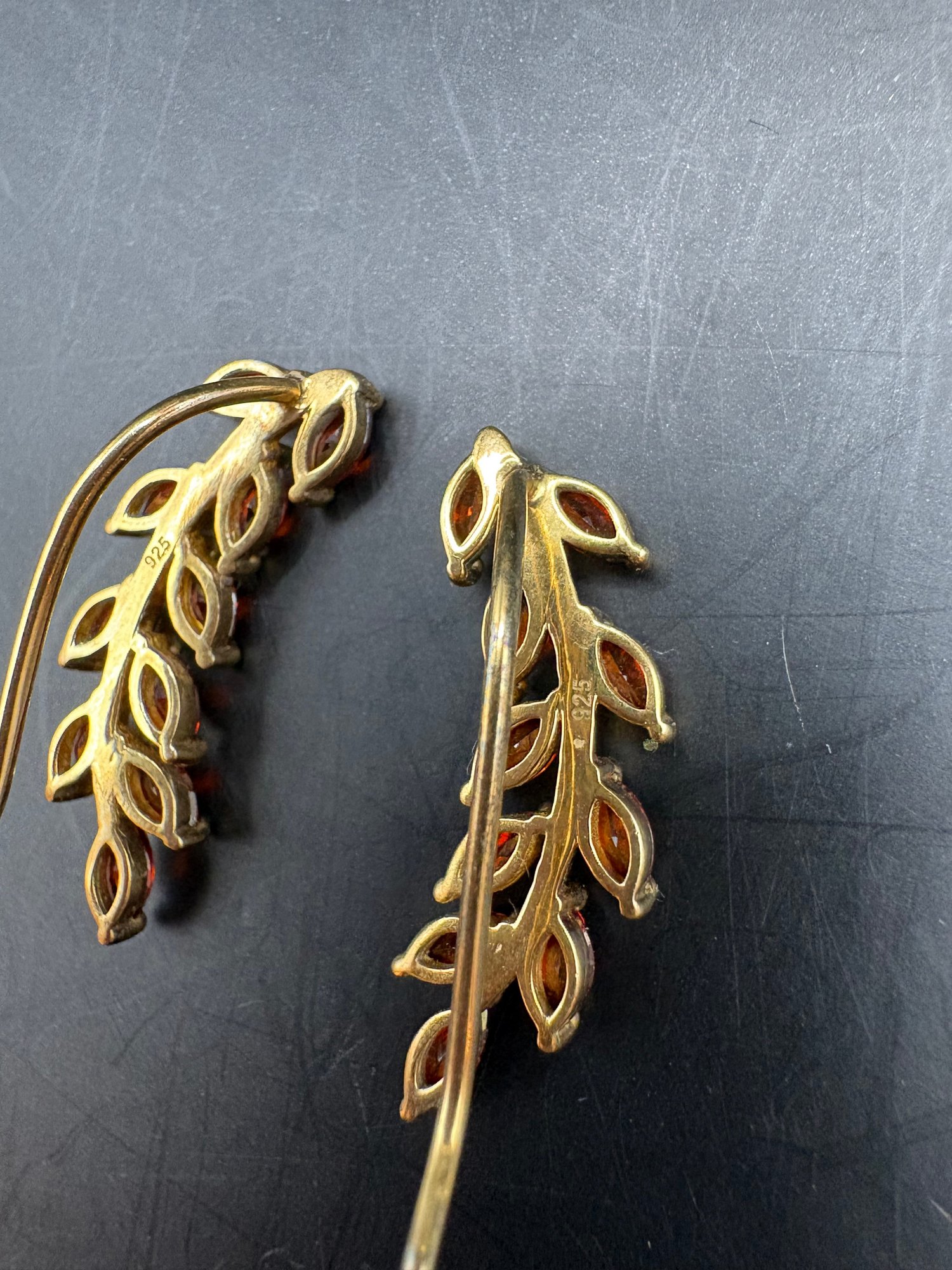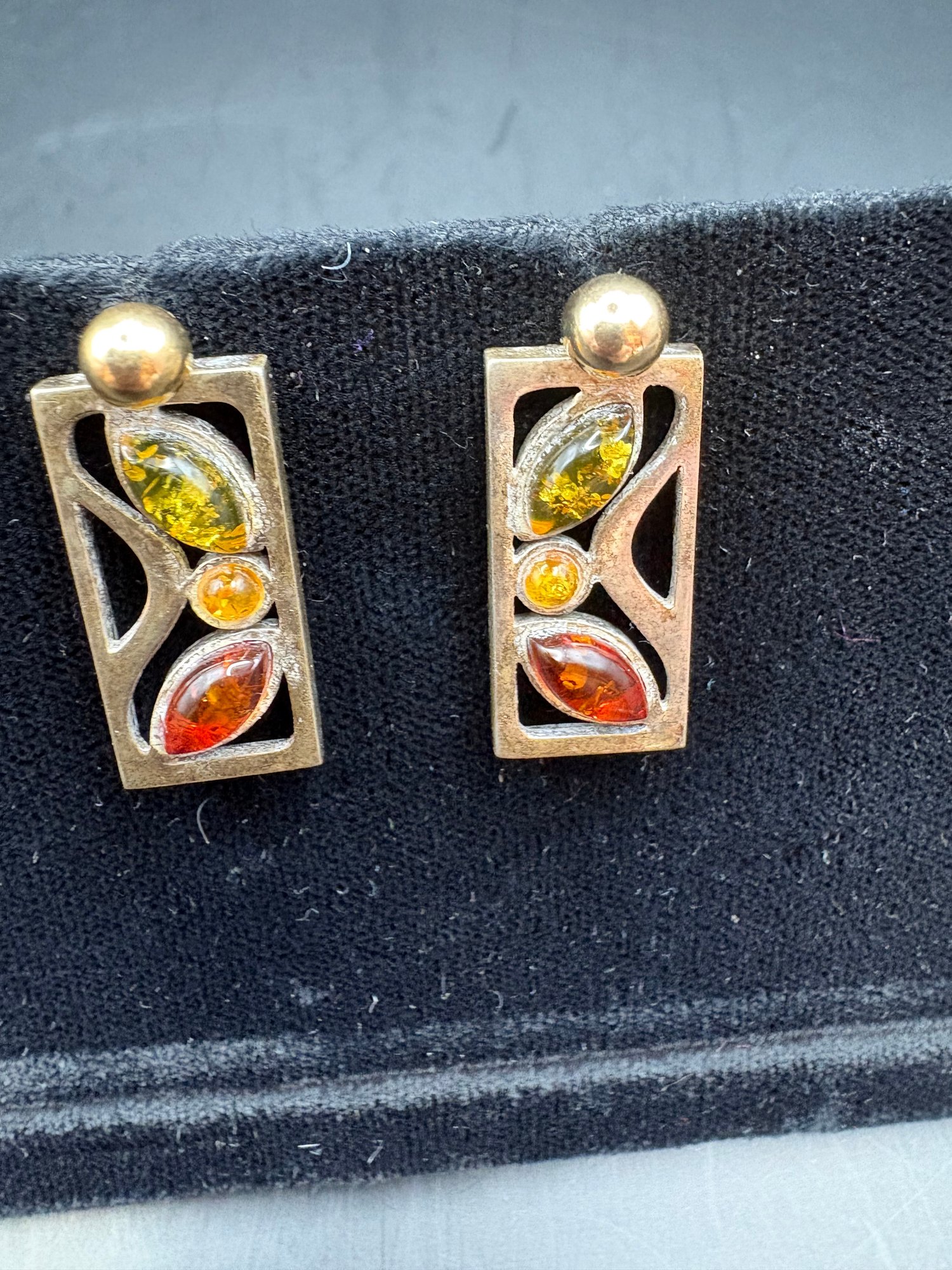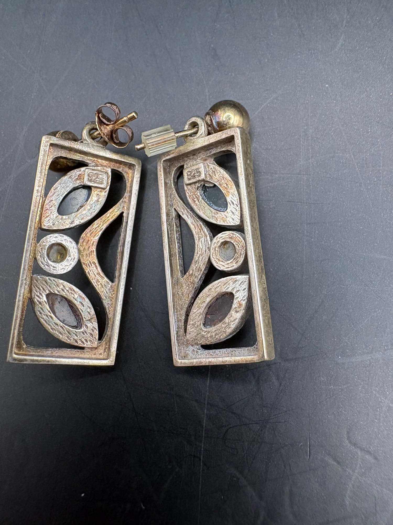 Three pairs of 925 sterling earrings with different gems, amber maybe citrine and the bird pen has five different color little birds with sparkly belly, gold tone on a branch 2 pairs Ozt. 0.2205.