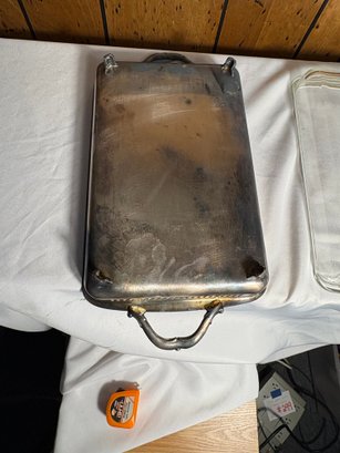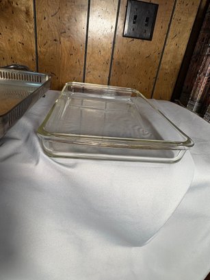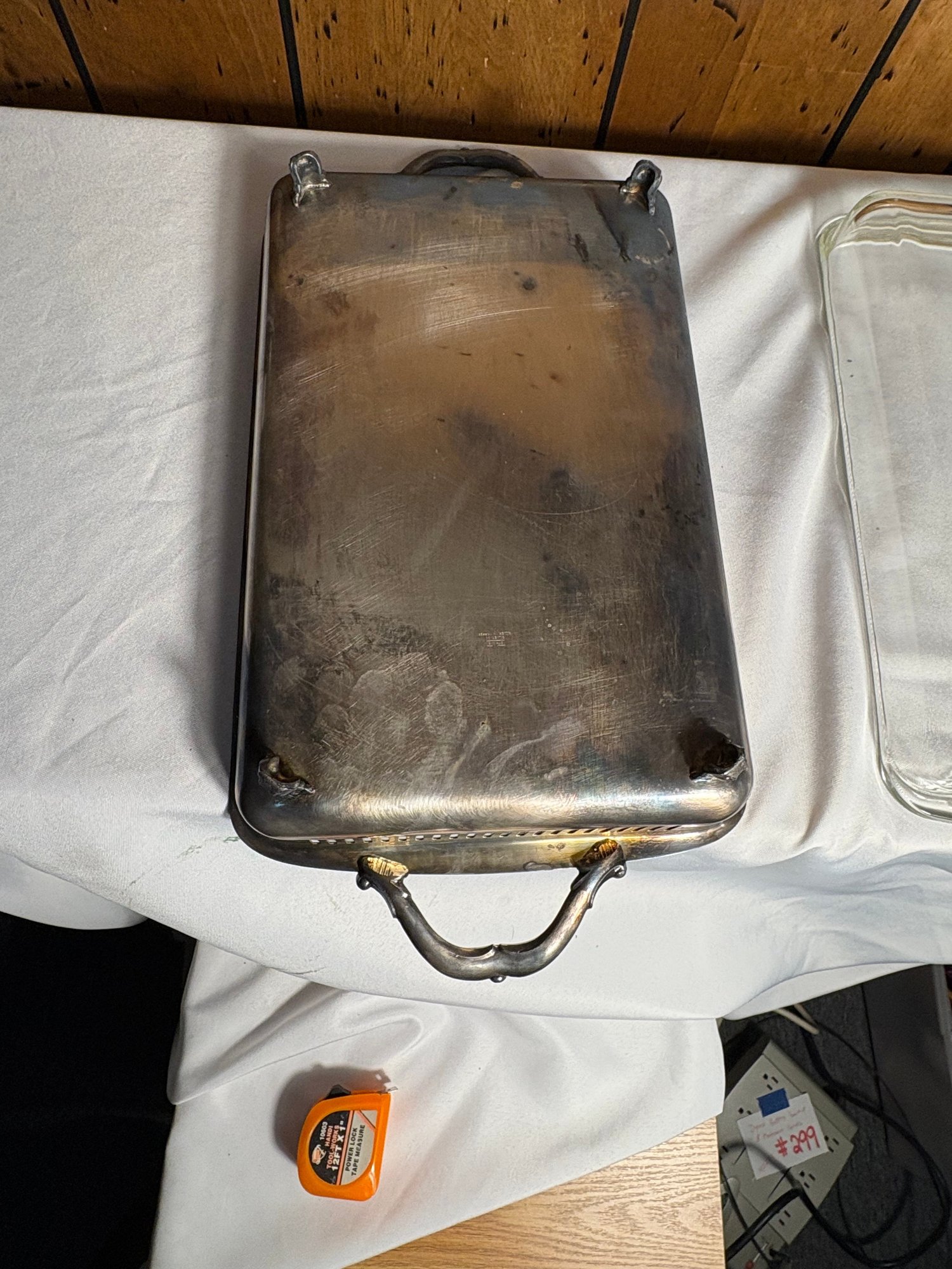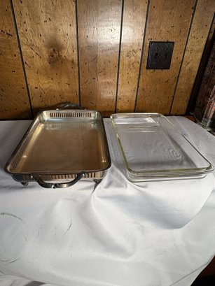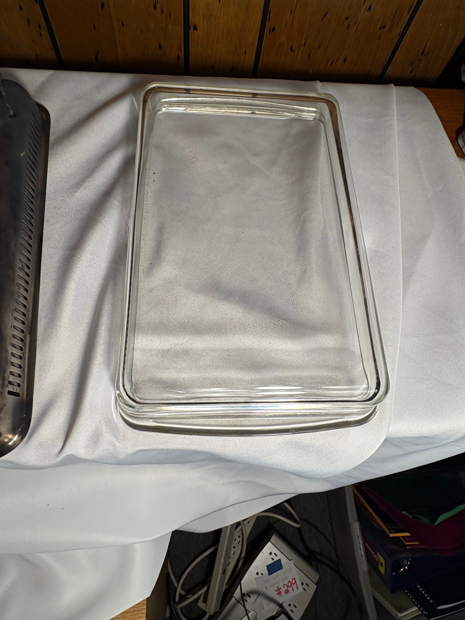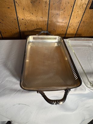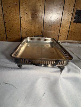 Dimensions approximately silver plated buffet dish 19 by 9. Casserole dish approximately 15.25 by 9