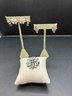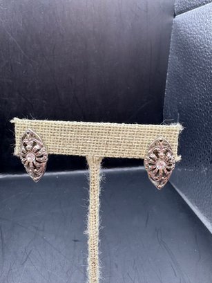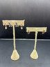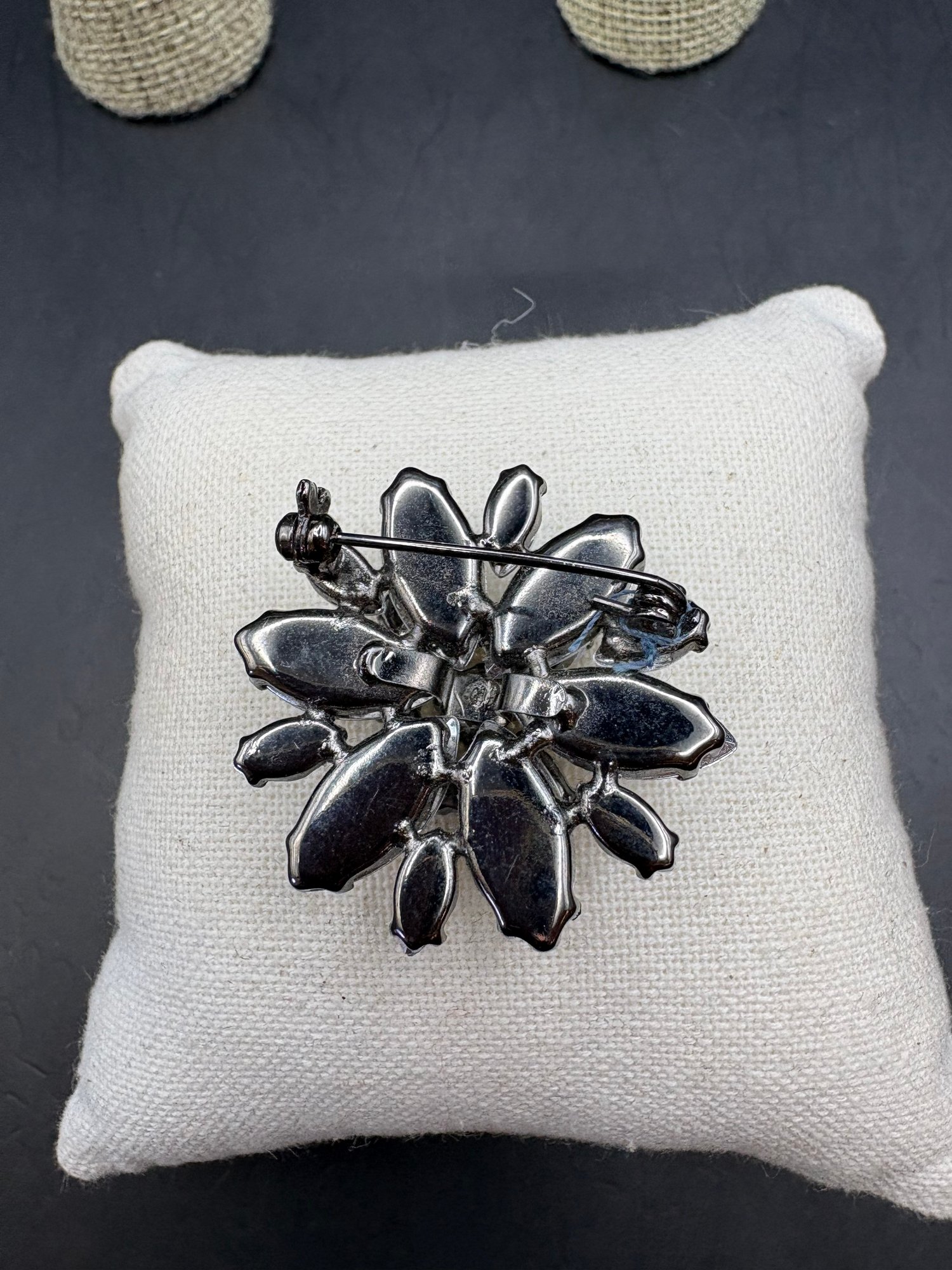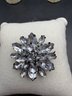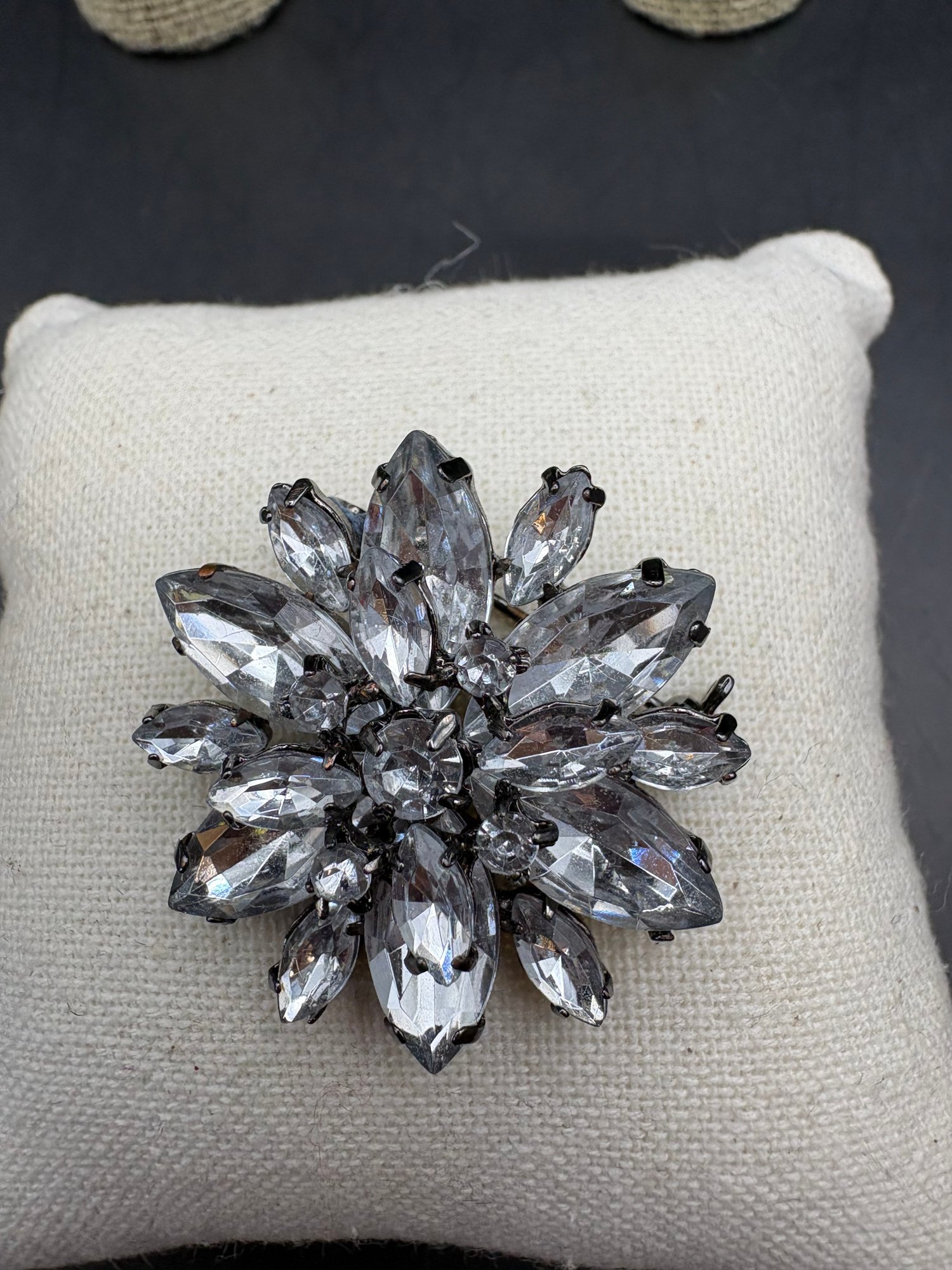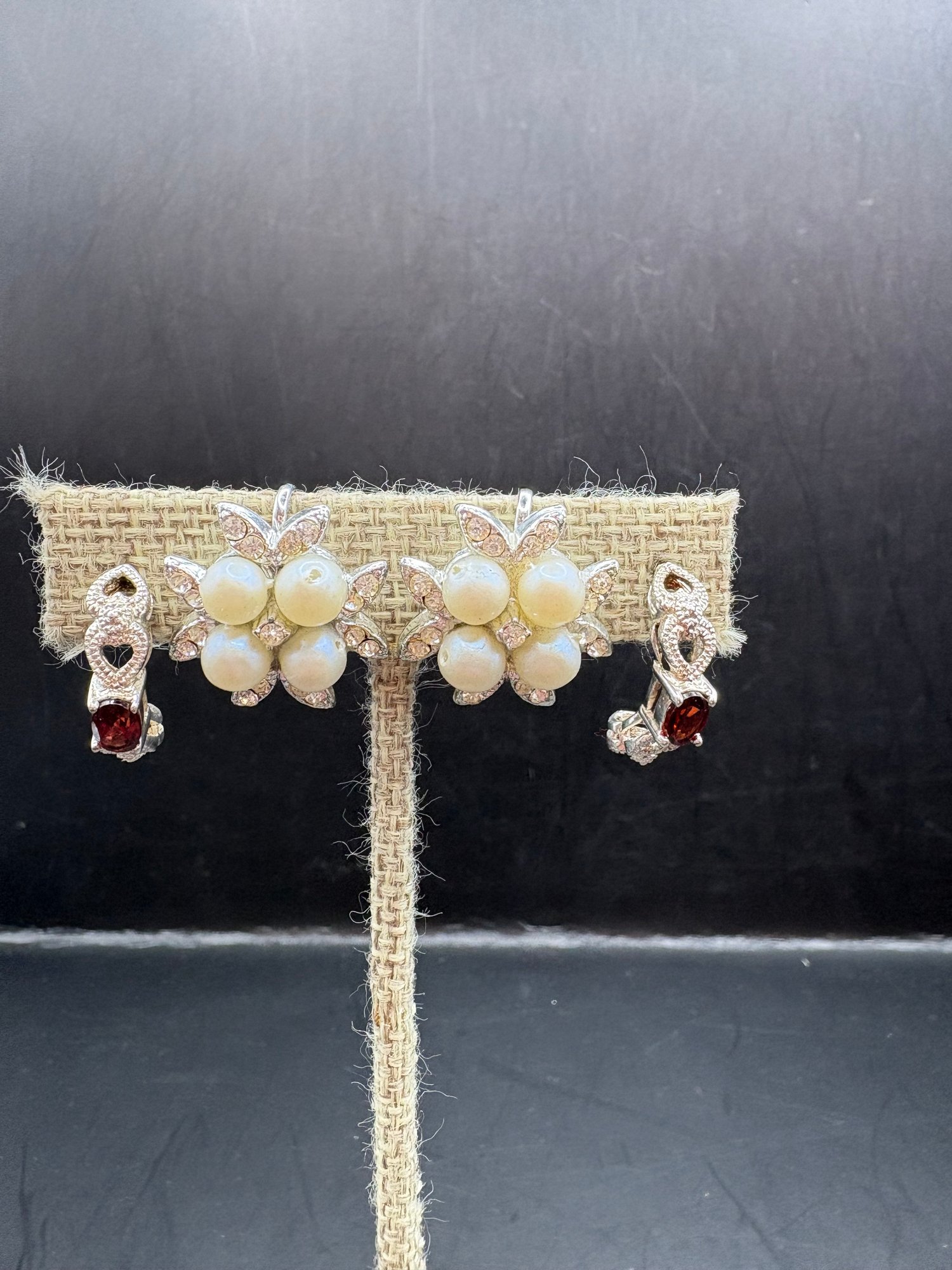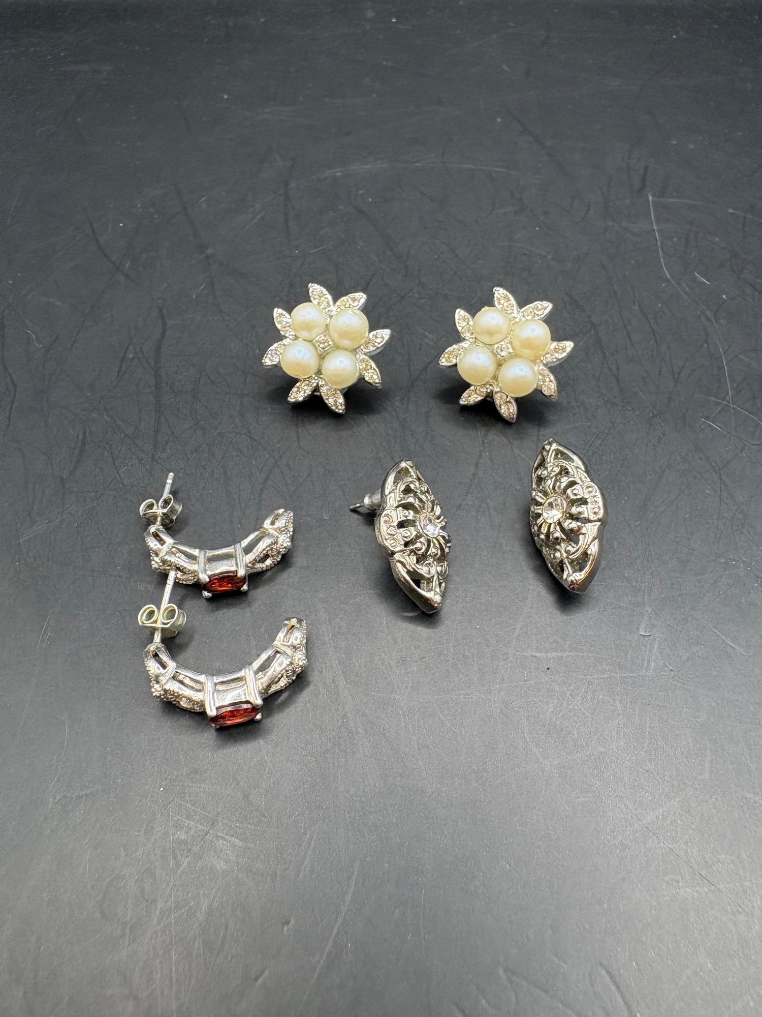 Two pair of silver toe earrings, a pair of clip on faux pearl earrings, and a crystal brooch
