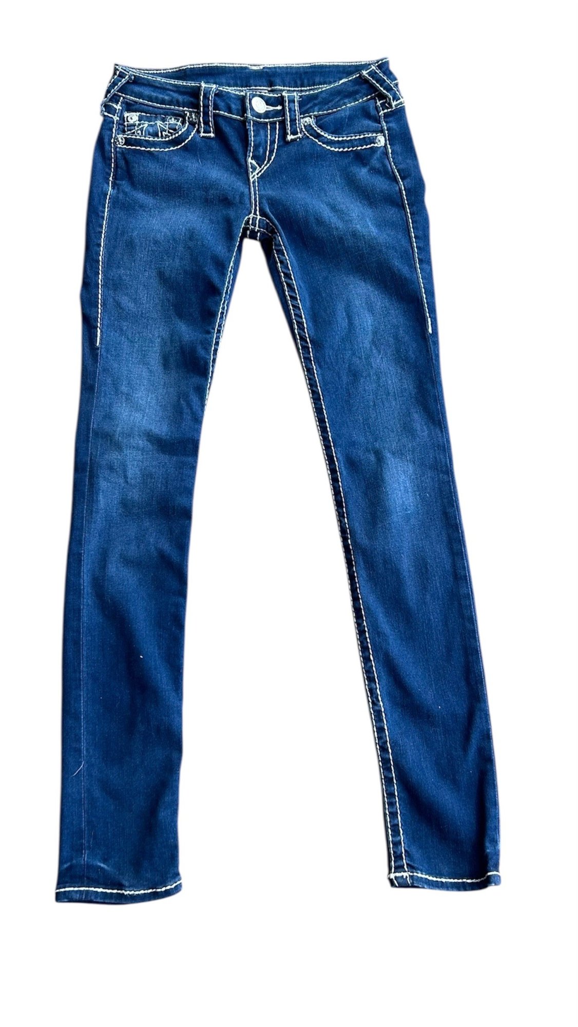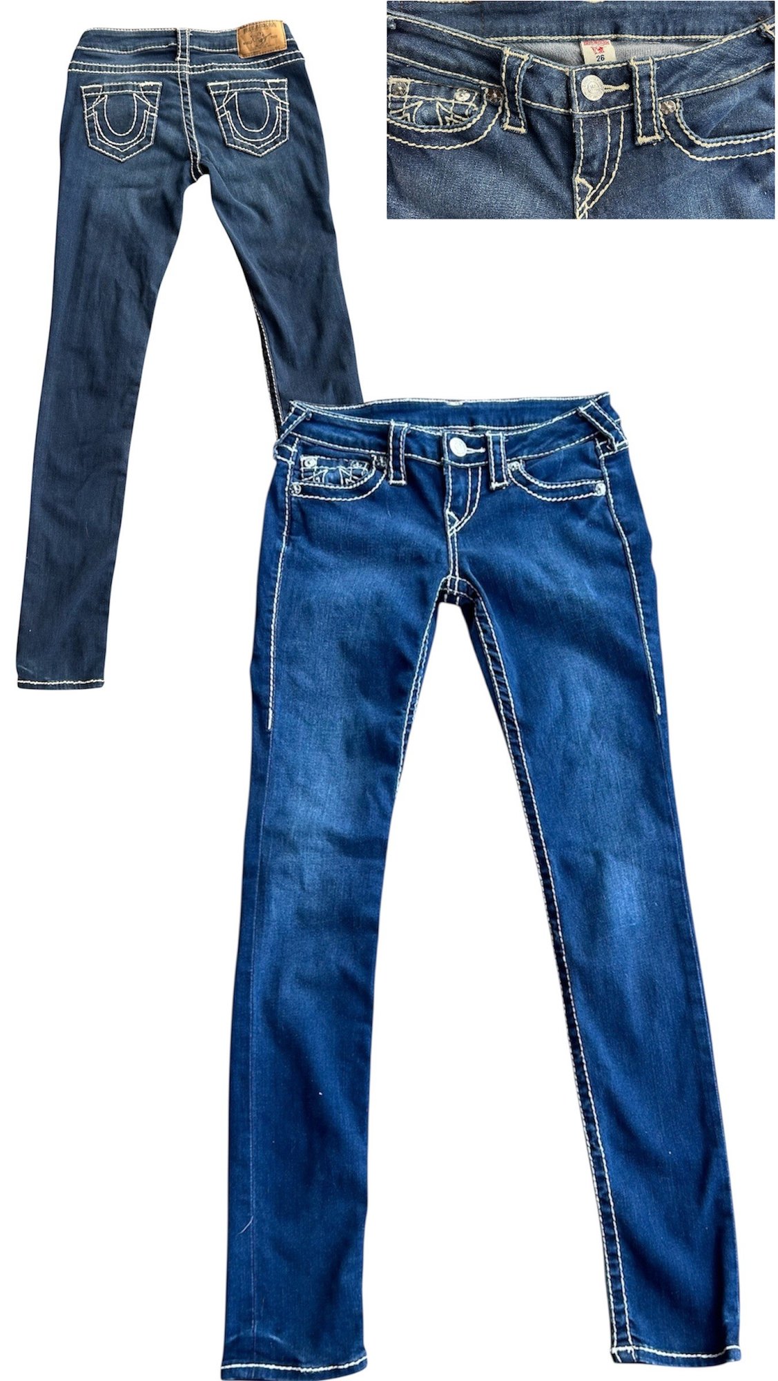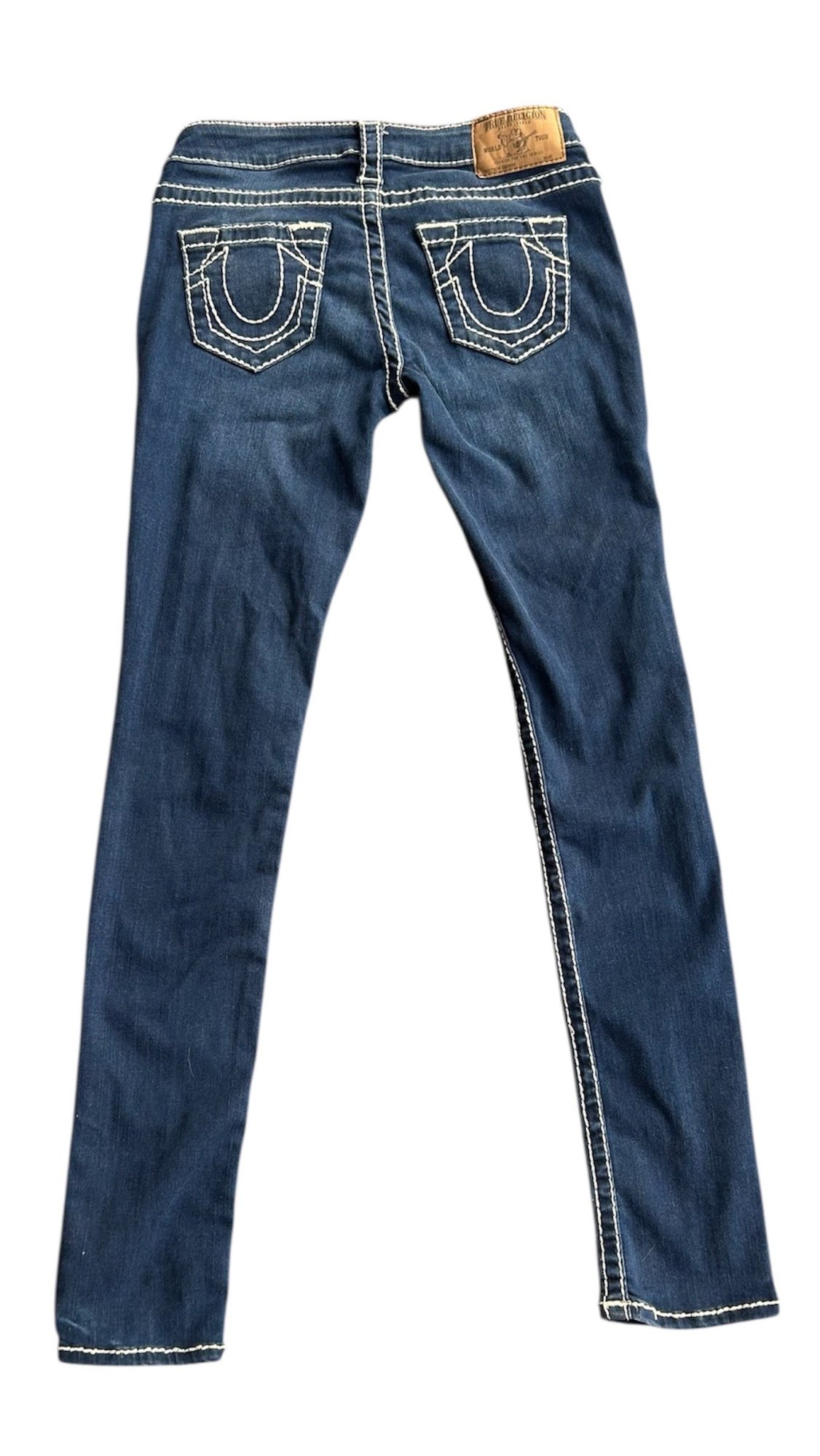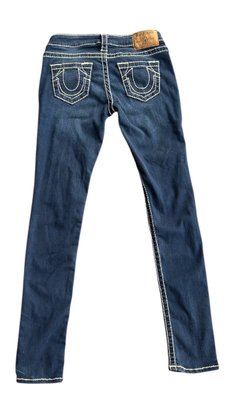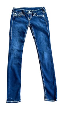 Iconic True Religion jeans with contrast white stitching and signature horseshoe embroidered back pockets. Slim fit style with a dark wash finish.