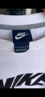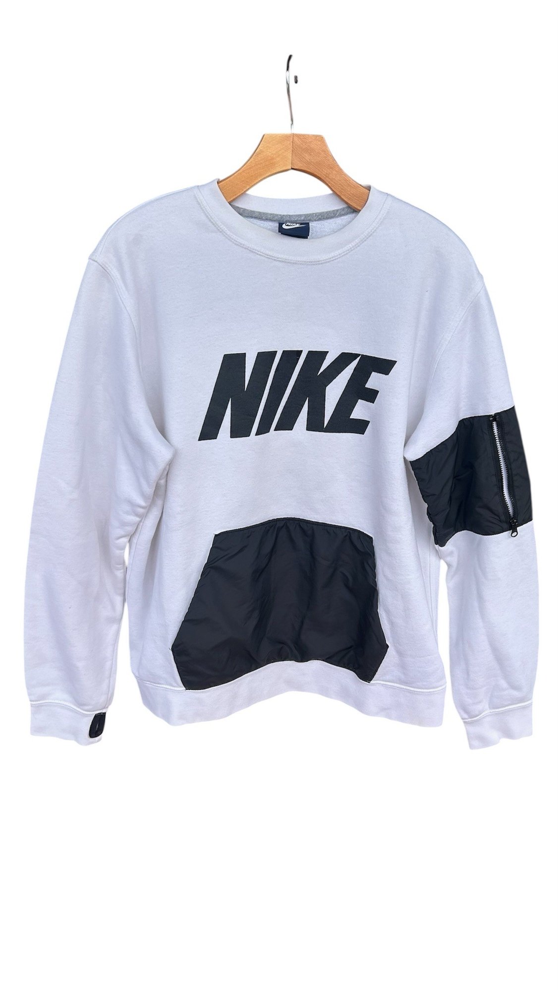 Nike sweatshirt featuring black chest logo, black nylon kangaroo pocket, and sleeve zipper detailing.