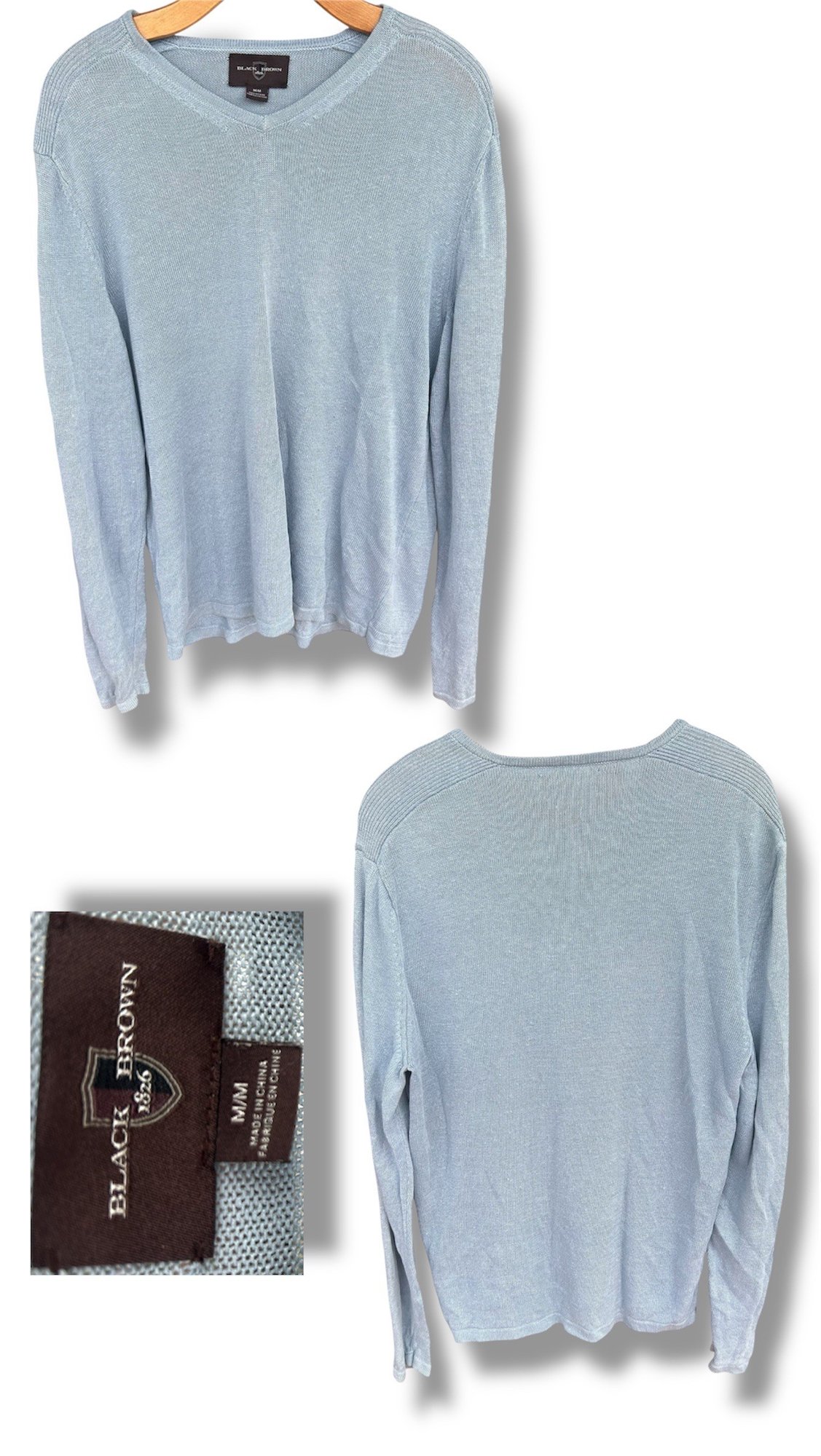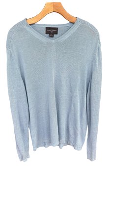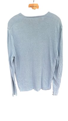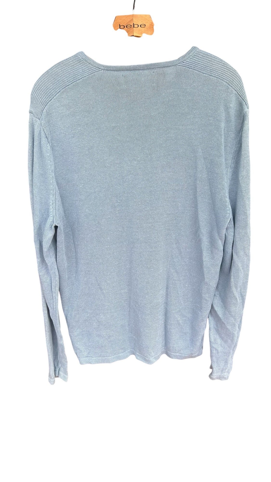 Minimalist long sleeve knit sweater in a soft light blue shade. Lightweight cotton blend, versatile for layering or worn alone in a smart casual style.