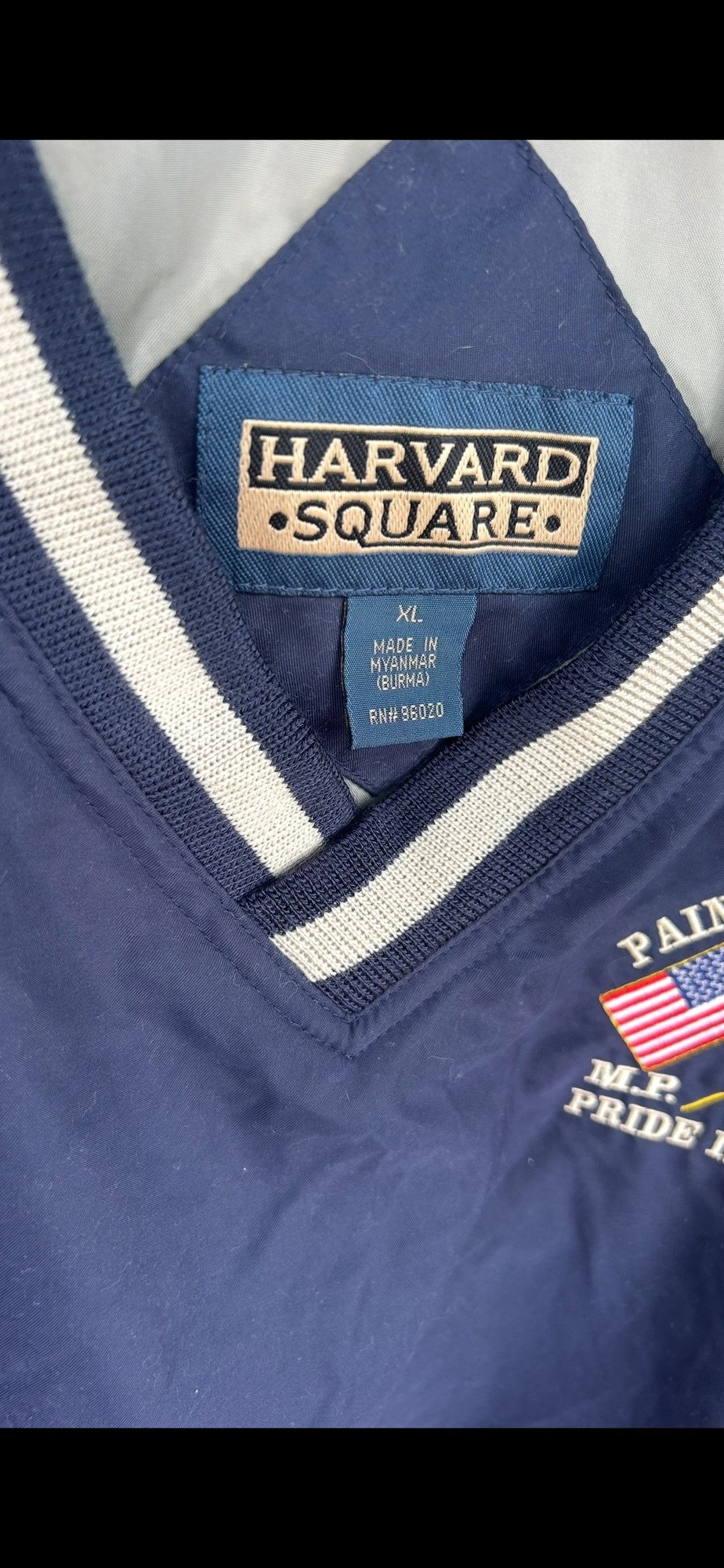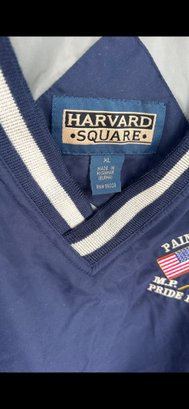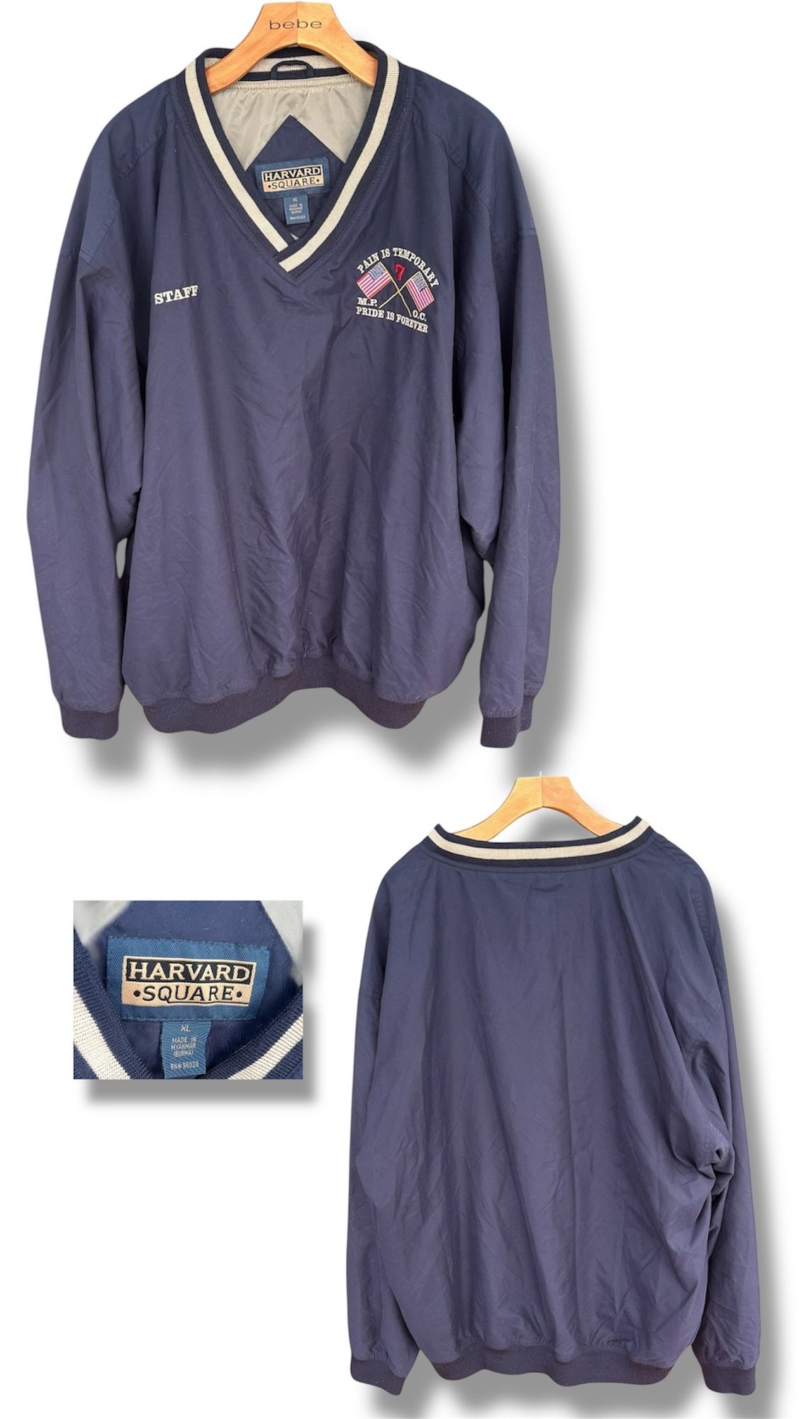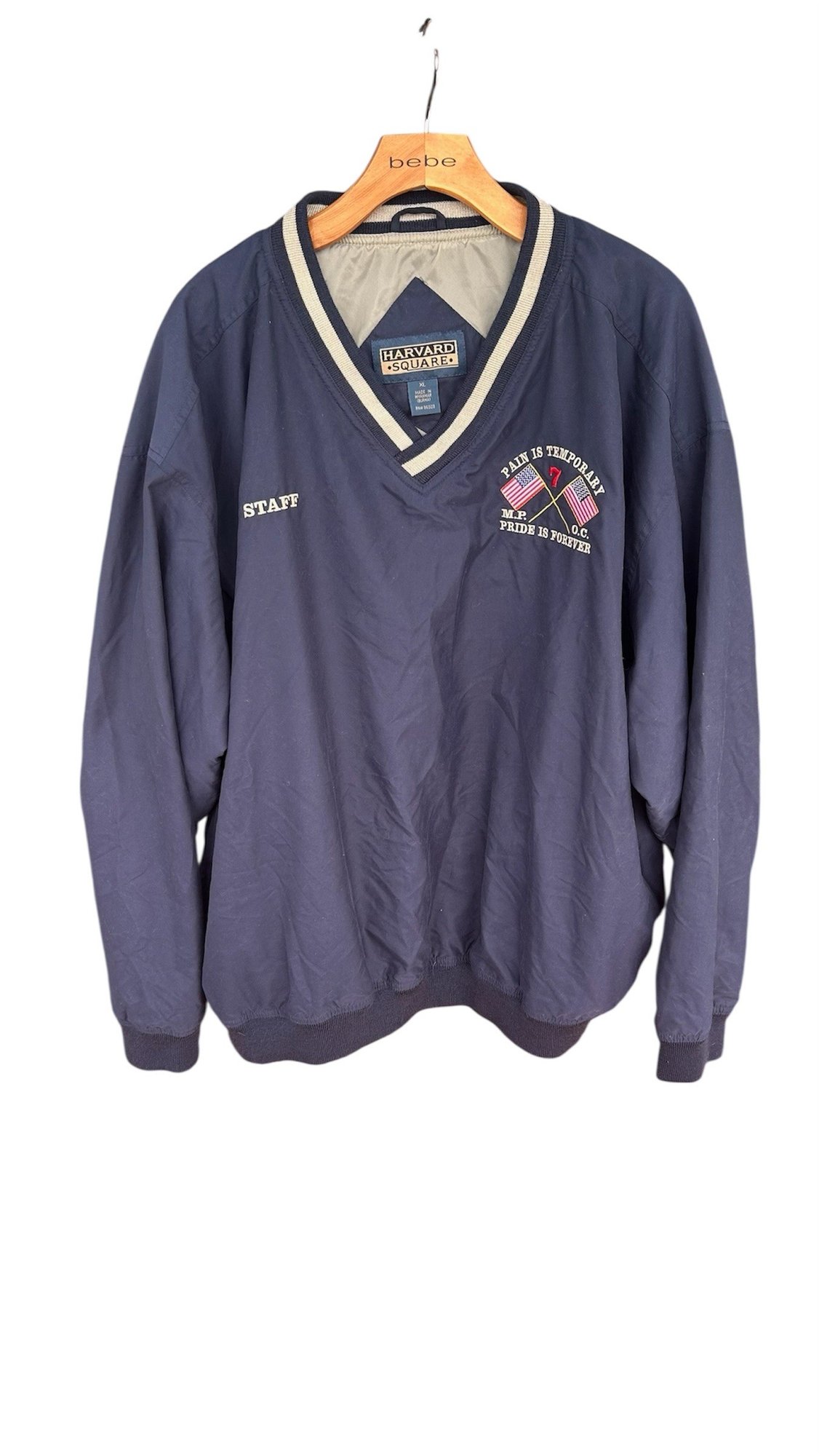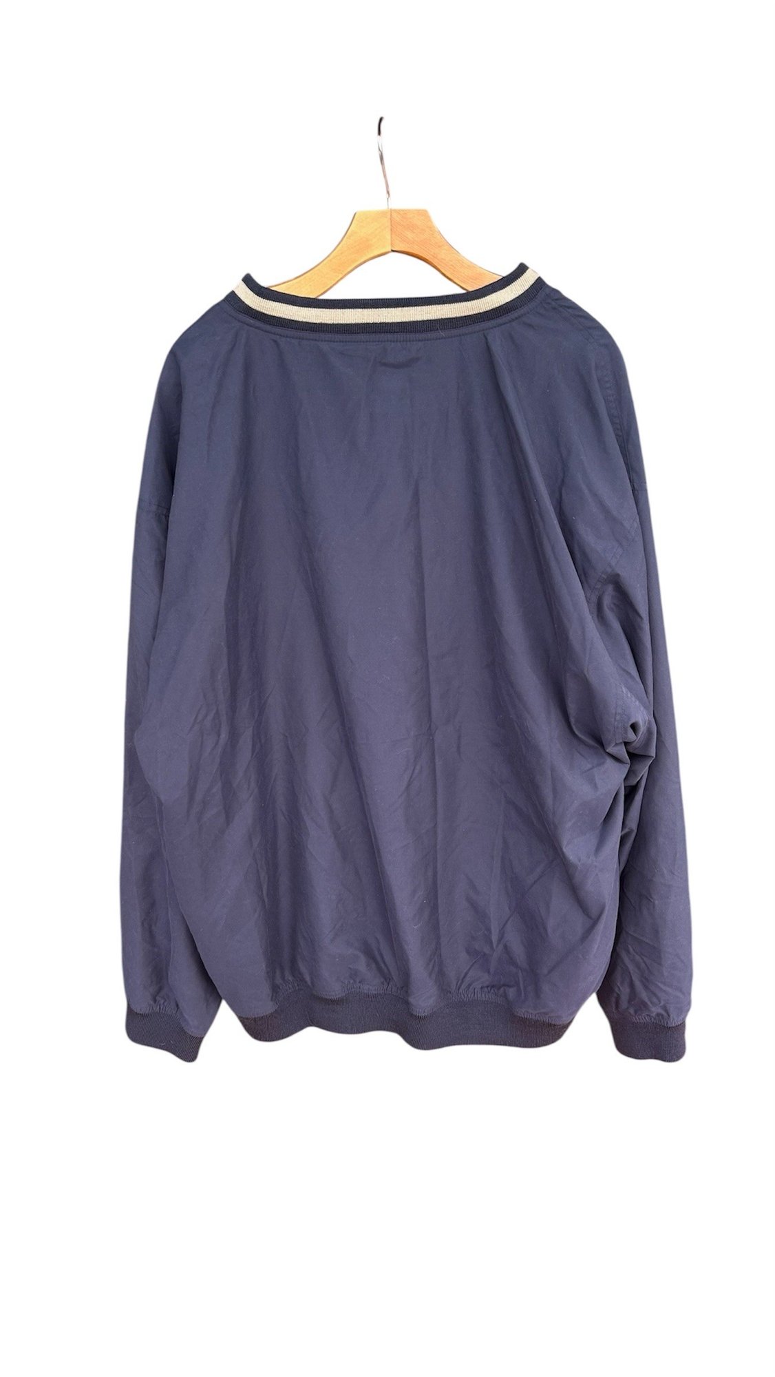 Classic pullover windbreaker with V-neck striped collar, “Staff” embroidery, and golf crest logo. Lightweight with elastic cuffs and hem.