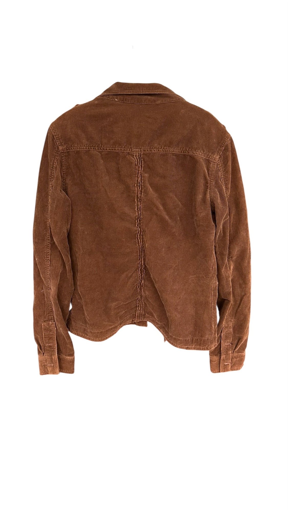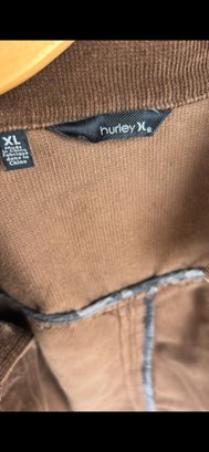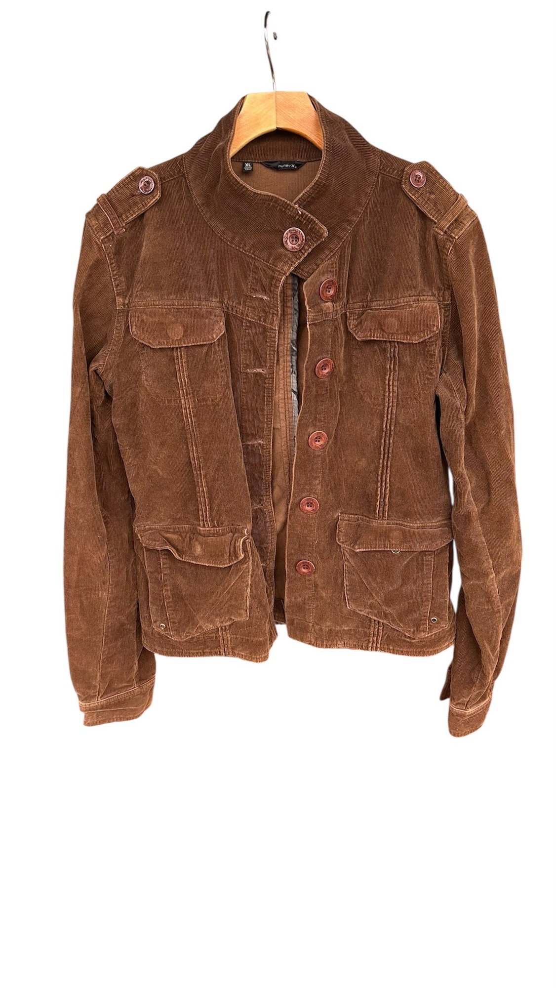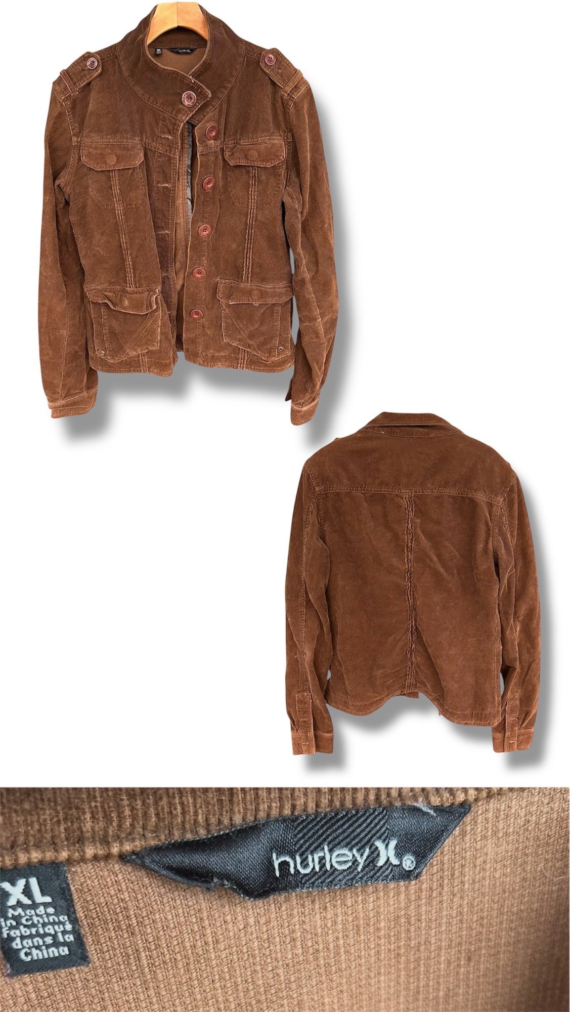 Stylish Hurley corduroy jacket with military-inspired details including flap pockets, buttoned epaulets, and a stand collar. Rich brown corduroy gives a vintage yet versatile look.