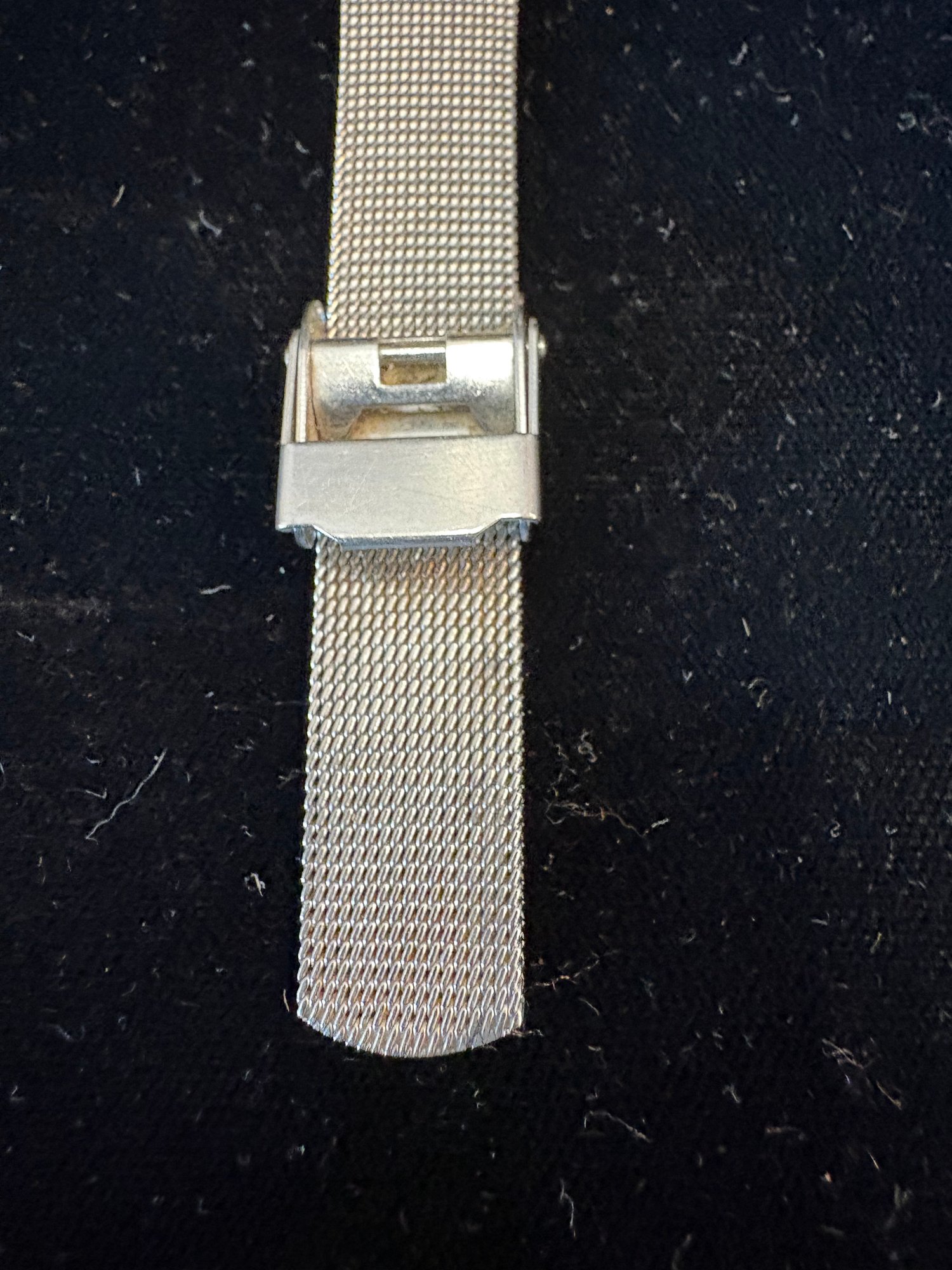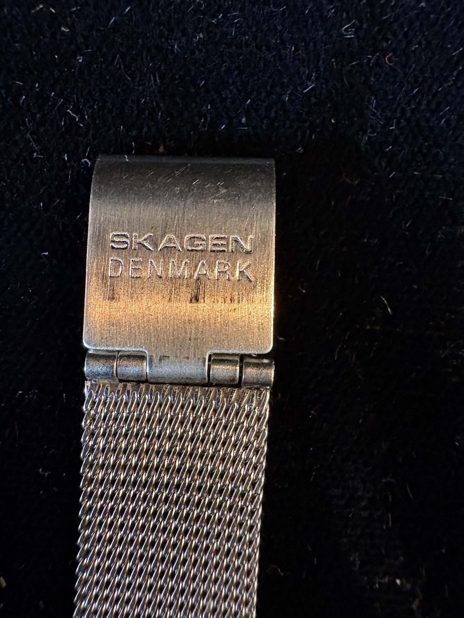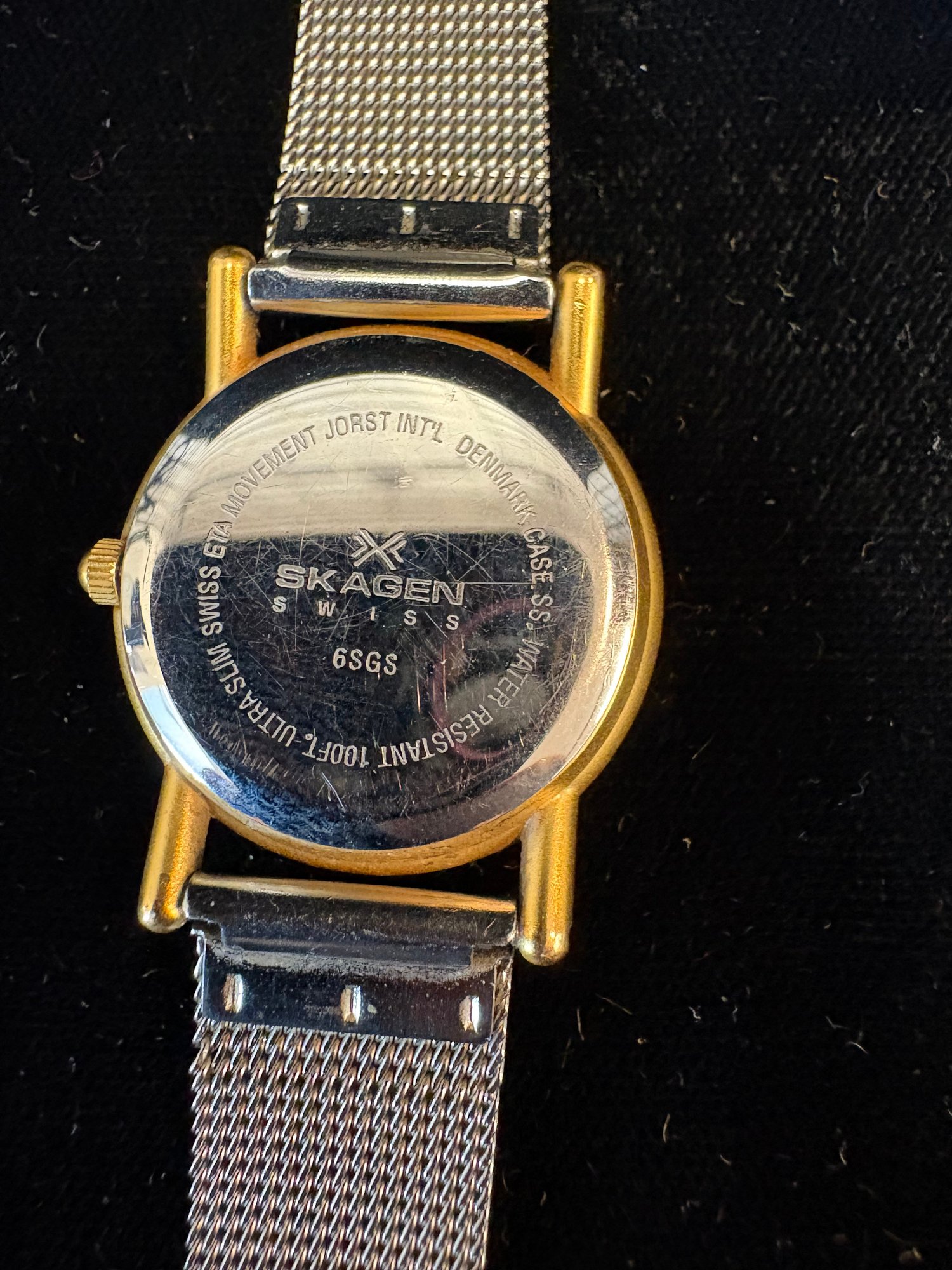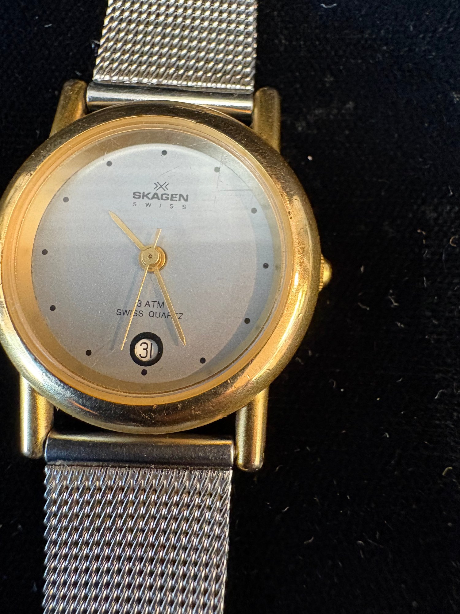 Skagen Denmark watch with a two-tone silver and gold stainless steel mesh band, a gold bezel, and a silver dial
