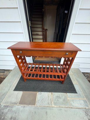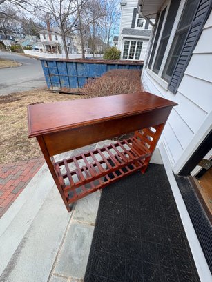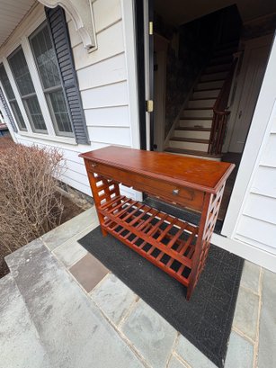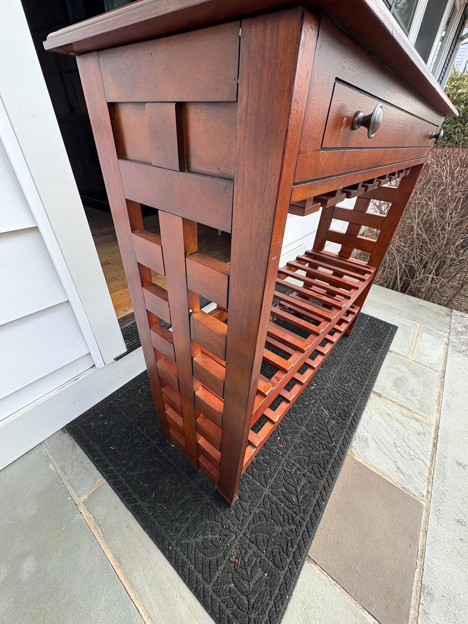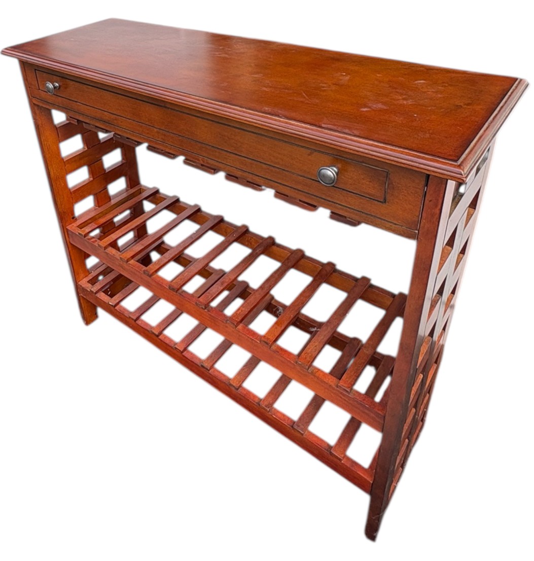 Drawer on the wine rack is fake. Does not actually open!!. Dimensions approximately 40 by 13.75 by 36.5 inches tall