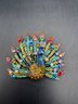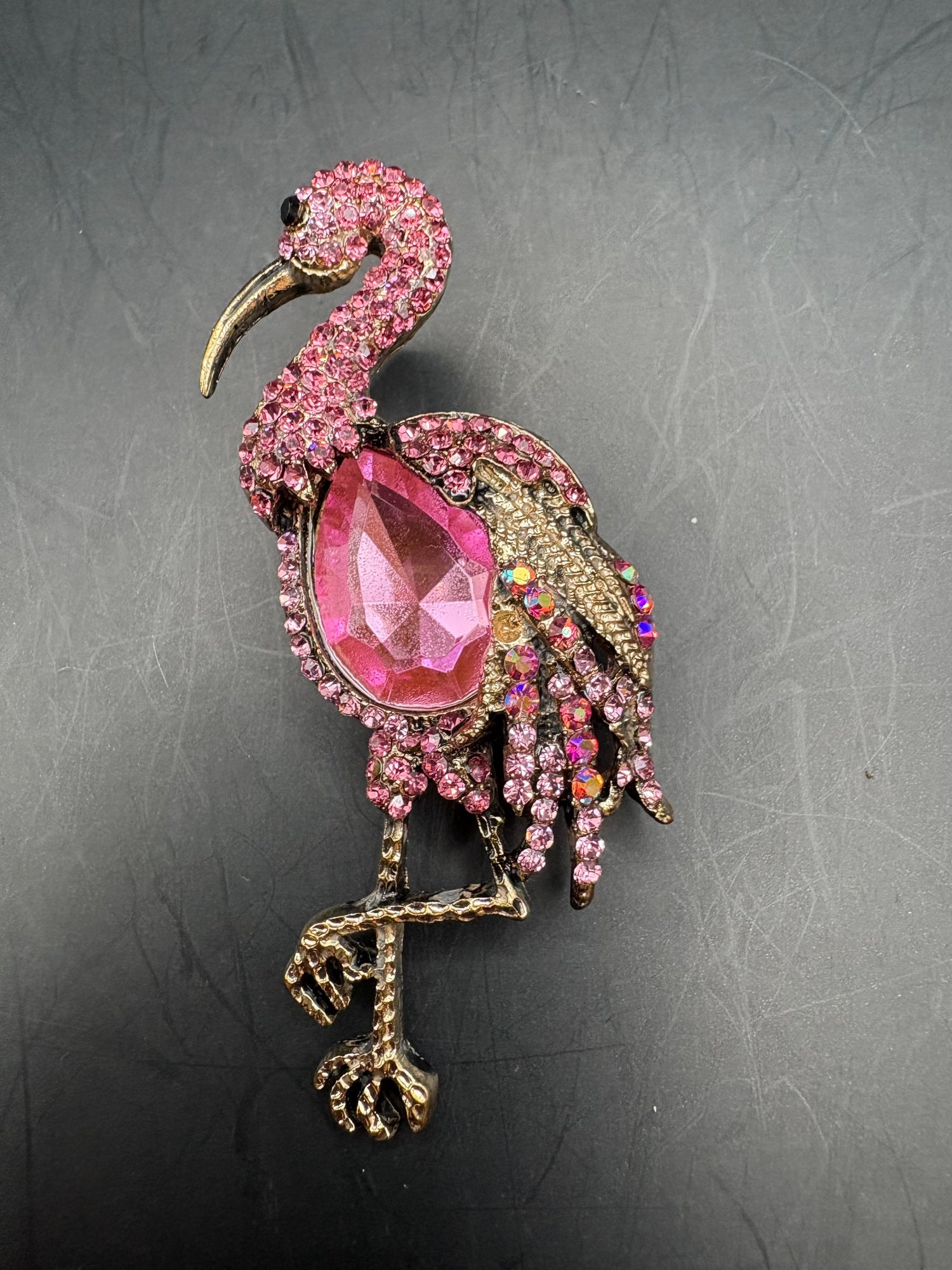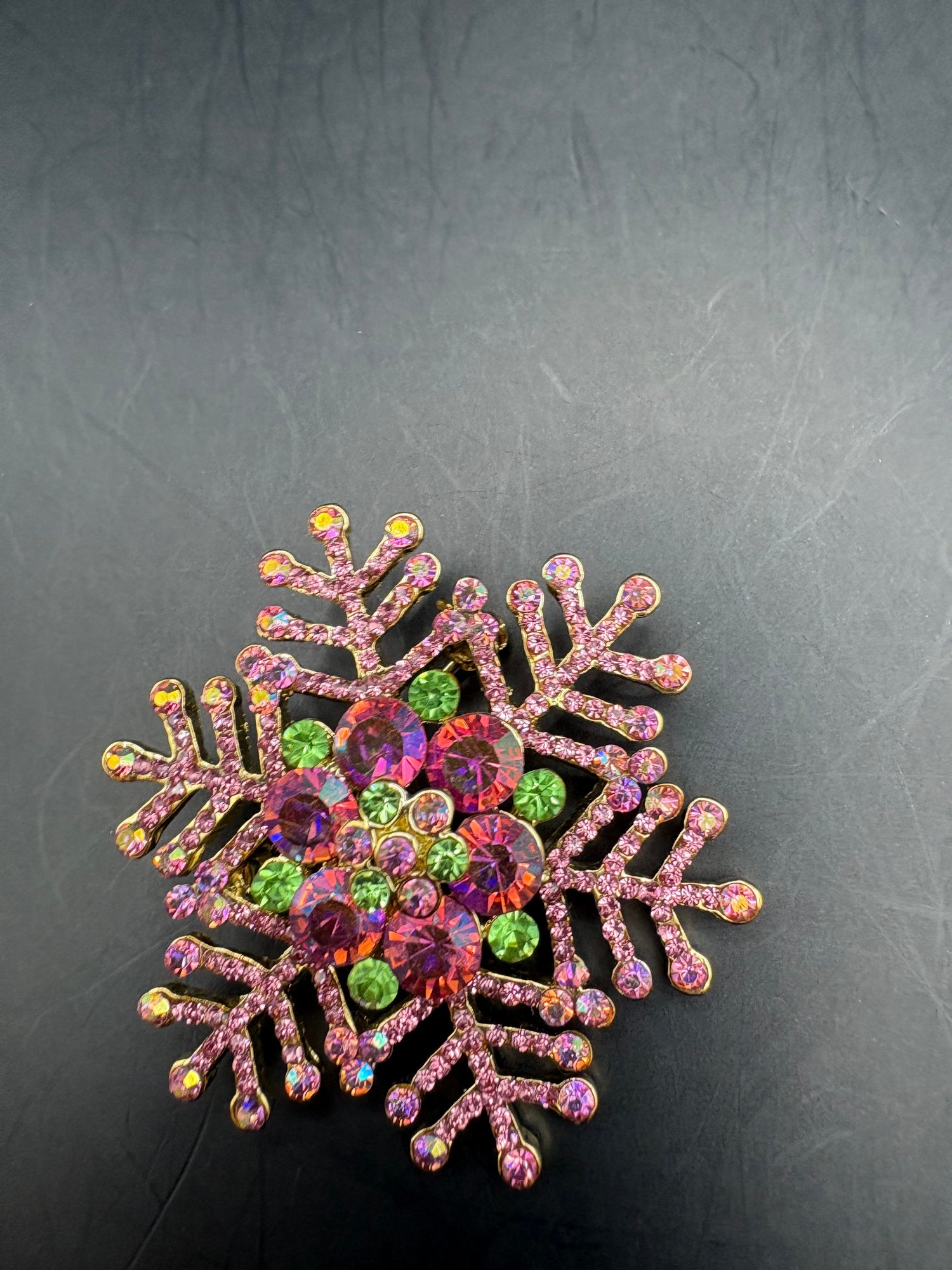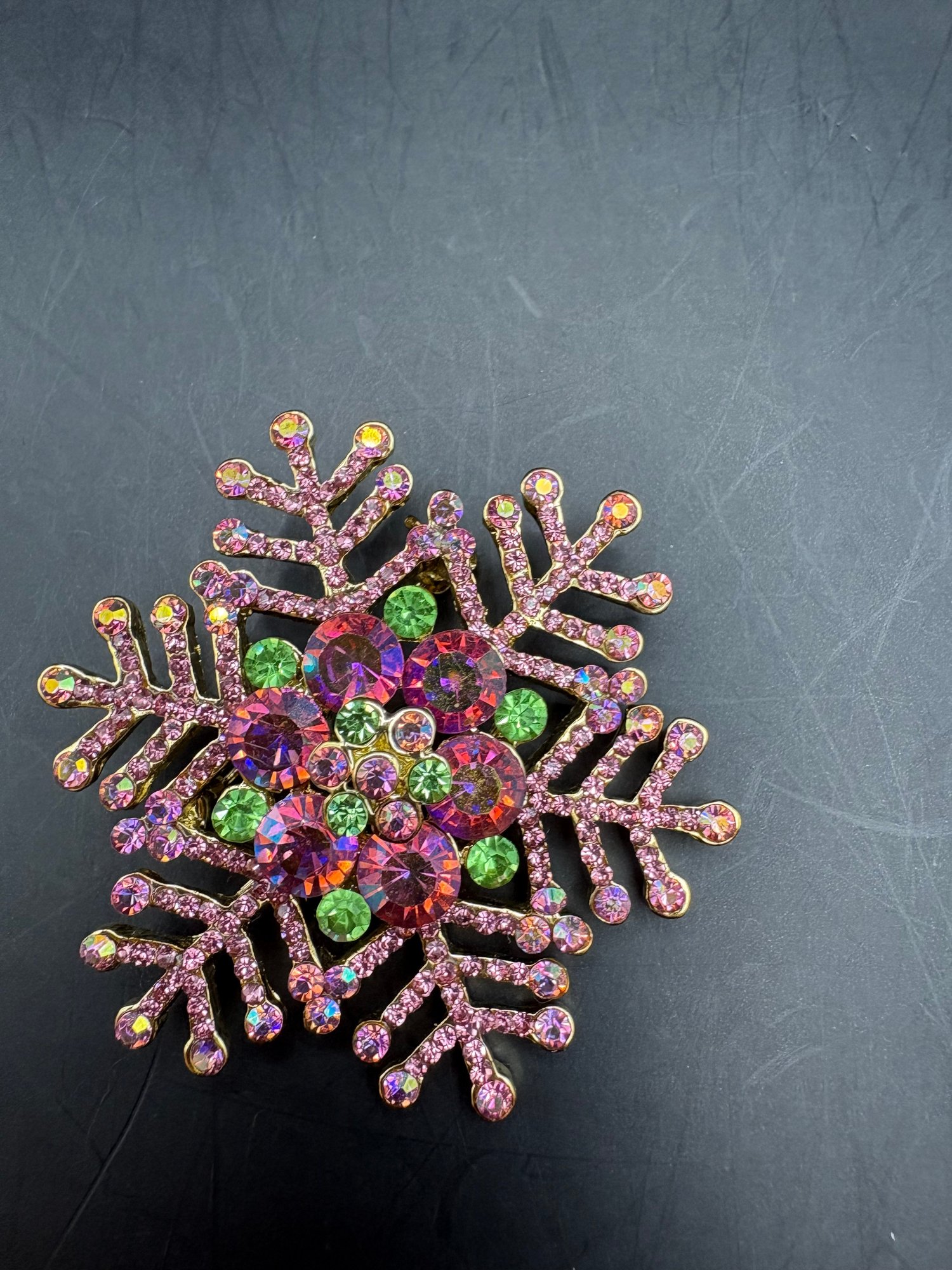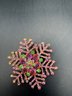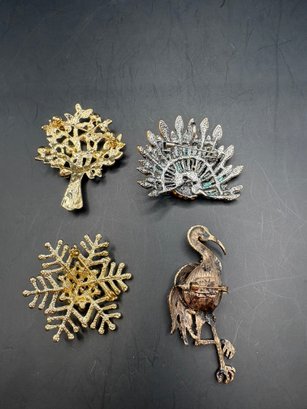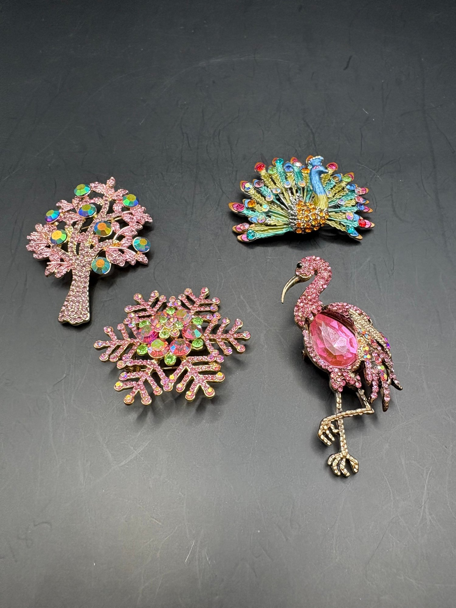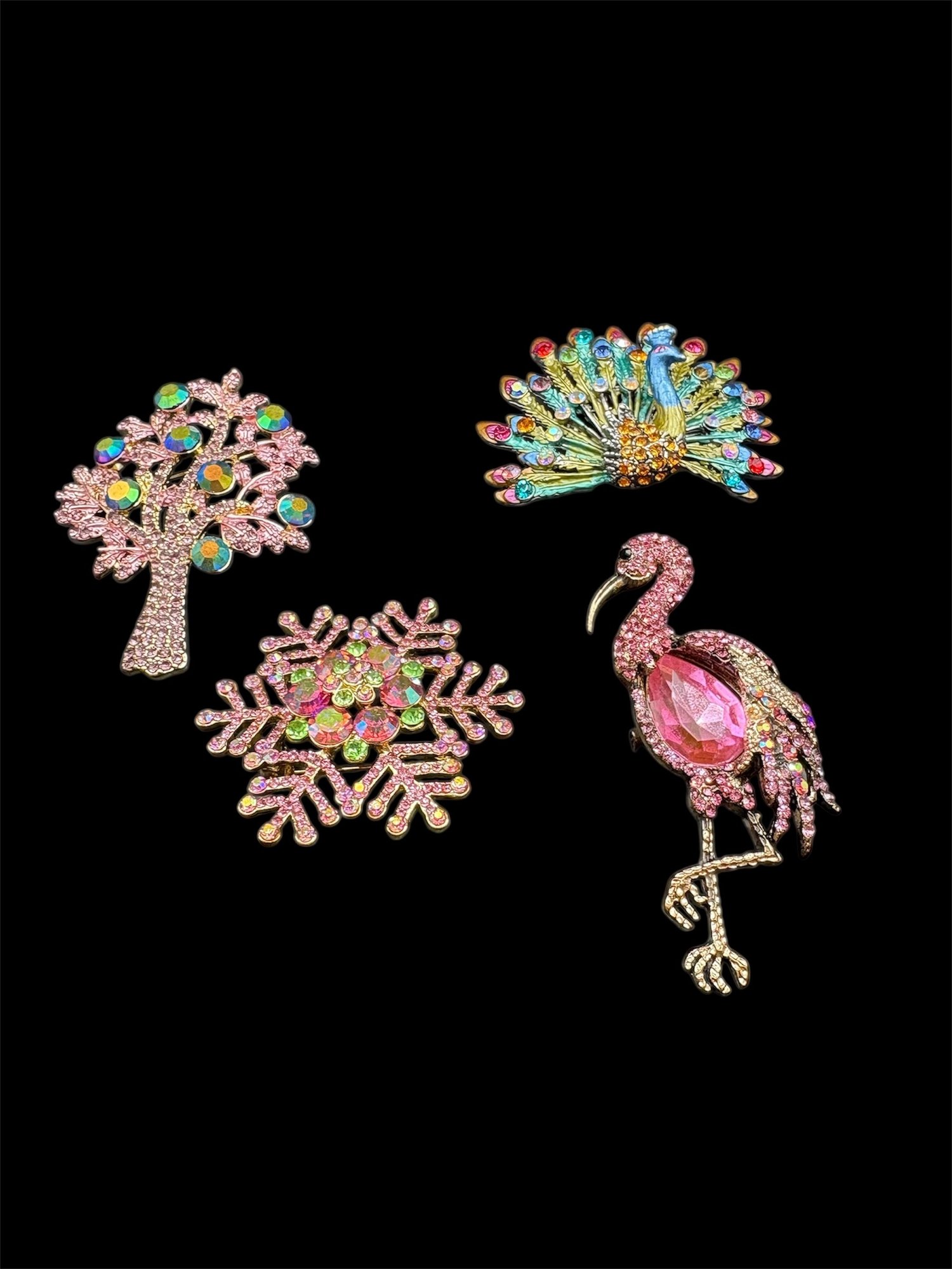 A mix of sparkly brooches or pins there’s four of them peacock, a tree flamingo, and a snowflake all in a pink tones