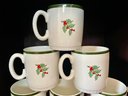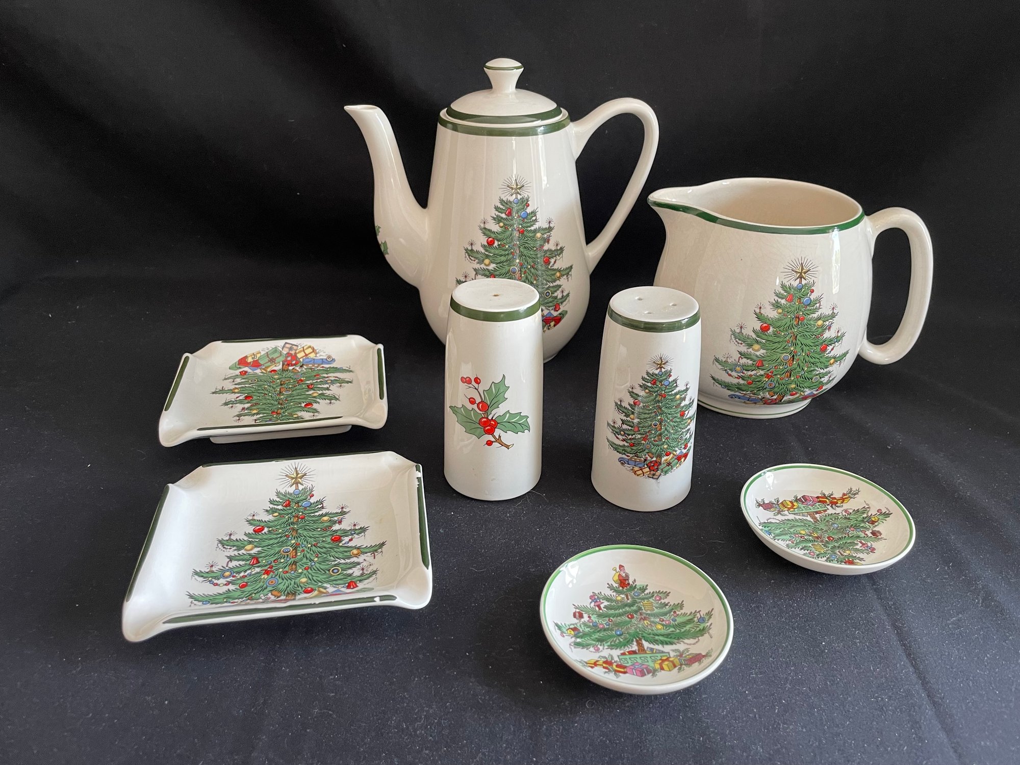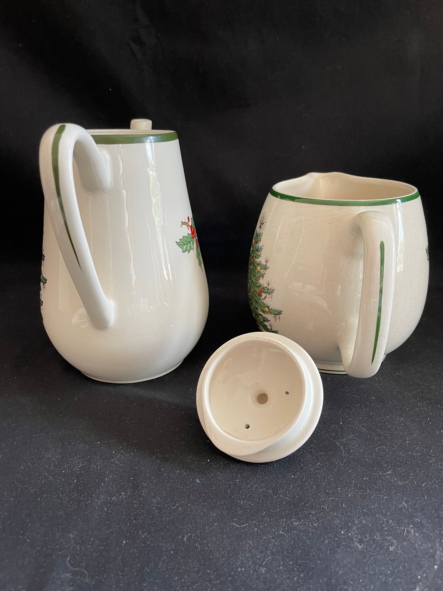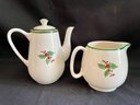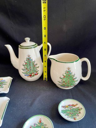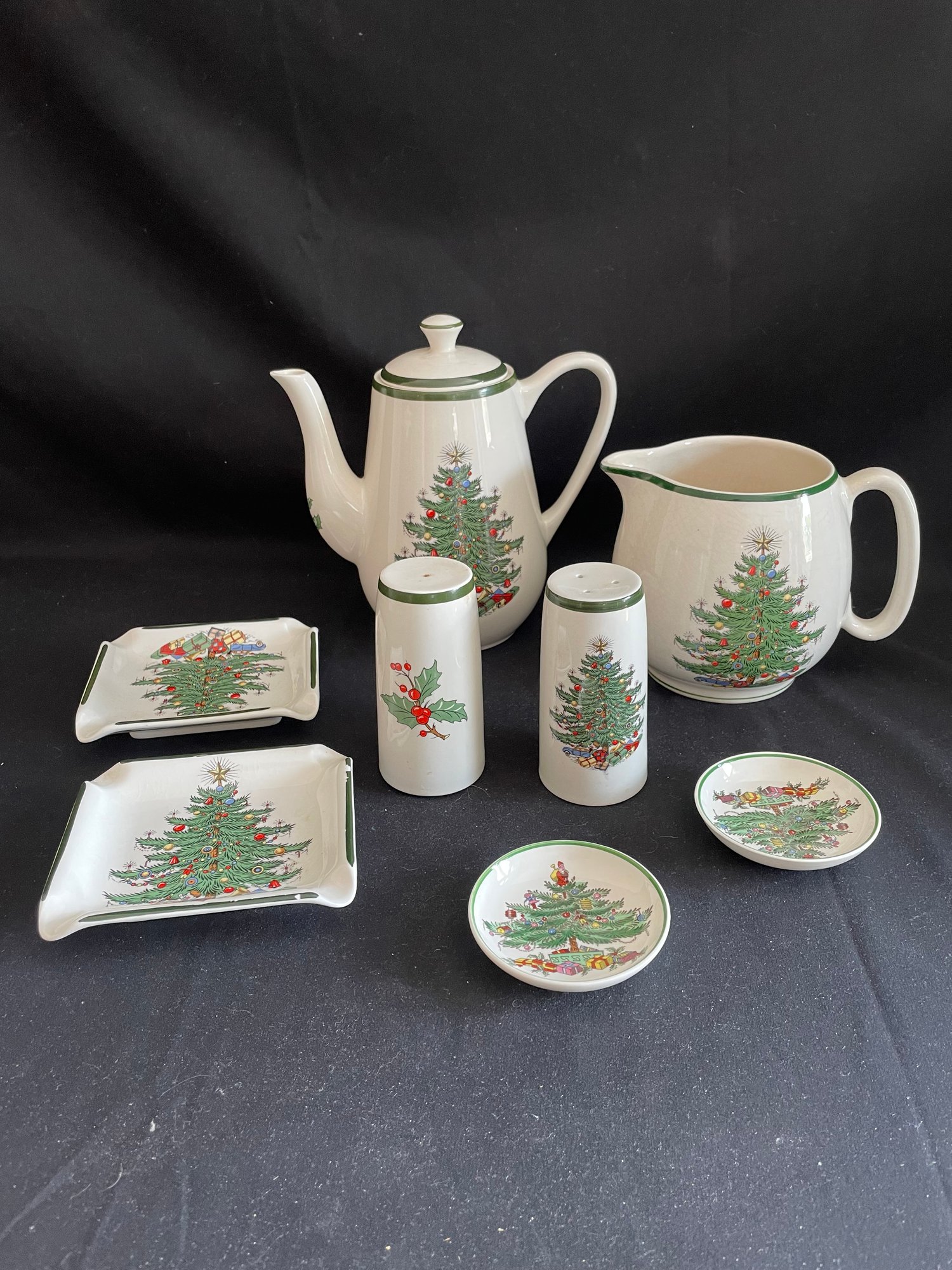 6 coffee/tea cups, coffee pot, pitcher, salt & pepper, 2 square plates, 2 round plates