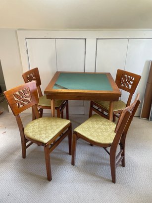 Stakmore expandable maple folding table & 4 chairs, chip on one chair back, some leaf designs on chairs separating see photos