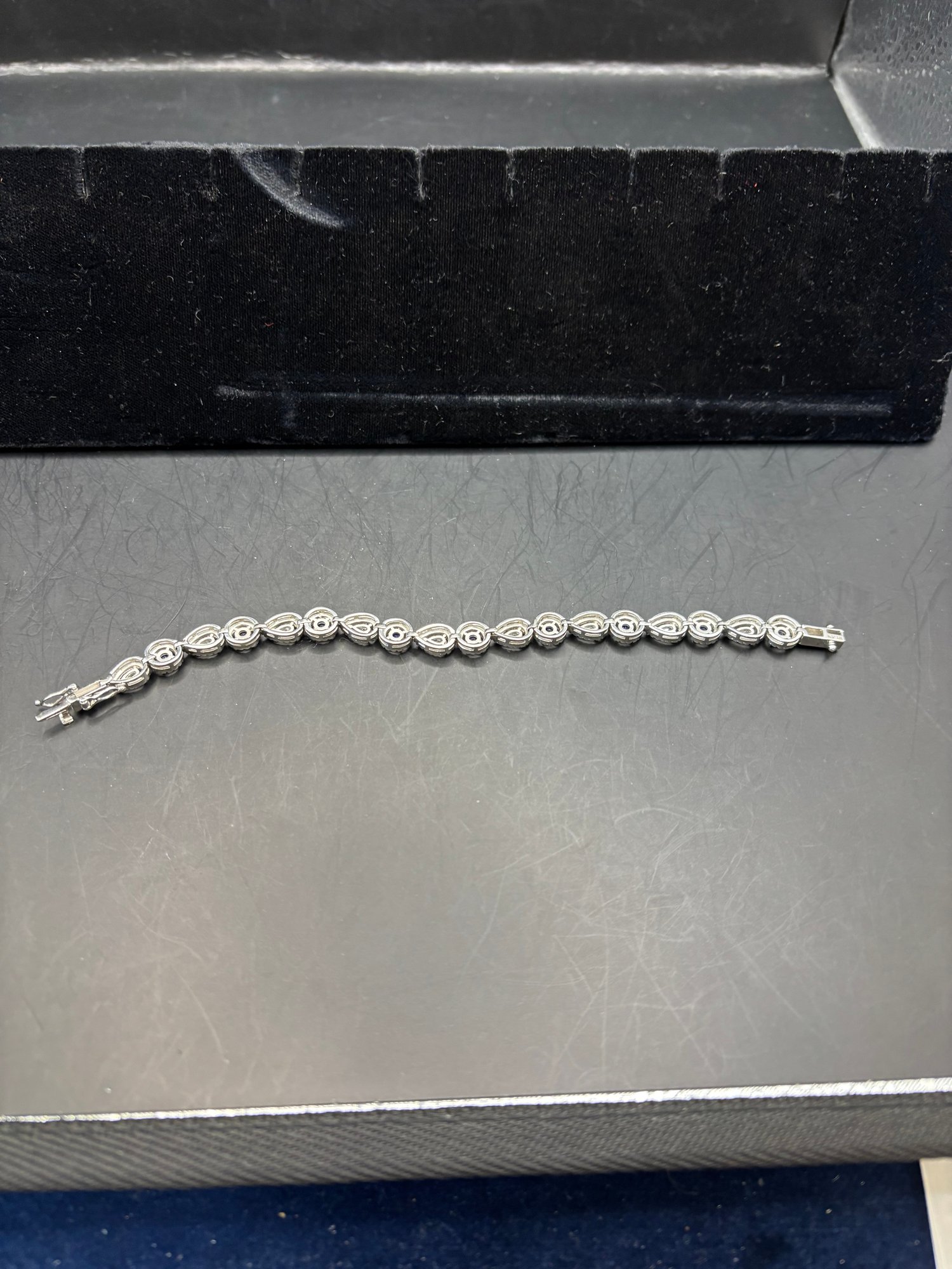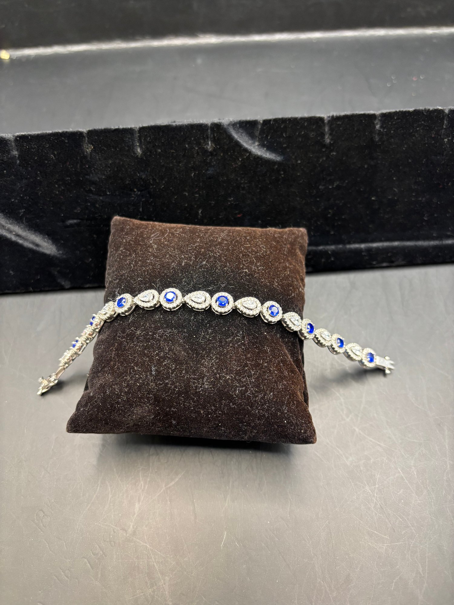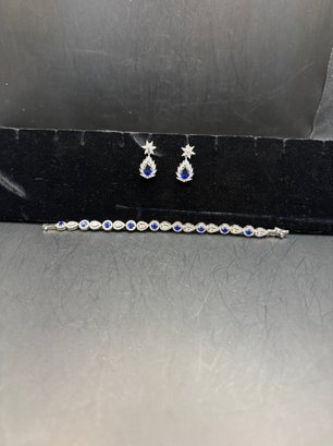 Bracelet is 925 sterling silver with CZ and, most likely, lab created sapphires; * see pics with stone tester and Hallmark
