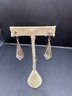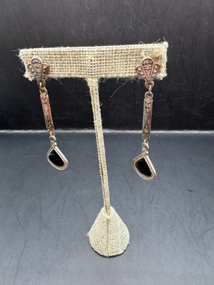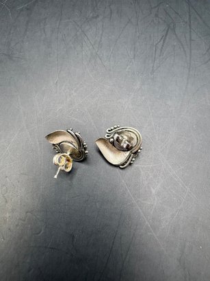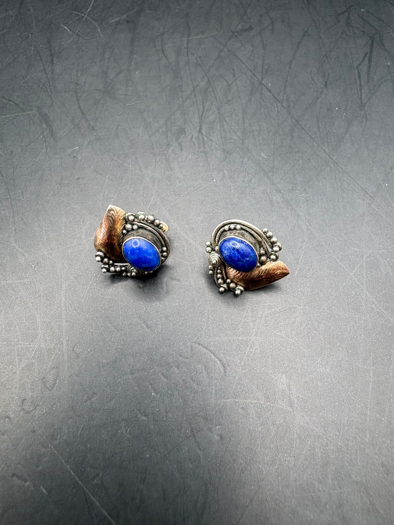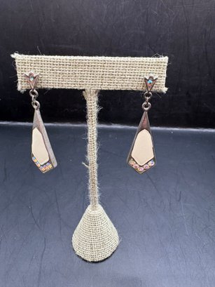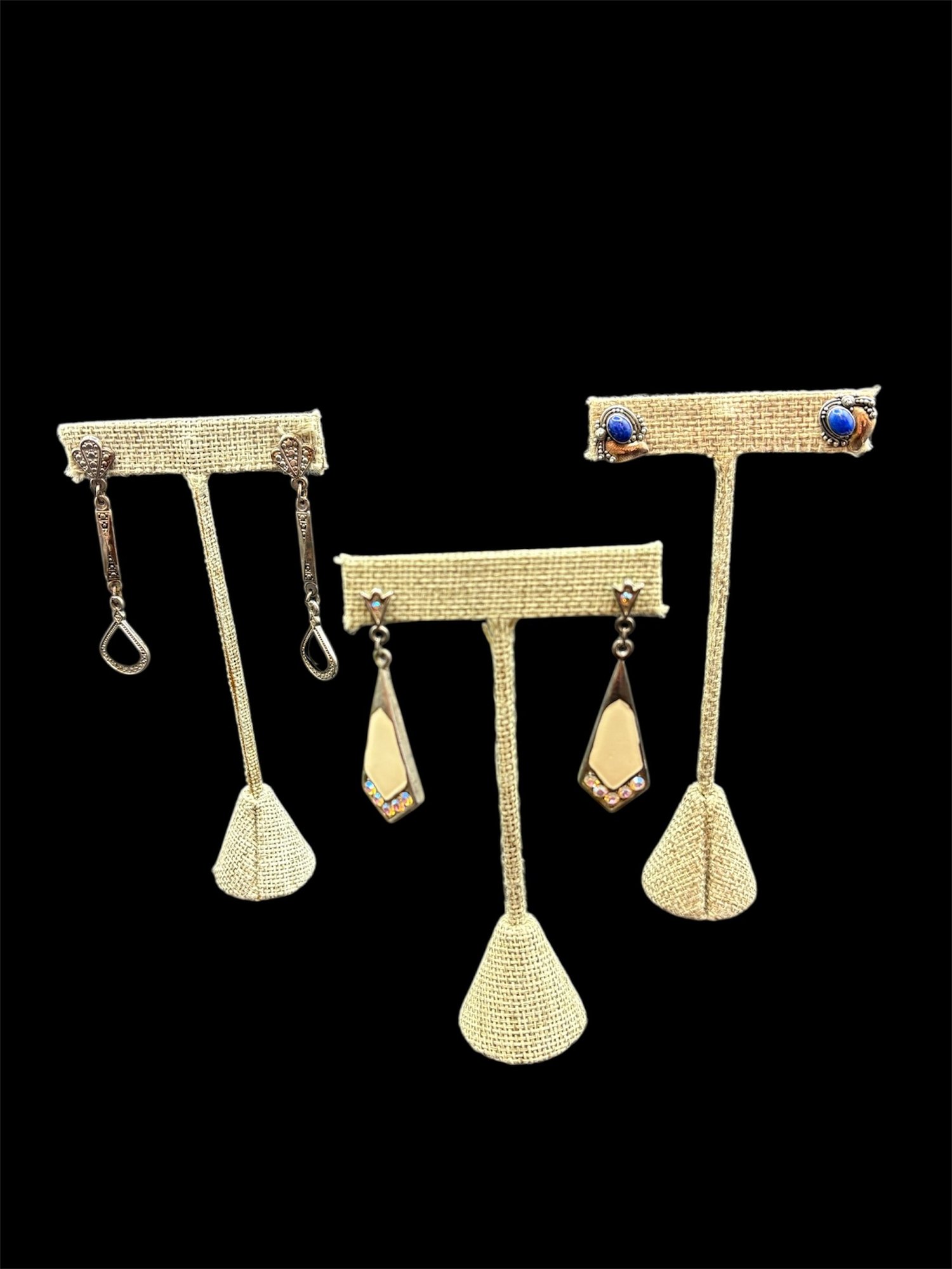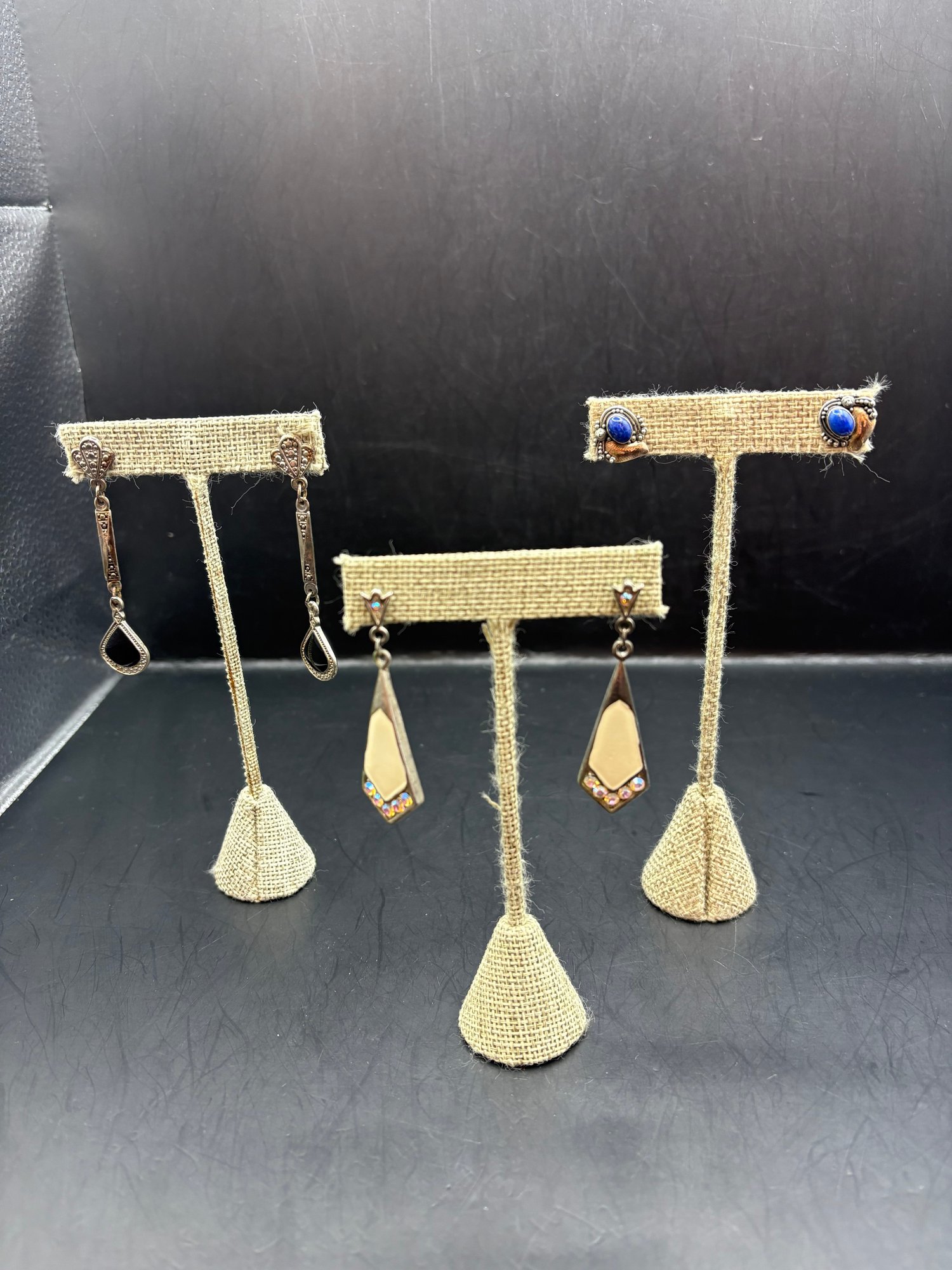Three pairs of earrings one is sterling with lapis blue stones the other two are enamel and rhinestone, silver toned