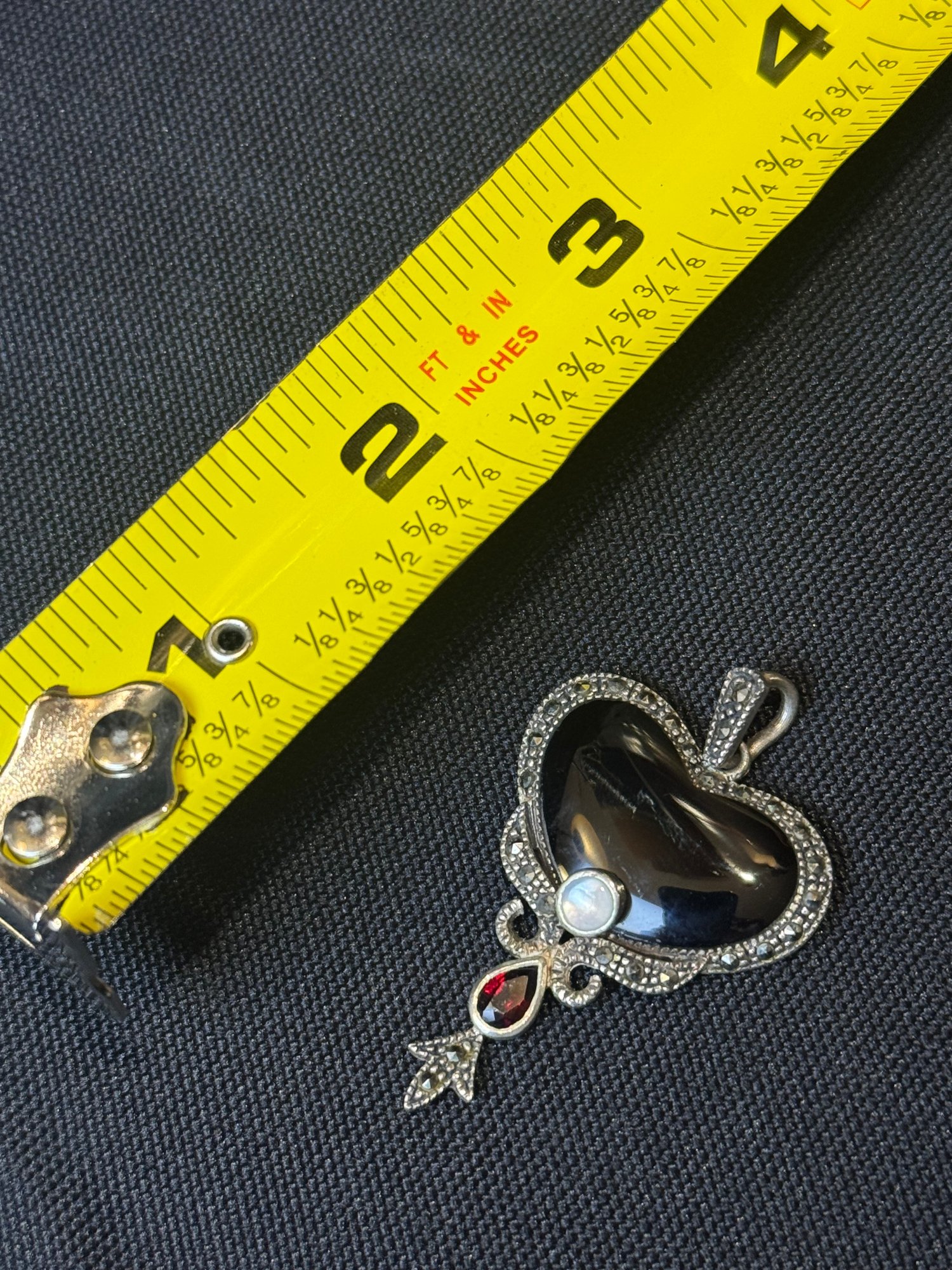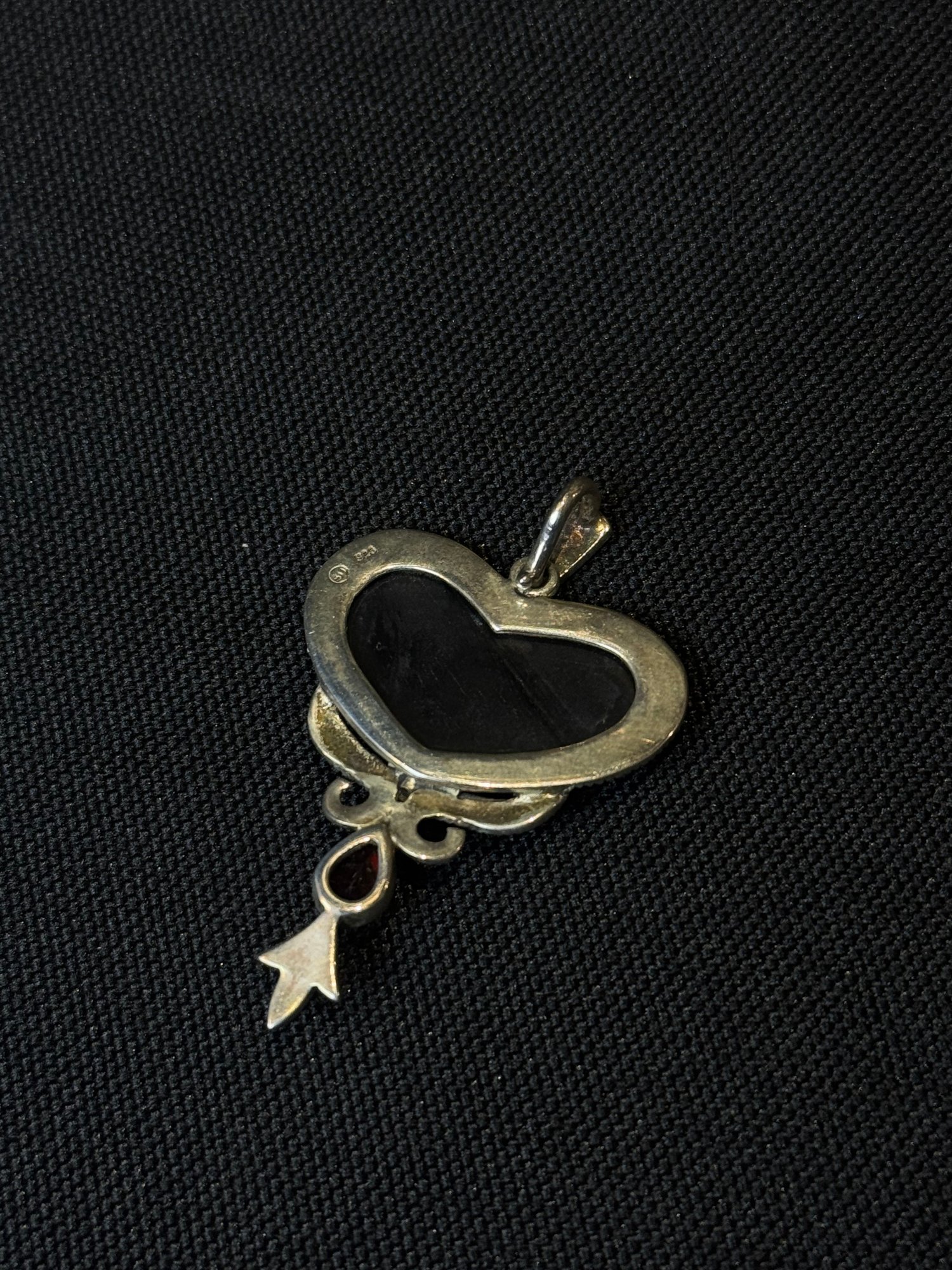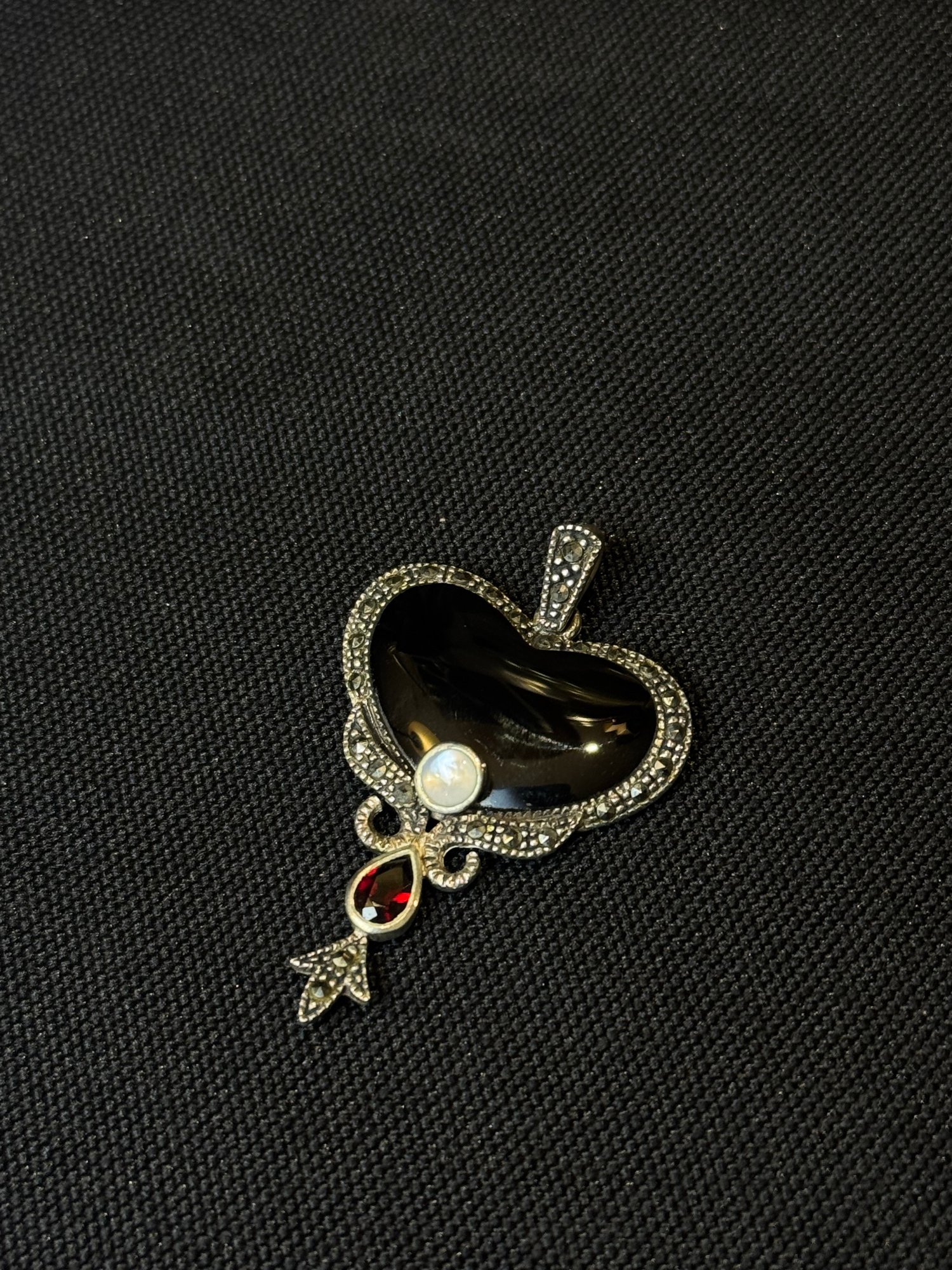 Black onyx heart pendant with mother of pearl, and faceted garnet accent stones. Unique bead detailed bail and bezel.