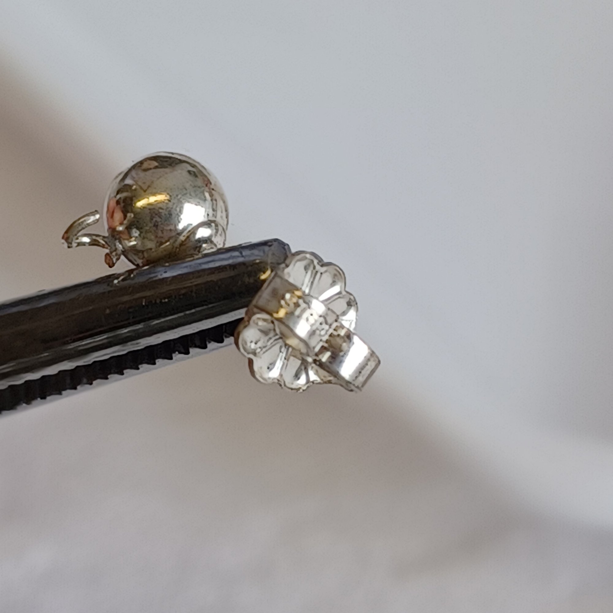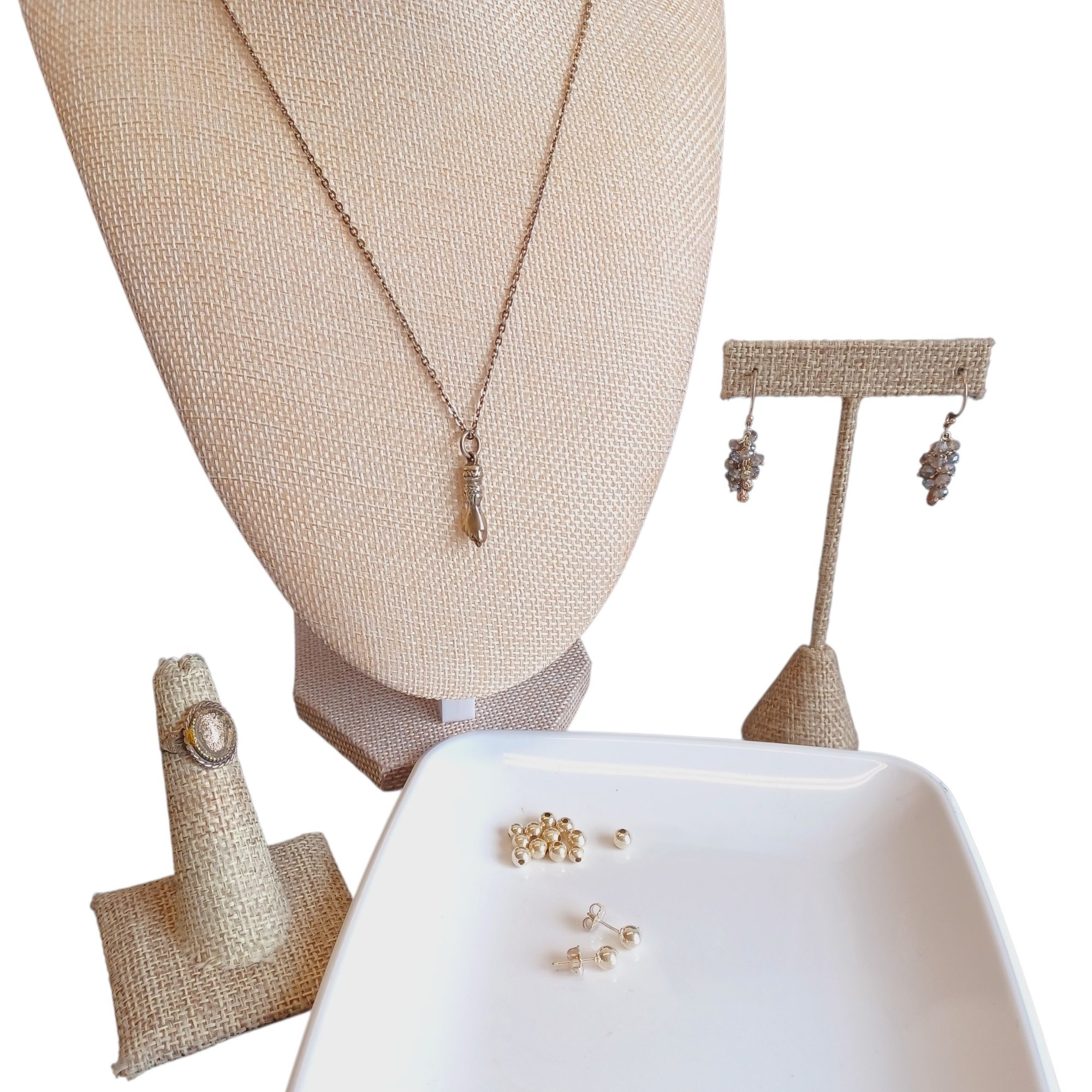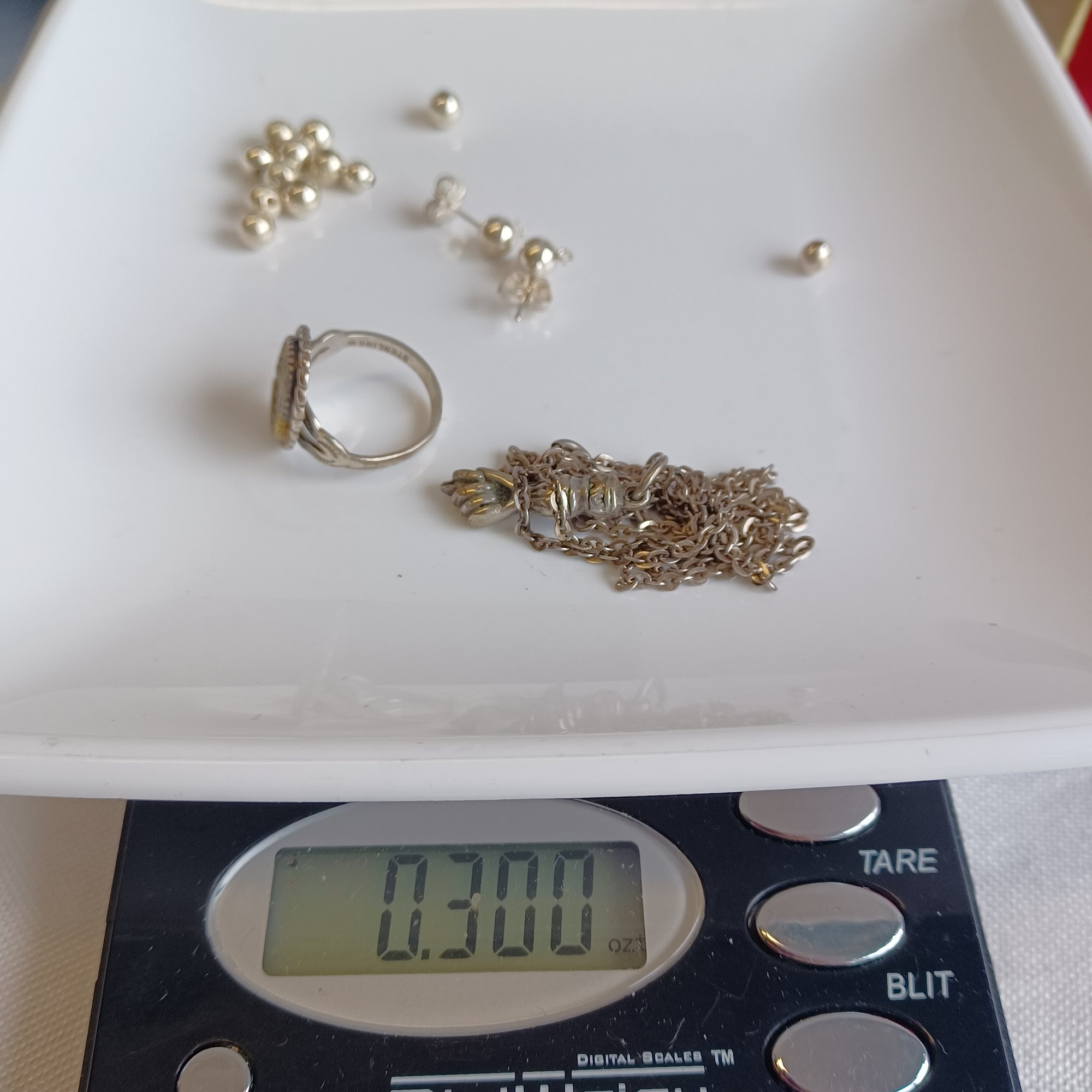 Plate w/ sterling beads and pr of studs *broken loops indicate they had something attached.