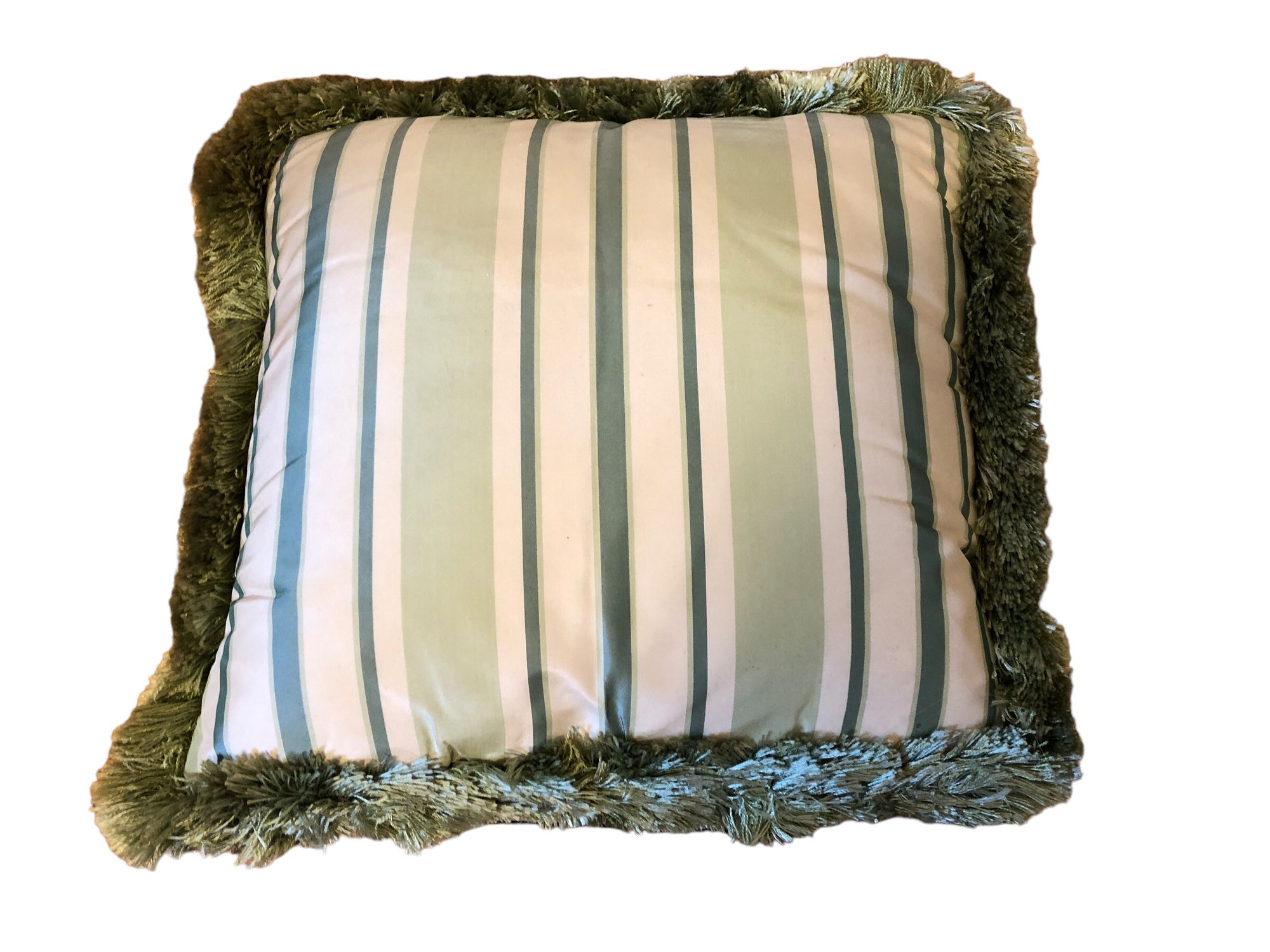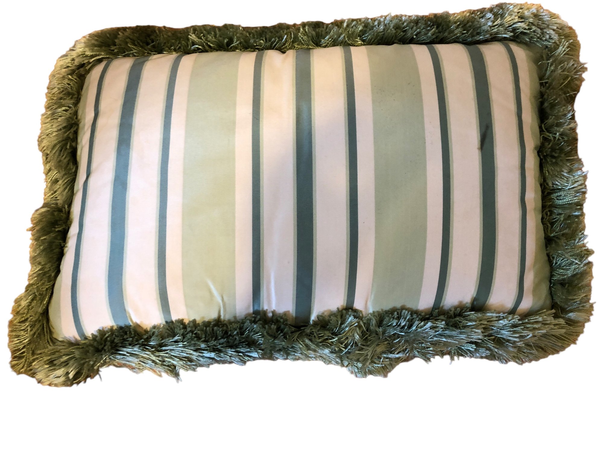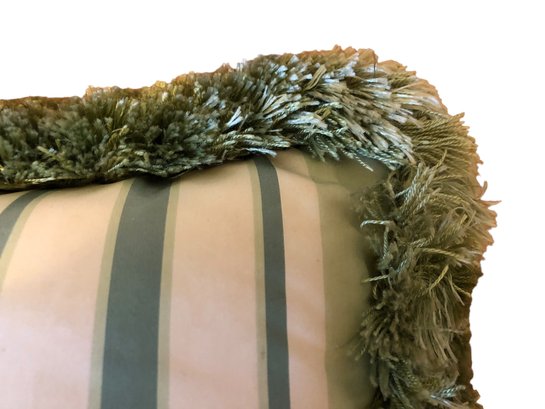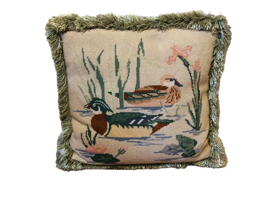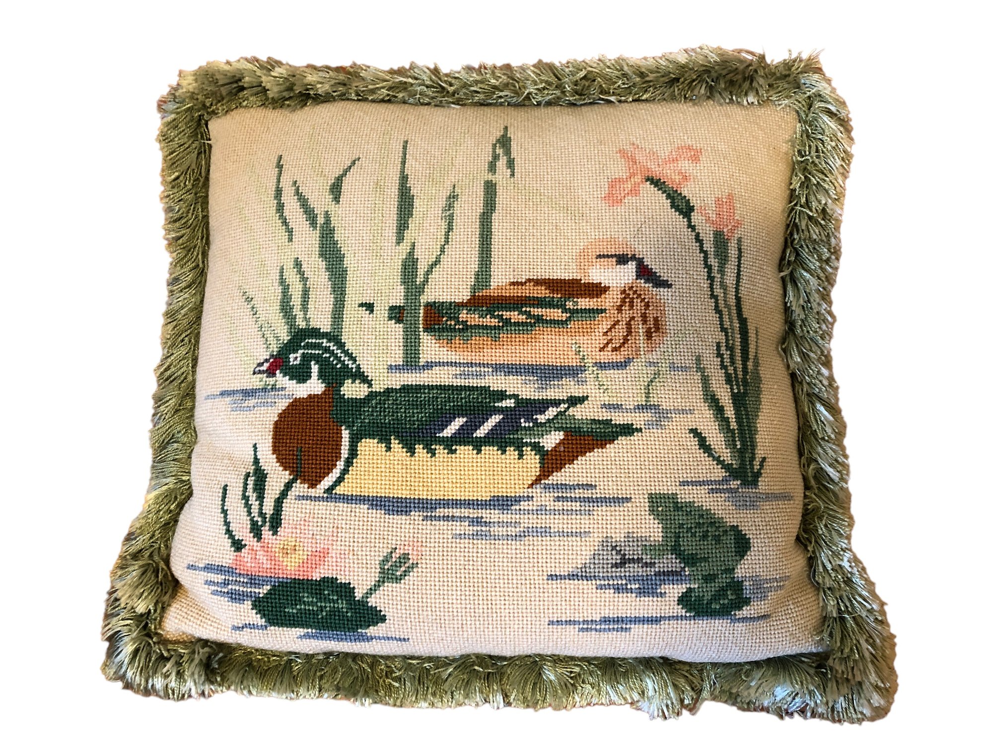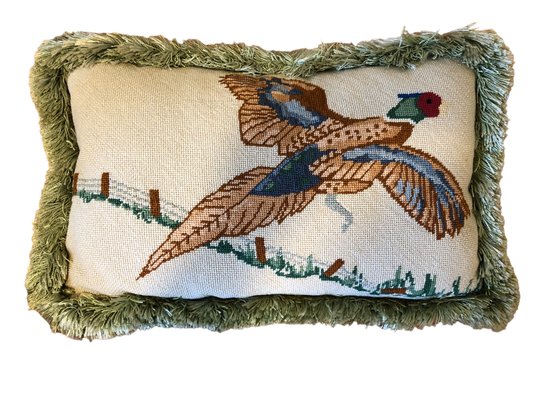 rectangular ring-neck pheasant pillow and accompanying 2 ducks pillow, green fringe on sides and green striped polyester back