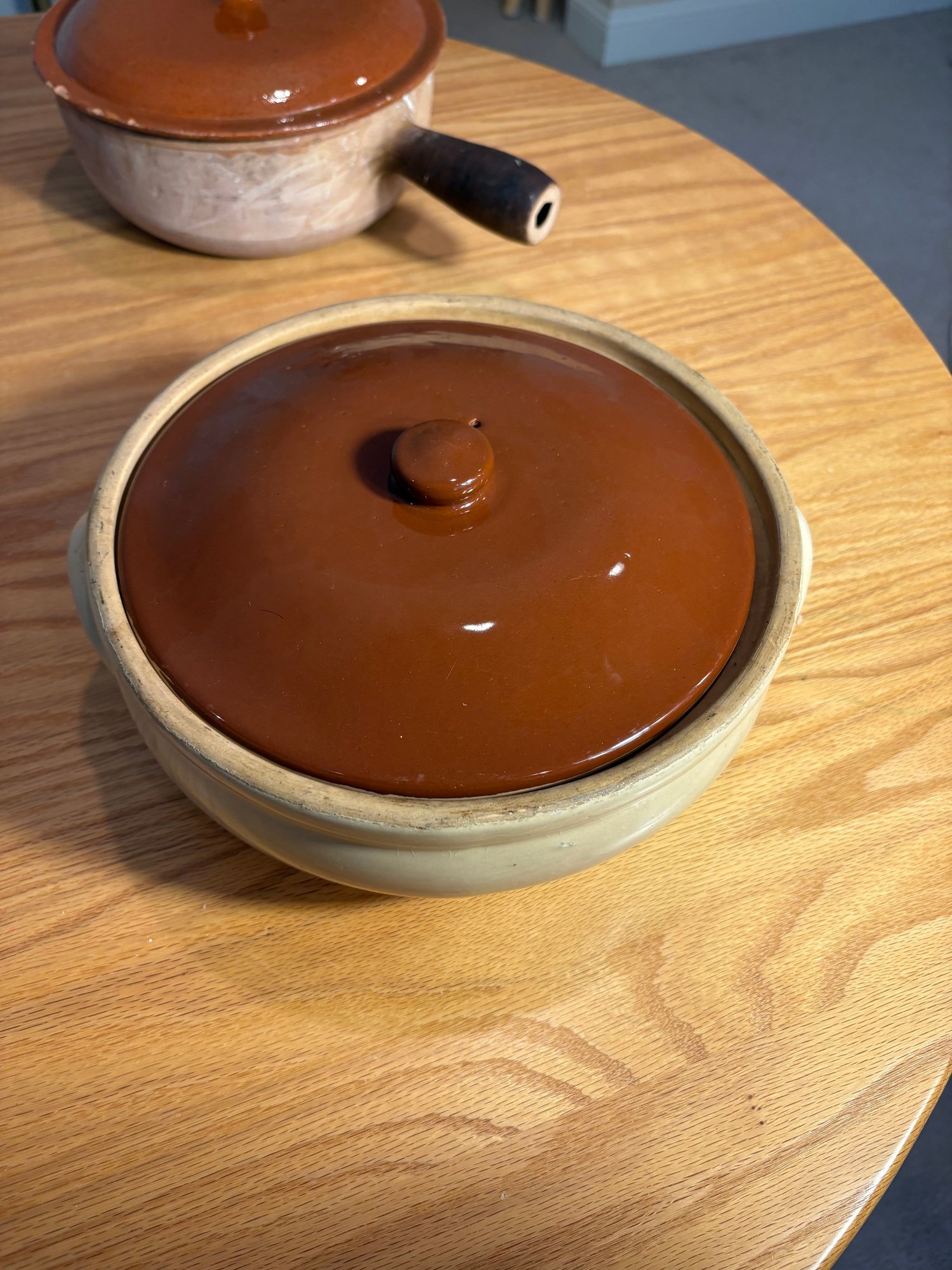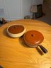 Dimensions casserole dish approximately 4.25 inches tall. Diameter approximately 10.25 inches. Bean pot dimensions approximately 3.75 inches tall. Approximately 9 inches in diameter.