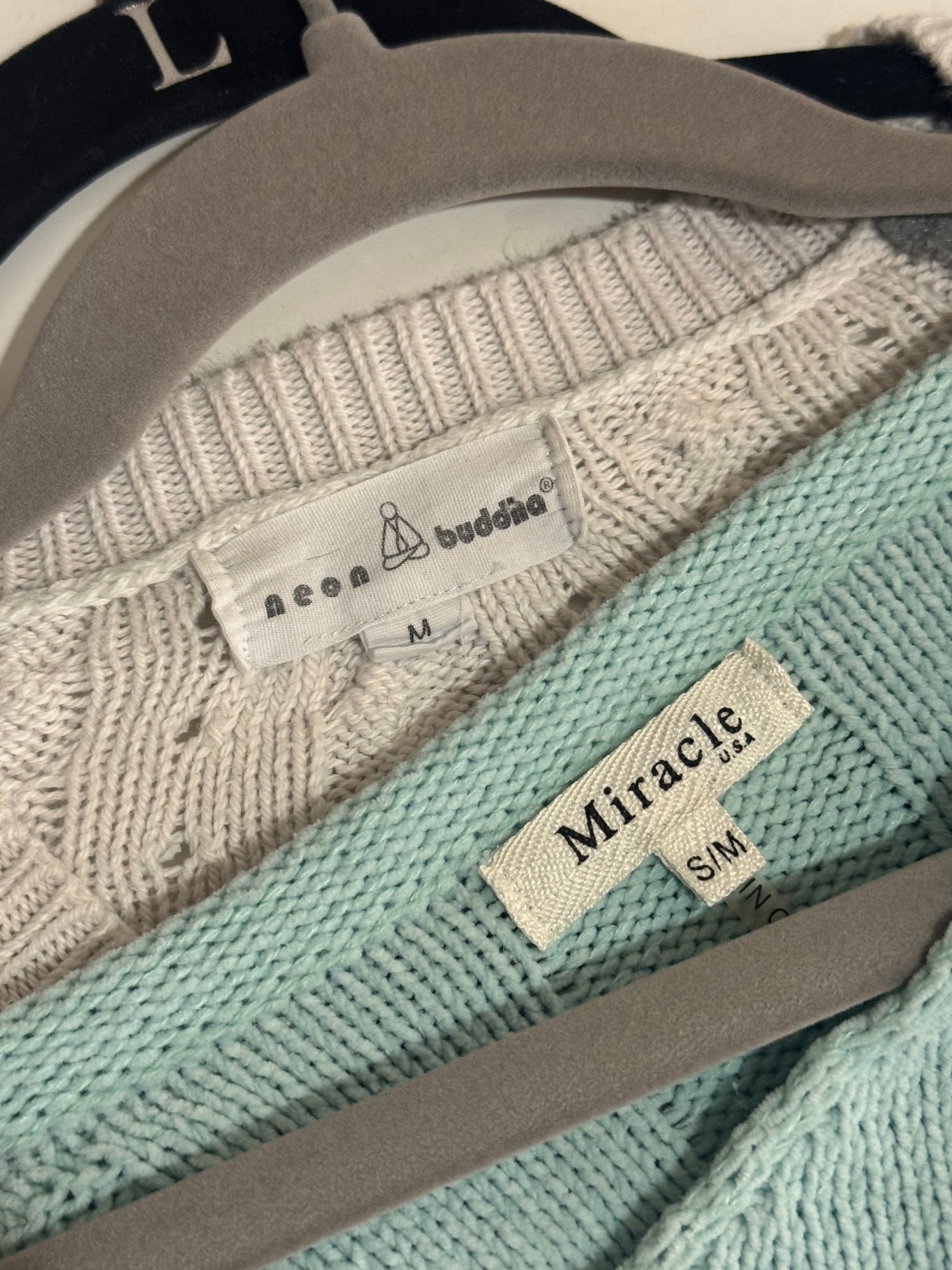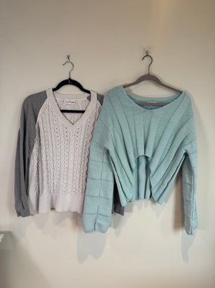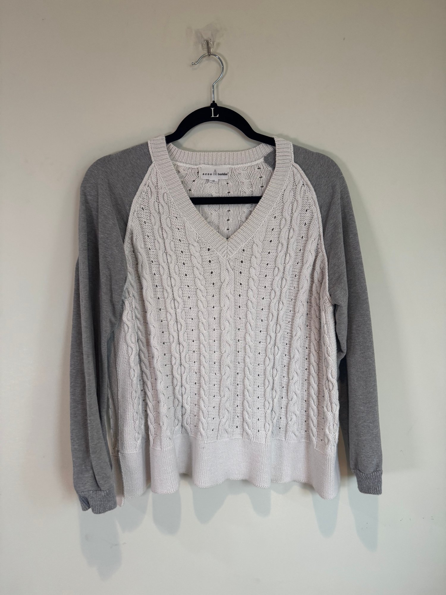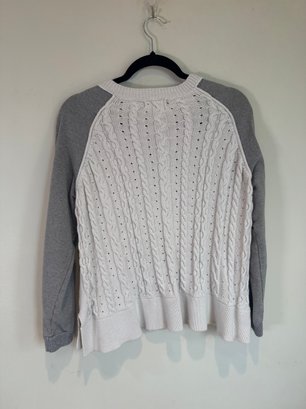 Style: White cable knit sweater with gray sleeves