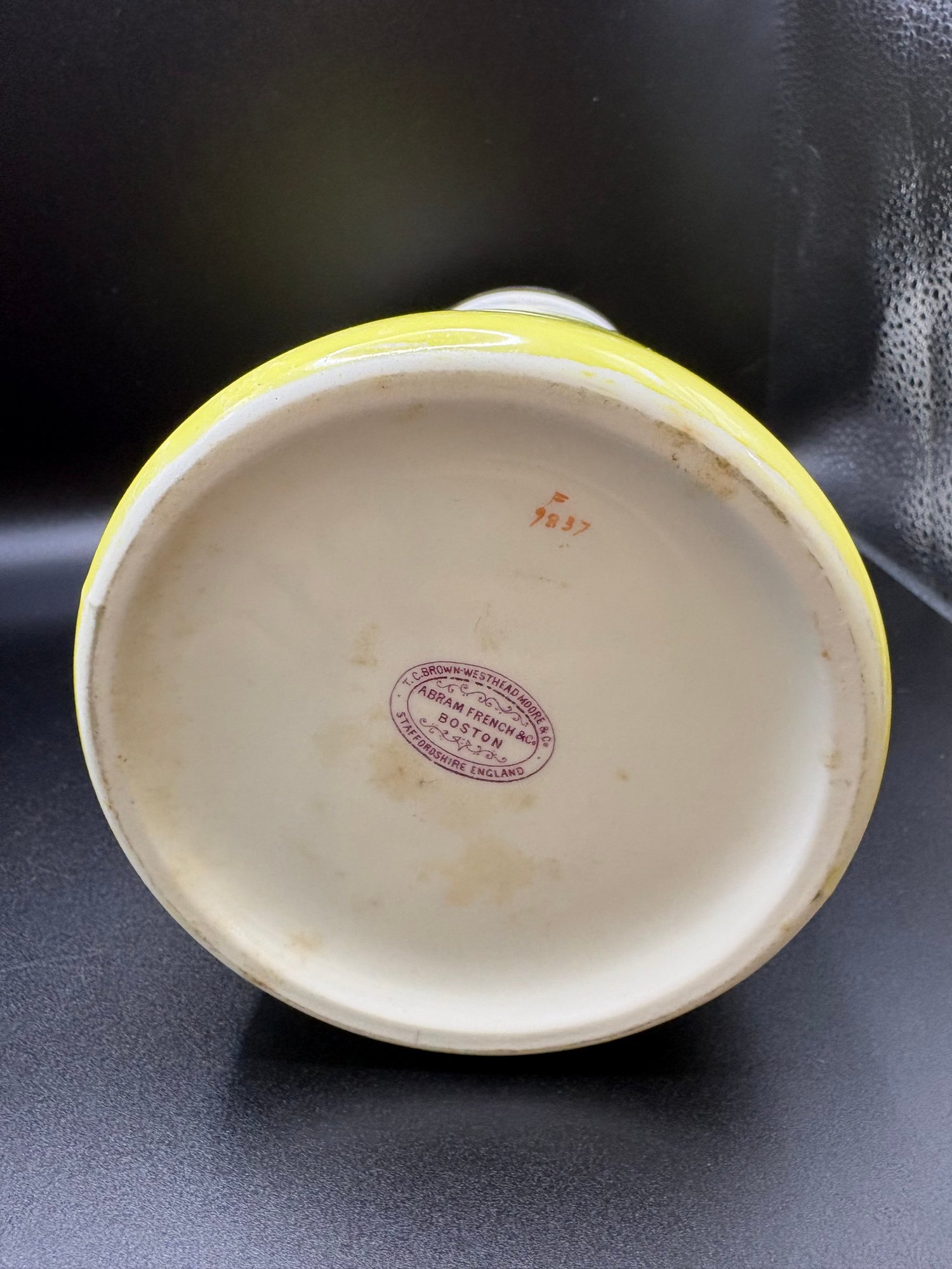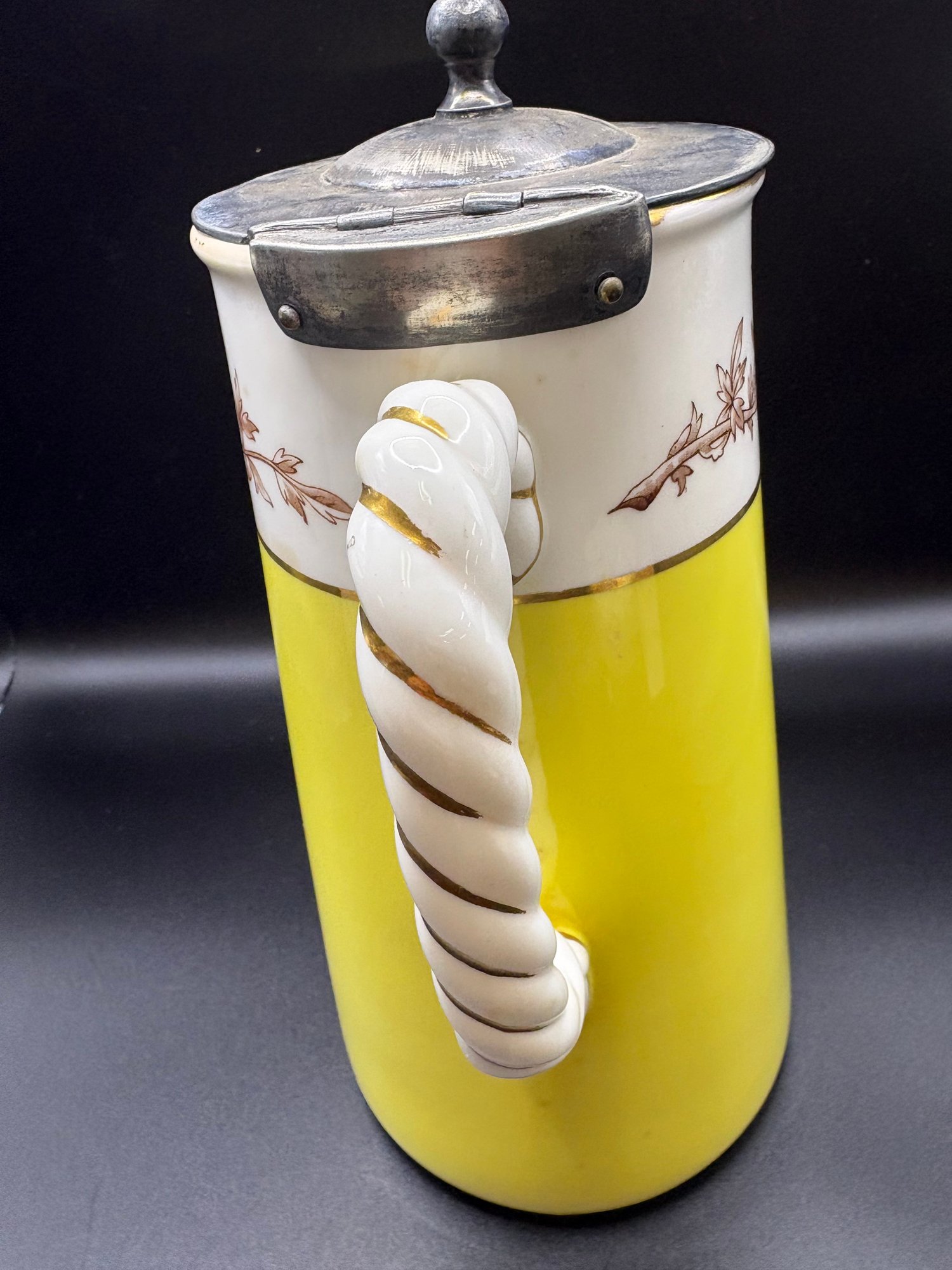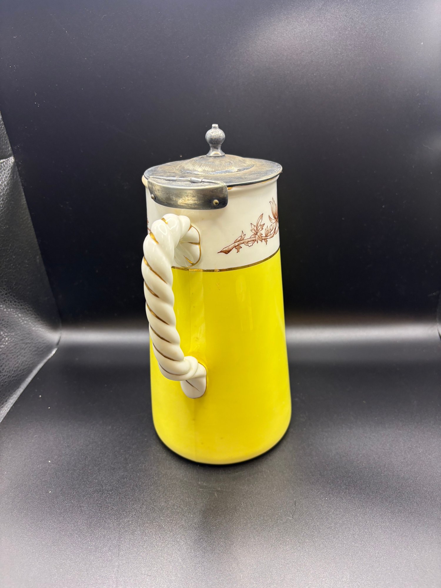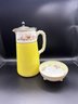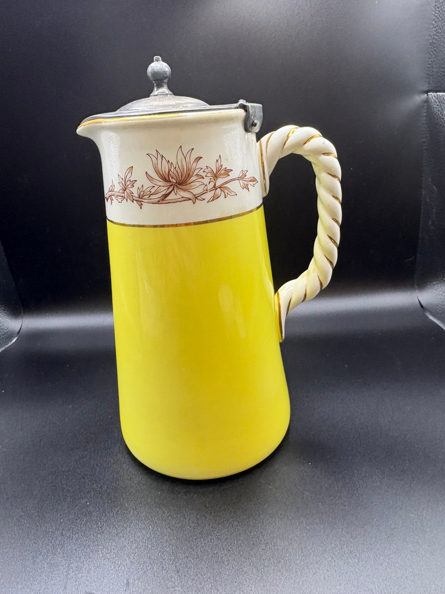 The yellow ceramic pitcher has a pewter top and it is broken. See pictures. It’s 8 inches high by 15 including the handle it’s by Abram French and Co. Boston mass and the other one is a footed hand painted nippon porcelain bowl it’s 4 1/2“ x 2 1/2 inches.