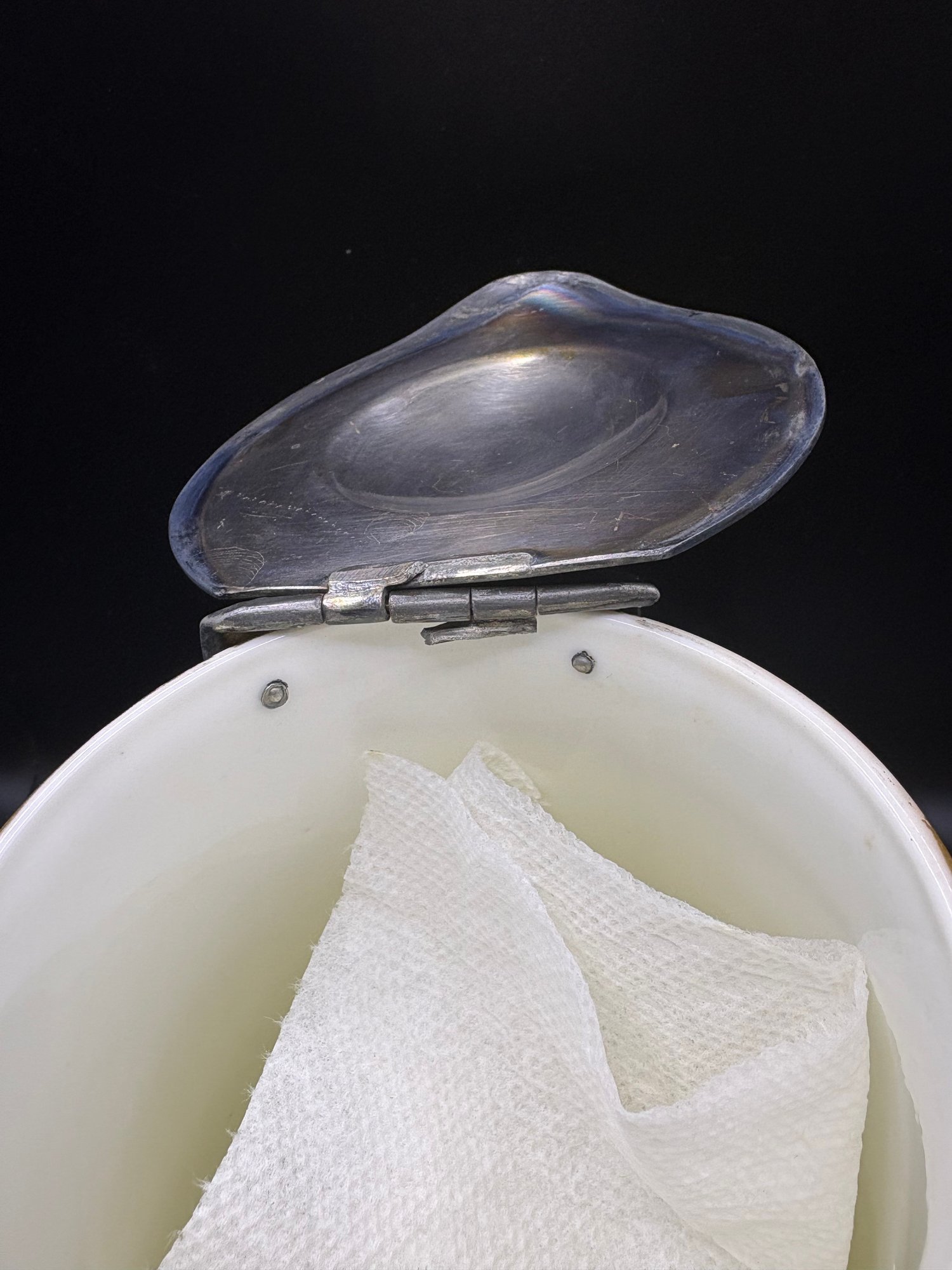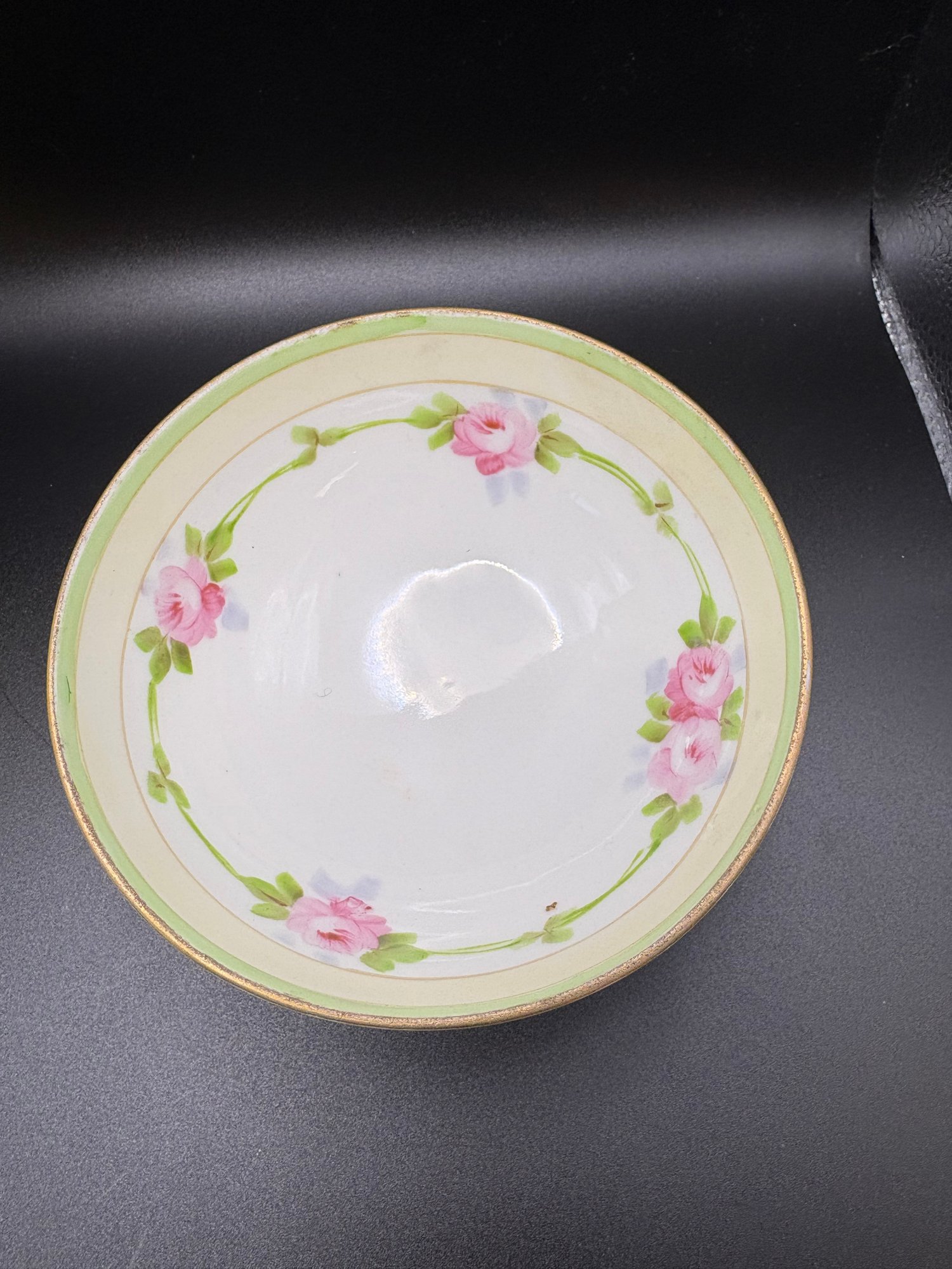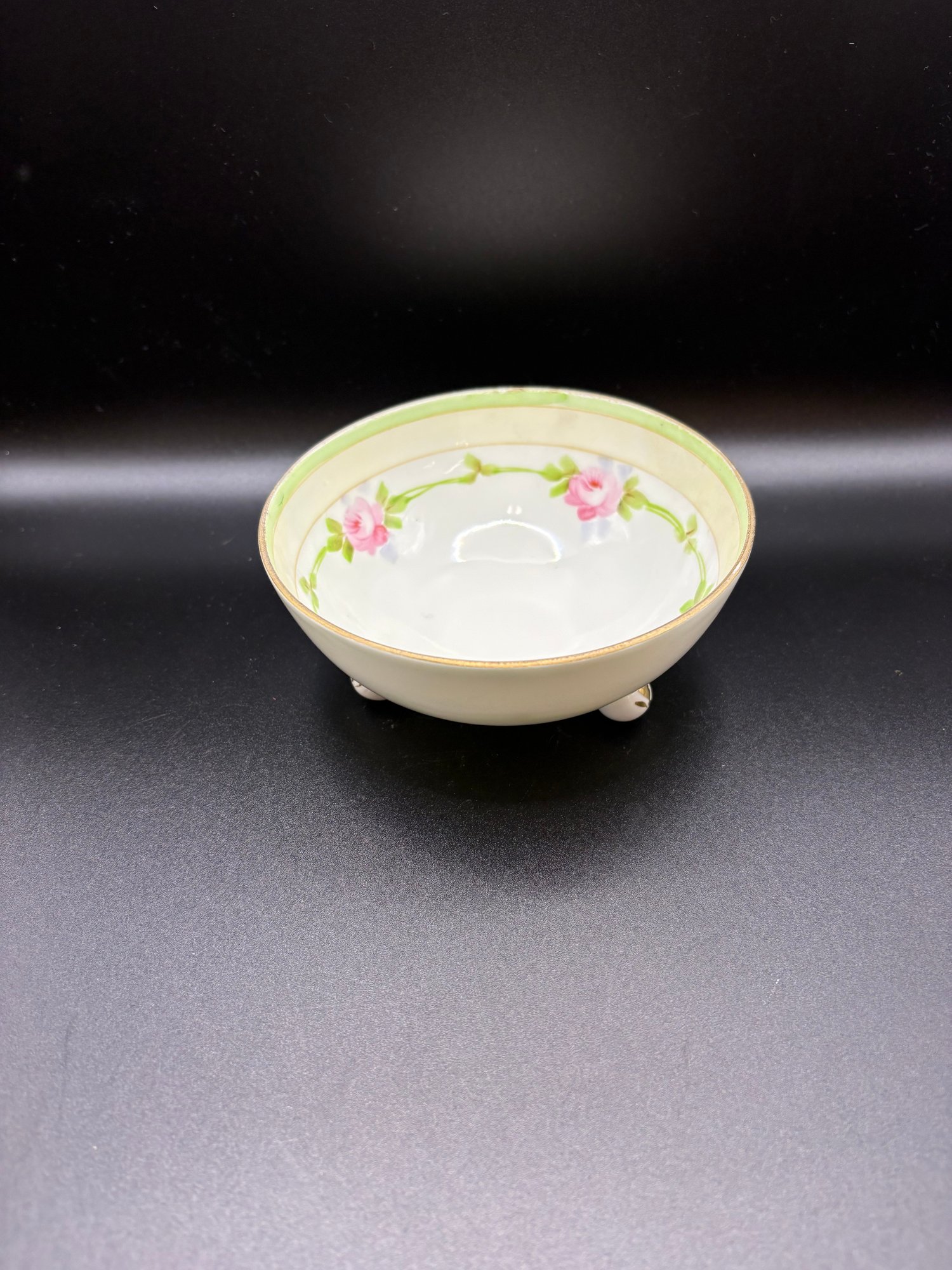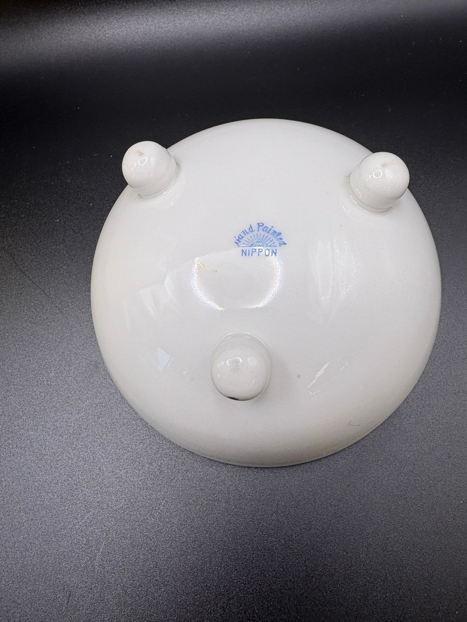 The yellow ceramic pitcher has a pewter top and it is broken. See pictures. It’s 8 inches high by 15 including the handle it’s by Abram French and Co. Boston mass and the other one is a footed hand painted nippon porcelain bowl it’s 4 1/2“ x 2 1/2 inches.