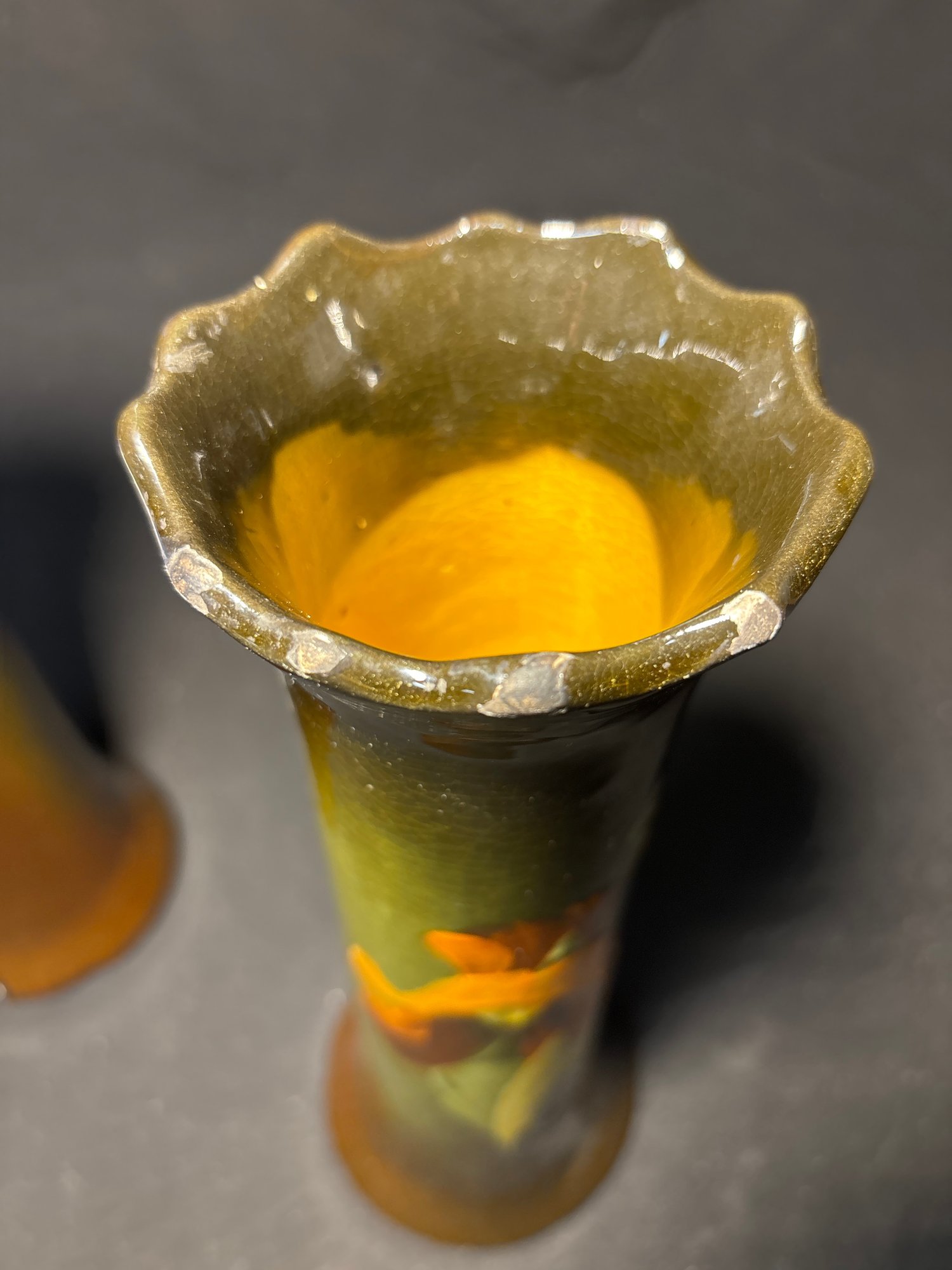 Notes: One vase has a repaired crack on top, damage to bottom of vase. Both have chips (see photos)
