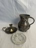 Raimond silver plate candlestick, silver plate pitcher, cut glass ashtray